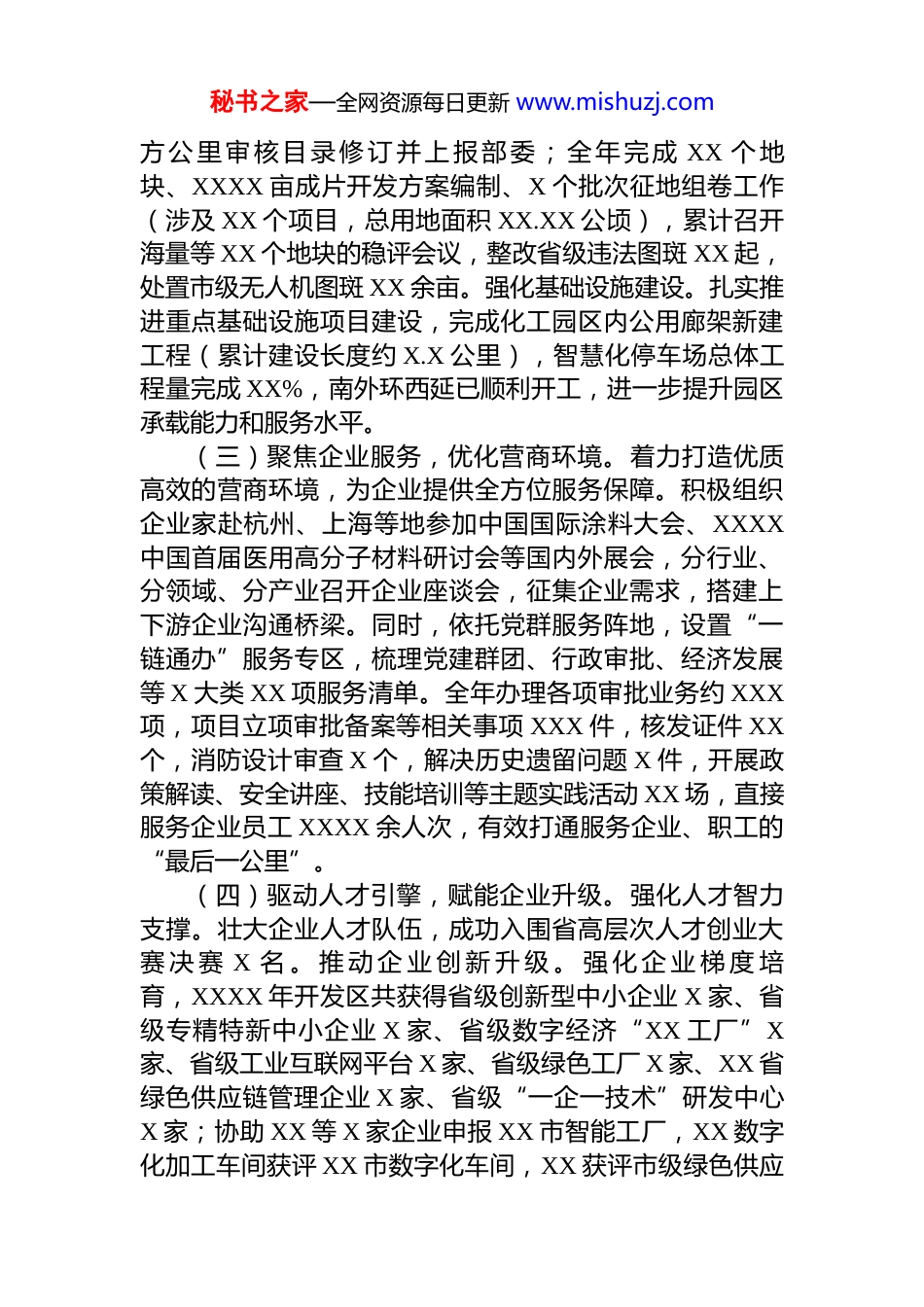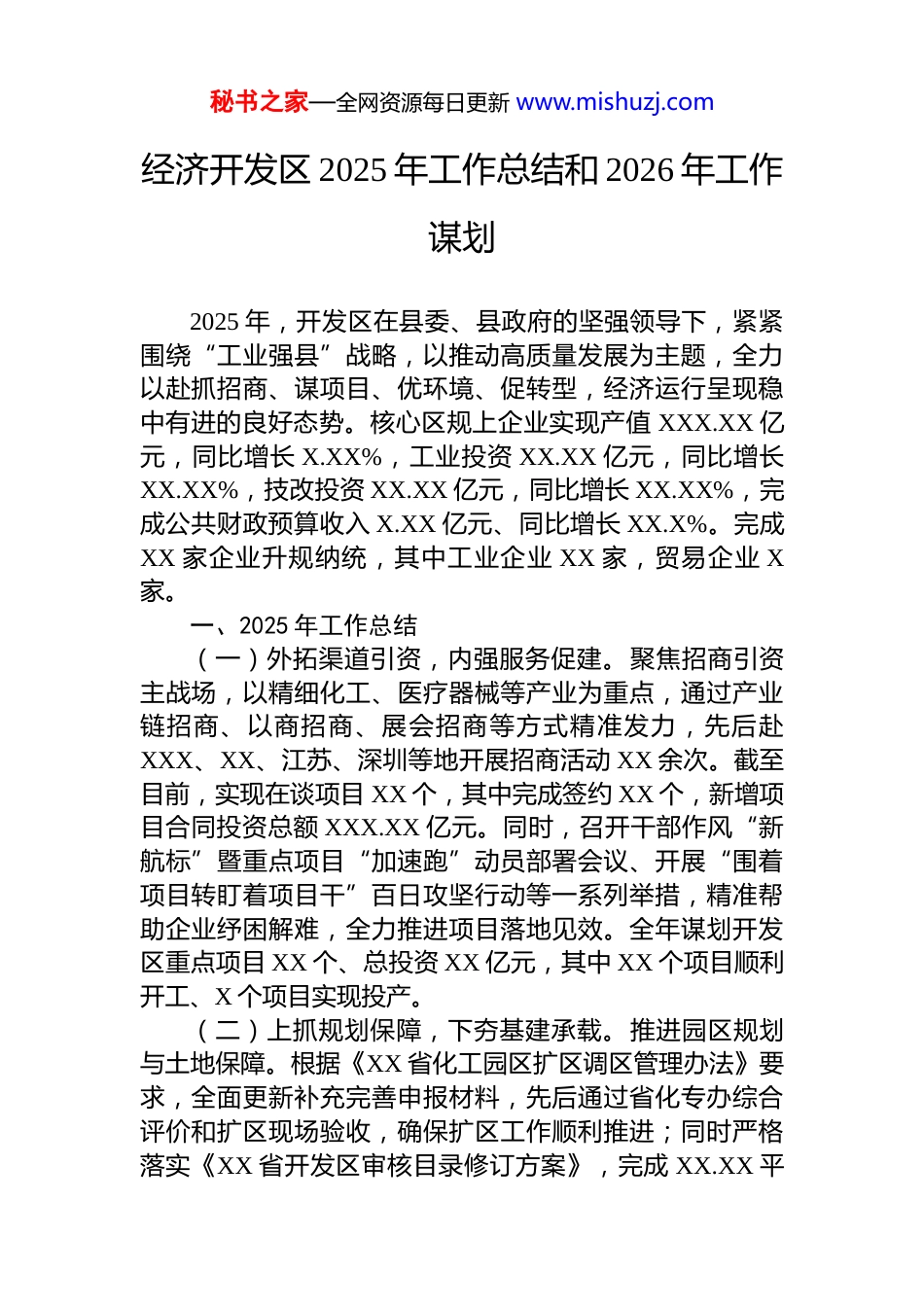 秘书之家—全网资源每日更新 www.mishuzj.com经济开发区 2025 年工作总结和 2026 年工作谋划2025 年,开发区在县委、县政府的坚强领导下,紧紧围绕“工业强县”战略,以推动高质量发展为主题,全力以赴抓招商、谋项目、优环境、促转型,经济运行呈现稳中有进的良好态势。核心区规上企业实现产值 XXX.XX 亿元,同比增长 X.XX%,工业投资 XX.XX 亿元,同比增长XX.XX%,技改投资 XX.XX 亿元,同比增长 XX.XX%,完成公共财政预算收入 X.XX 亿元、同比增长 XX.X%。完成XX 家企业升规纳统,其中工业企业 XX 家,贸易企业 X家。一、2025 年工作总结(一)外拓渠道引资,内强服务促建。聚焦招商引资主战场,以精细化工、医疗器械等产业为重点,通过产业链招商、以商招商、展会招商等方式精准发力,先后赴XXX、XX、江苏、深圳等地开展招商活动 XX 余次。截至目前,实现在谈项目 XX 个,其中完成签约 XX 个,新增项目合同投资总额 XXX.XX 亿元。同时,召开干部作风“新航标”暨重点项目“加速跑”动员部署会议、开展“围着项目转盯着项目干”百日攻坚行动等一系列举措,精准帮助企业纾困解难,全力推进项目落地见效。全年谋划开发区重点项目 XX 个、总投资 XX 亿元,其中 XX 个项目顺利开工、X 个项目实现投产。(二)上抓规划保障,下夯基建承载。推进园区规划与土地保障。根据《XX 省化工园区扩区调区管理办法》要求,全面更新补充完善申报材料,先后通过省化专办综合评价和扩区现场验收,确保扩区工作顺利推进;同时严格落实《XX 省开发区审核目录修订方案》,完成 XX.XX 平秘书之家—全网资源每日更新 www.mishuzj.com方公里审核目录修订 并上报部委;全年完成 XX 个地块、XXXX 亩成片开发方案编制、X 个批次征地组卷工作(涉及 XX 个项目,总用地面积 XX.XX 公顷),累计召开海量等 XX 个地块的稳评会议,整改省级违法图斑 XX 起,处置市级无人机图斑 XX 余亩。强化基础设施建设。扎实推进重点基础设施项目建设,完成化工园区内公用廊架新建工程(累计建设长度约 X.X 公里),智慧化停车场总体工程量完成 XX%,南外环西延已顺利开工,进一步提升园区承载能力和服务水平。(三)聚焦企业服务,优化营商环境。着力打造优质高效的营商环境,为企业提供全方位服务保障。积极组织企业家赴杭州、上海等地参加中国国际涂料大会、XXXX中国首届医用高分子材料研讨会等国内外展会,分行业、分领域、分产业召开企业座谈会,征集企业需求,搭建上下游企业沟通桥梁。同时,依托党群服务阵地,设置“一链通办”服务专区,梳理党建群团、行政审批、经济发展等 X 大类 XX 项服务清单。全年办理各项审批业务约 XXX项,项目立项审批备案等相关事项 XXX 件,核发证件 XX个,消防设计审查 X 个,解决历史遗留问题 X 件,开展政策解读、安全讲座、技能培训等主题实践活动 XX 场,直接服务企业员工 XXXX 余人次,有效打通服务企业、职工的“最后一公里”。(四)驱动人才引擎,赋能企业升级。强化人才智力支撑。壮大企业人才队伍,成功入围省高层次人才创业大赛 决 赛 X 名 。 推 动 企 业 创 新 升 级 。 强 化 企 业 梯 度 培育,XXXX 年开发区共获得省级创新型中小企业 X 家、省级专精特新中小企业 X 家、省级数字经济“XX 工厂”X家、省级工业互联网平台 X 家、省级绿色工厂 X 家、XX 省绿色供应链管理企业 X 家、省级“一企一技术”研发中心X 家;协助 XX 等 X 家企业申报 XX 市智能工厂,XX 数字化加工车间获评 XX 市数字化车间,XX 获评市级绿色供应秘书之家—全网资源每日更新 www.mishuzj.com链管理企业等荣誉。(五)守牢安全底线,优化生态底色。筑牢安全生产防线。强化安全生产监管职能,聘请 X 名专家常驻园区开展日常巡查、专项排查,累计制定针对性隐患整改方案 XX份;严格执行《 XXXX 年郯城经济开发区监督检查计划》,配合省、市、县级监管部门开展联合检查,全年累计检查企业超 XXX 家次,下达检查文书 XXX 份,排查各类安全隐患 XXXX 条,组织安全...