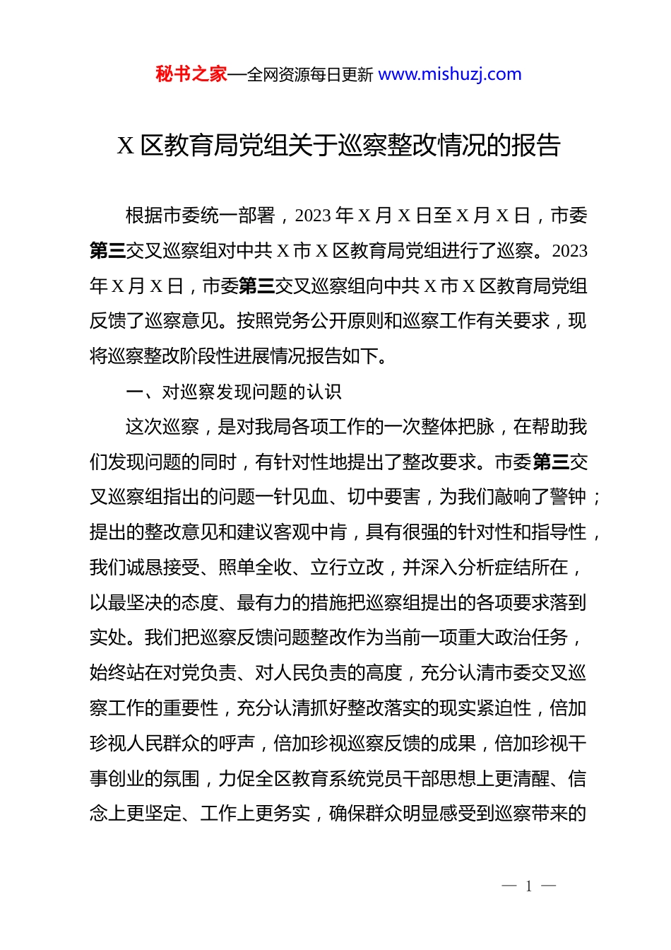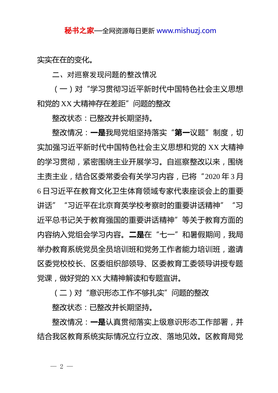 秘书之家—全网资源每日更新 www.mishuzj.comX 区教育局党组关于巡察整改情况的报告根据市委统一部署,2023 年 X 月 X 日至 X 月 X 日,市委第三交叉巡察组对中共 X 市 X 区教育局党组进行了巡察。2023年 X 月 X 日,市委第三交叉巡察组向中共 X 市 X 区教育局党组反馈了巡察意见。按照党务公开原则和巡察工作有关要求,现将巡察整改阶段性进展情况报告如下。一、对巡察发现问题的认识这次巡察,是对我局各项工作的一次整体把脉,在帮助我们发现问题的同时,有针对性地提出了整改要求。市委第三交叉巡察组指出的问题一针见血、切中要害,为我们敲响了警钟;提出的整改意见和建议客观中肯,具有很强的针对性和指导性,我们诚恳接受、照单全收、立行立改,并深入分析症结所在,以最坚决的态度、最有力的措施把巡察组提出的各项要求落到实处。我们把巡察反馈问题整改作为当前一项重大政治任务,始终站在对党负责、对人民负责的高度,充分认清市委交叉巡察工作的重要性,充分认清抓好整改落实的现实紧迫性,倍加珍视人民群众的呼声,倍加珍视巡察反馈的成果,倍加珍视干事创业的氛围,力促全区教育系统党员干部思想上更清醒、信念上更坚定、工作上更务实,确保群众明显感受到巡察带来的— 1 —秘书之家—全网资源每日更新 www.mishuzj.com实实在在的变化。二、对巡察发现问题的整改情况(一)对“学习贯彻习近平新时代中国特色社会主义思想和党的 XX 大精神存在差距”问题的整改整改状态:已整改并长期坚持。整改情况:一是我局党组坚持落实“第一议题”制度,切实加强习近平新时代中国特色社会主义思想和党的 XX 大精神的学习贯彻,紧密围绕主业开展学习。自巡察整改以来,围绕主责主业,结合区委常委会有关学习内容,已将“2020 年 3 月6 日习近平在教育文化卫生体育领域专家代表座谈会上的重要讲话”“习近平在北京育英学校考察时的重要讲话精神”“习近平总书记关于教育强国的重要讲话精神”等关于教育方面的内容纳入党组会学习内容。二是在“七一”和暑假期间,我局举办教育系统党员全员培训班和党务工作者能力培训班,邀请区委党校校长、区委组织部领导、区委教育工委领导讲授专题党课,做好党的 XX 大精神解读和专题宣讲。(二)对“意识形态工作不够扎实”问题的整改整改状态:已整改并长期坚持。整改情况:一是认真贯彻落实上级意识形态工作部署,并结合我区教育系统实际情况立行立改、落地见效。区教育局党— 2 —秘书之家—全网资源每日更新 www.mishuzj.com组把意识形态工作摆在各项工作的统领位置,按照市委、区委宣传部有关意识形态工作部署要求,制定《X 区教育局进一步加强舆情应对处置工作方案》,坚持做到意识形态工作制度化、常态化,切实防范化解重大舆情风险,牢牢守好意识形态安全阵地,为 X 教育稳步发展营造良好舆论环境。二是区教育局党组坚持落实“第一议题”制度,强化思想引领,把学习宣传贯彻党的 XX 大精神作为首要政治任务,党组理论学习中心组加强意识形态专题学习,每季度至少一次听取意识形态工作汇报。三是开展 2023 年“网络舆情信息员”“网络评论员”“支部安全员”的业务培训,进一步加强和改进意识形态工作,不断提高干部的责任意识和真抓实干水平。(三)对“教育资源均衡化发展有待加强”问题的整改整改状态:已整改并长期坚持。整改情况:一是科学制定义务教育阶段中小学校布局调整方案,合理规划学校布局,加强麻雀学校撤并力度,积极稳妥推进布局调整工作,优化教育资源配置。整改以来,我区已完成 X 镇 X 小学、X 镇 X 小学、X 镇 X 小学、X 镇 X 小学、X 街道 X 小学 X 分校、X 镇 X 小学 X 分校等 6 所麻雀学校撤并工作。二是印发《关于做好 X 区 2023 年秋季中小学招生工作的通知》《2023 年 X 市 X 区民办小学、初中招生电脑随机摇号录取实施— 3 —秘书之家—全网资源每日更新 www.mishuzj.com细则》《2023 年秋季 X 区城区公办小学、初中新生入学安排办法》《2024 年秋季 X 区城区公办小学、初中新生入学安排办法》《2024 年 X 市...