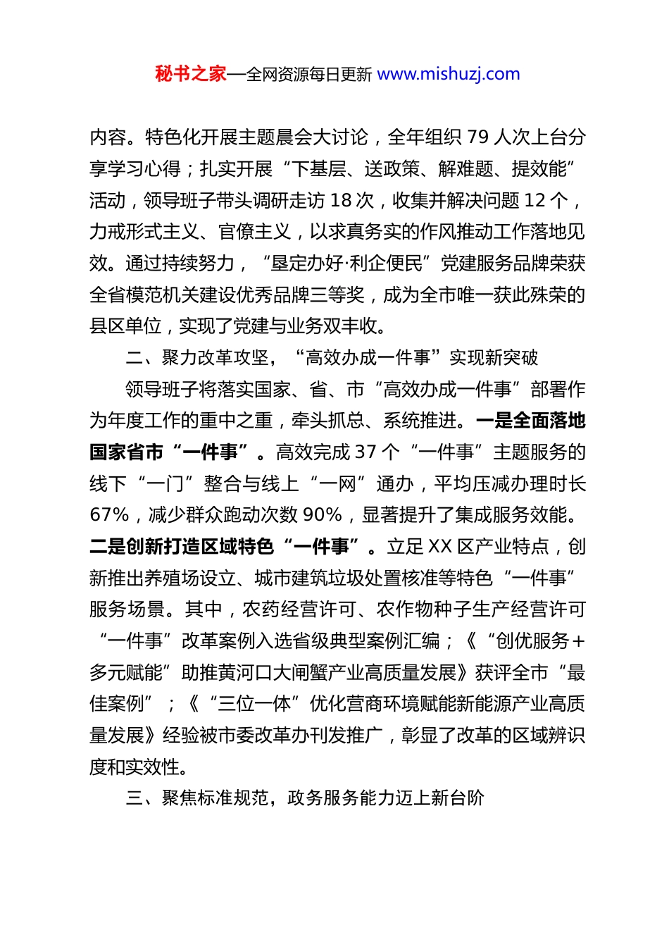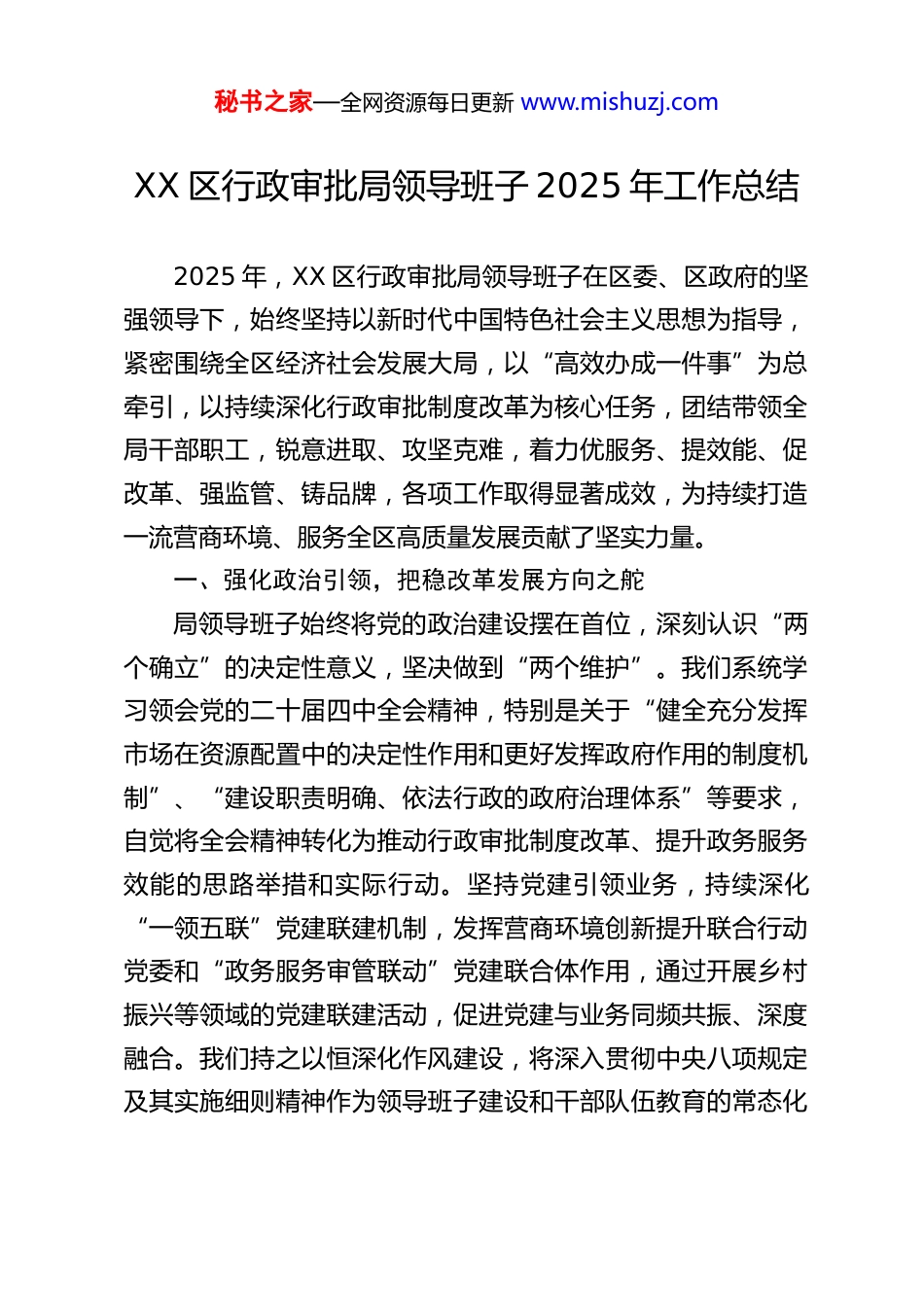 秘书之家—全网资源每日更新 www.mishuzj.comXX 区行政审批局领导班子 2025 年工作总结2025 年,XX 区行政审批局领导班子在区委、区政府的坚强领导下,始终坚持以新时代中国特色社会主义思想为指导,紧密围绕全区经济社会发展大局,以“高效办成一件事”为总牵引,以持续深化行政审批制度改革为核心任务,团结带领全局干部职工,锐意进取、攻坚克难,着力优服务、提效能、促改革、强监管、铸品牌,各项工作取得显著成效,为持续打造一流营商环境、服务全区高质量发展贡献了坚实力量。一、强化政治引领,把稳改革发展方向之舵局领导班子始终将党的政治建设摆在首位,深刻认识“两个确立”的决定性意义,坚决做到“两个维护”。我们系统学习领会党的二十届四中全会精神,特别是关于“健全充分发挥市场在资源配置中的决定性作用和更好发挥政府作用的制度机制”、“建设职责明确、依法行政的政府治理体系”等要求,自觉将全会精神转化为推动行政审批制度改革、提升政务服务效能的思路举措和实际行动。坚持党建引领业务,持续深化“一领五联”党建联建机制,发挥营商环境创新提升联合行动党委和“政务服务审管联动”党建联合体作用,通过开展乡村振兴等领域的党建联建活动,促进党建与业务同频共振、深度融合。我们持之以恒深化作风建设,将深入贯彻中央八项规定及其实施细则精神作为领导班子建设和干部队伍教育的常态化秘书之家—全网资源每日更新 www.mishuzj.com内容。特色化开展主题晨会大讨论,全年组织 79 人次上台分享学习心得;扎实开展“下基层、送政策、解难题、提效能”活动,领导班子带头调研走访 18 次,收集并解决问题 12 个,力戒形式主义、官僚主义,以求真务实的作风推动工作落地见效。通过持续努力,“垦定办好·利企便民”党建服务品牌荣获全省模范机关建设优秀品牌三等奖,成为全市唯一获此殊荣的县区单位,实现了党建与业务双丰收。二、聚力改革攻坚,“高效办成一件事”实现新突破领导班子将落实国家、省、市“高效办成一件事”部署作为年度工作的重中之重,牵头抓总、系统推进。一是全面落地国家省市“一件事”。高效完成 37 个“一件事”主题服务的线下“一门”整合与线上“一网”通办,平均压减办理时长67%,减少群众跑动次数 90%,显著提升了集成服务效能。二是创新打造区域特色“一件事”。立足 XX 区产业特点,创新推出养殖场设立、城市建筑垃圾处置核准等特色“一件事”服务场景。其中,农药经营许可、农作物种子生产经营许可“一件事”改革案例入选省级典型案例汇编;《“创优服务+多元赋能”助推黄河口大闸蟹产业高质量发展》获评全市“最佳案例”;《“三位一体”优化营商环境赋能新能源产业高质量发展》经验被市委改革办刊发推广,彰显了改革的区域辨识度和实效性。三、聚焦标准规范,政务服务能力迈上新台阶秘书之家—全网资源每日更新 www.mishuzj.com领导班子深刻认识到标准化是提升服务质效的基础,全力推动政务服务标准化、规范化、便利化建设。一是健全标准化体系。组织编制涵盖业务流程、机制保障等 4 个方面的 438 件标准文件,为各项服务提供了清晰的操作规范和依据。2025年 12 月,政务服务标准化试点项目高标准通过省级验收,标志着标准化建设取得阶段性重大成果。二是提升线上服务能力。组织骨干力量对全区 37 个部门的 1615 项政务服务要素进行精准核查与网办能力测试,实现事项认领、清单编制、办事指南公开准确率“三个 100%”。建立问题“即查即改、跟踪复查”闭环机制,确保服务精准无误。三是拓展智慧服务模式。创新推出“云评审”“云管家”“视频办”“云导服”等“垦云办”智慧服务,打造“晶豆子带你看大厅”微视频品牌,发布109 期,点播超 160 万次,以生动形式解读政策、回应关切,打通了线上服务“最后一公里”。四、深化改革创新,重点领域审批释放新动能领导班子紧盯市场主体关切和项目建设需求,推动重点领域改革走深走实。在企业开办领域,深化“6170”机制,推广住所标准化、企业迁移“一件事”改革,创新推出登记地址库“预备案”制度,推动市场主体全生命周期登记服务“全程网办”...