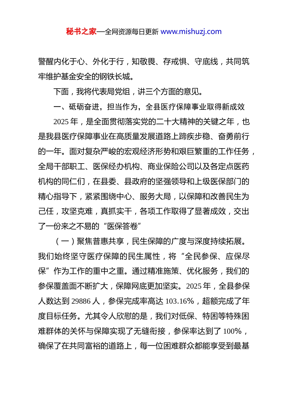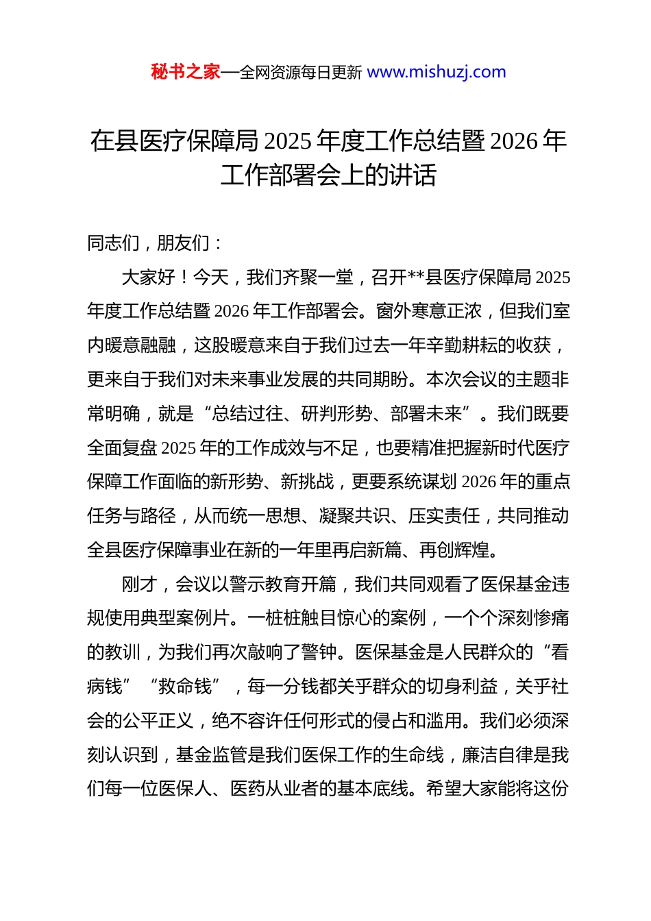 秘书之家—全网资源每日更新 www.mishuzj.com在县医疗保障局 2025 年度工作总结暨 2026 年工作部署会上的讲话 同志们,朋友们:大家好!今天,我们齐聚一堂,召开**县医疗保障局 2025年度工作总结暨 2026 年工作部署会。窗外寒意正浓,但我们室内暖意融融,这股暖意来自于我们过去一年辛勤耕耘的收获,更来自于我们对未来事业发展的共同期盼。本次会议的主题非常明确,就是“总结过往、研判形势、部署未来”。我们既要全面复盘 2025 年的工作成效与不足,也要精准把握新时代医疗保障工作面临的新形势、新挑战,更要系统谋划 2026 年的重点任务与路径,从而统一思想、凝聚共识、压实责任,共同推动全县医疗保障事业在新的一年里再启新篇、再创辉煌。刚才,会议以警示教育开篇,我们共同观看了医保基金违规使用典型案例片。一桩桩触目惊心的案例,一个个深刻惨痛的教训,为我们再次敲响了警钟。医保基金是人民群众的“看病钱”“救命钱”,每一分钱都关乎群众的切身利益,关乎社会的公平正义,绝不容许任何形式的侵占和滥用。我们必须深刻认识到,基金监管是我们医保工作的生命线,廉洁自律是我们每一位医保人、医药从业者的基本底线。希望大家能将这份秘书之家—全网资源每日更新 www.mishuzj.com警醒内化于心、外化于行,知敬畏、存戒惧、守底线,共同筑牢维护基金安全的钢铁长城。下面,我将代表局党组,讲三个方面的意见。一、砥砺奋进,担当作为,全县医疗保障事业取得新成效2025 年,是全面贯彻落实党的二十大精神的关键之年,也是我县医疗保障事业在高质量发展道路上蹄疾步稳、奋勇前行的一年。面对复杂严峻的宏观经济形势和艰巨繁重的工作任务,全局干部职工、医保经办机构、商业保险公司以及各定点医药机构的同仁们,在县委、县政府的坚强领导和上级医保部门的精心指导下,紧紧围绕中心、服务大局,以保障和改善民生为己任,攻坚克难,真抓实干,各项工作取得了显著成效,交出了一份来之不易的“医保答卷”(一)聚焦普惠共享,民生保障的广度与深度持续拓展。我们始终坚守医疗保障的民生属性,将“全民参保、应保尽保”作为工作的重中之重。通过精准施策、优化服务,我们的参保覆盖面不断扩大,保障网底更加坚实。2025 年,全县参保人数达到 29886 人,参保完成率高达 103.16%,超额完成了年度目标任务。尤其令人欣慰的是,我们对低保、特困等特殊困难群体的关怀与保障实现了无缝衔接,参保率达到了 100%,确保了在共同富裕的道路上,每一位困难群众都能享受到最基秘书之家—全网资源每日更新 www.mishuzj.com本的医疗保障。同时,医疗救助的托底功能得到充分发挥,全年共惠及 11669 人次,救助金额达到 332.51 万元,有效缓解了因病致贫、因病返贫问题,为巩固拓展脱贫攻坚成果、助力乡村振兴贡献了坚实的医保力量。这组数据的背后,是每一位医保工作者走村入户的辛勤脚步,是每一次政策宣讲的苦口婆心,更是我们对人民承诺的庄严兑现。(二)聚焦基金安全,监管体系的刚性与韧性显著增强。基金安全是医保工作的生命线,我们对此始终保持“零容忍”的高压态态。2025 年,我们以前所未有的决心和力度,构建并深化了“日常检查+智能监控+专项核查”三位一体、多维发力的立体化监管体系。这一体系犹如一张天罗地网,让欺诈骗保行为无处遁形。我们坚持问题导向,通过多轮次、全覆盖的监督检查,牢牢守护住了群众的“看病钱”和“救命钱”。会上通报的数据就是我们工作的最好证明:全年完成省、州、县三级联合检查 25 家次,深入排查并严肃查处了 17 类违规问题,累计追回违规医保基金 112.89 万元,处以行政罚款 1.83 万元,对 38 家次违规定点医药机构进行了严肃约谈。这一系列强有力的举措,不仅有效震慑了违法违规行为,净化了行业风气,更向全社会彰显了我们党和政府严厉打击欺诈骗保、维护医保基金安全的坚定立场和钢铁意志。秘书之家—全网资源每日更新 www.mishuzj.com(三)聚焦群众关切,服务供给的效能与温度大幅提升。我们始终秉持“以人民为中心”的发展思想,致力于让医保服务更便捷、更高效、更暖心。2025 年,我们创新...