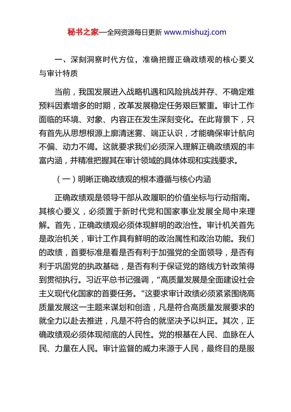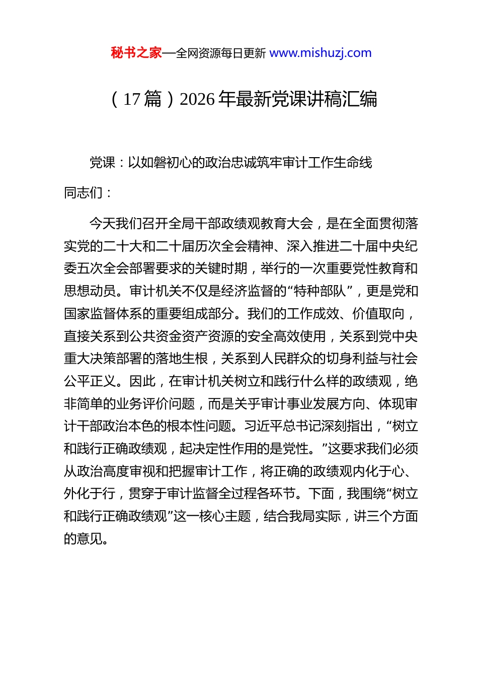 秘书之家—全网资源每日更新 www.mishuzj.com(17 篇)2026 年最新党课讲稿汇编 党课:以如磐初心的政治忠诚筑牢审计工作生命线同志们:今天我们召开全局干部政绩观教育大会,是在全面贯彻落实党的二十大和二十届历次全会精神、深入推进二十届中央纪委五次全会部署要求的关键时期,举行的一次重要党性教育和“”思想动员。审计机关不仅是经济监督的 特种部队 ,更是党和国家监督体系的重要组成部分。我们的工作成效、价值取向,直接关系到公共资金资产资源的安全高效使用,关系到党中央重大决策部署的落地生根,关系到人民群众的切身利益与社会公平正义。因此,在审计机关树立和践行什么样的政绩观,绝非简单的业务评价问题,而是关乎审计事业发展方向、体现审“计干部政治本色的根本性问题。习近平总书记深刻指出, 树立”和践行正确政绩观,起决定性作用的是党性。 这要求我们必须从政治高度审视和把握审计工作,将正确的政绩观内化于心、“外化于行,贯穿于审计监督全过程各环节。下面,我围绕 树立”和践行正确政绩观 这一核心主题,结合我局实际,讲三个方面的意见。秘书之家—全网资源每日更新 www.mishuzj.com一、深刻洞察时代方位,准确把握正确政绩观的核心要义与审计特质当前,我国发展进入战略机遇和风险挑战并存、不确定难预料因素增多的时期,改革发展稳定任务艰巨繁重。审计工作面临的环境、对象、内容正在发生深刻变化。在此背景下,只有首先从思想根源上廓清迷雾、端正认识,才能确保审计航向不偏、动力不竭。这就要求我们必须深入理解正确政绩观的丰富内涵,并精准把握其在审计领域的具体体现和实践要求。(一)明晰正确政绩观的根本遵循与核心内涵正确政绩观是领导干部从政履职的价值坐标与行动指南。其核心要义,必须置于新时代党和国家事业发展全局中来理解。首先,正确政绩观必须体现鲜明的政治性。审计机关首先是政治机关,审计工作具有鲜明的政治属性和政治功能。我们的政绩,首要标准是看是否有利于加强党的全面领导,是否有利于巩固党的执政基础,是否有利于保证党的路线方针政策得“到贯彻执行。习近平总书记强调, 高质量发展是全面建设社会”主义现代化国家的首要任务。 这要求审计政绩必须紧紧围绕高质量发展这一主题来谋划和创造,凡是符合高质量发展要求的就全力以赴去推进,凡是不符合的就坚决予以纠正。其次,正确政绩观必须体现彻底的人民性。党的根基在人民、血脉在人民、力量在人民。审计监督的威力来源于人民,最终目的是服秘书之家—全网资源每日更新 www.mishuzj.com务人民。我们的政绩,要体现在推动解决群众急难愁盼问题上,体现在促进民生政策落实、民生资金安全、民生项目效益上,体现在维护好、实现好、发展好最广大人民根本利益上。“”“”不能脱离群众需求搞 花架子 ,不能为了所谓 亮点 损害群众利益。最后,正确政绩观必须体现科学的实践性。政绩的创造必须尊重客观规律,坚持实事求是。审计工作尤其要注重事实、注重证据、注重程序。我们的政绩,应当是基于扎实审计、依法审计、规范审计基础上取得的实绩,是经得起历史、实践和人民检验的硬核成果。要坚决反对为了追求短期效应而“”“”搞 数据审计 、 盆景工程 ,更要杜绝弄虚作假、欺上瞒下。只有深刻把握这些核心内涵,我们才能在纷繁复杂的审计实践中保持定力、明辨方向。(二)把握审计工作践行正确政绩观的实践维度审计工作践行正确政绩观,有其独特的职业要求和实践维度,必须紧密结合审计监督的职能定位来深化认识。其一,审“”计政绩体现在维护经济安全的 防火墙 作用上。财政金融、国有资产、公共资源等领域的安全,是国家安全的基石。审计政“”绩的一个重要维度,就是通过常态化的 经济体检 ,及时揭示“风险隐患,提出堵塞漏洞、完善制度的建议,有效防止 黑天”“”鹅 、 灰犀牛 事件,筑牢经济安全屏障。这要求我们不仅要敢于揭示问题,更要善于预警风险,提升审计的前瞻性和建设“”性。其二,审计政绩体现在推动政策落实的 督察员 作用上。秘书之家—全网资源每日更新 www.mishuzj.com党中央的重大决策部署能否落地见效,...