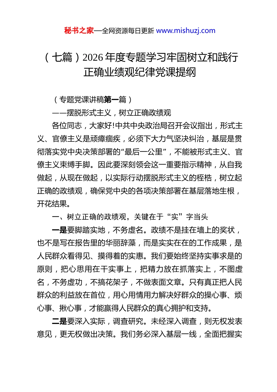 秘书之家—全网资源每日更新 www.mishuzj.com(七篇)2026 年度专题学习牢固树立和践行正确业绩观纪律党课提纲 (专题党课讲稿第一篇)——摆脱形式主义,树立正确政绩观各位同志,大家好!中共中央政治局召开会议指出,形式主义、官僚主义是顽瘴痼疾,必须下大力气坚决纠治,基层是贯“”彻落实党中央决策部署的 最后一公里 ,不能被形式主义、官僚主义束缚手脚。因此要深刻领会这一重要指示精神,从自我做起,从现在做起,以实际行动摆脱形式主义的桎梏,树立起正确的政绩观,确保党中央的各项决策部署在基层落地生根,开花结果。一、树立正确的政绩观,关键在于“实”字当头一是要脚踏实地,不务虚名。政绩不是挂在墙上的奖状,也不是写在报告里的华丽辞藻,而是实实在在的工作成果,是人民群众看得见、摸得着的实惠。我们要始终坚持实事求是的原则,把心思用在干实事上,把精力放在抓落实上,不图虚名,不务虚功,不搞花架子,不做表面文章。只有真正把人民群众的利益放在首位,用心用情用力解决好群众的操心事、烦心事、揪心事,才能赢得人民群众的真心拥护和支持。二是要深入实际,调查研究。未经深入调查,则无权发表意见,更无权做出决策。我们务必深入基层一线,全面把握实秘书之家—全网资源每日更新 www.mishuzj.com际情况,直接获取第一手资料,以此作为科学决策的重要基石。在调查研究的过程中,应坚定不移地坚持问题导向,积极发掘问题、深入剖析问题、有效解决问题,特别是针对群众普遍关注的热点难点问题,要倾注心力、采取切实有效的措施、追求实际成效,确保问题在基层得到有效解决,矛盾在萌芽状态得到妥善化解。三是要勇于担当,敢于负责。担当,作为干部的天职,是政绩观的核心展现。我们务必勇于直面挑战,坚决扛起责任重担,对矛盾不回避,对问题不推诿扯皮。在推动工作的进程中,需有攻坚克难的决心,敢于啃下硬骨头,勇于趟过险滩,秉持钉钉子般的坚韧精神,确保各项任务得以扎实落地,取得实效。此外,还需强化团结协作,凝聚工作合力,携手并进,共同推动事业蓬勃发展。二、我们要坚持问题导向,精准施策一是要聚焦形式主义问题,深挖根源,靶向治疗。形式主义往往表现为重形式轻内容、重过程轻结果、重数量轻质量等现象,它严重脱离了工作实际,背离了为人民服务的宗旨。我们必须深刻认识到,形式主义的根源在于思想不纯、作风不实、能力不足。因此,要从思想上筑牢防线,树立正确的价值观和政绩观;从作风上强化自律,严格遵守党的纪律和规矩;从能力上提升素质,增强解决实际问题的能力。同时,要建立秘书之家—全网资源每日更新 www.mishuzj.com健全相关制度机制,加强对形式主义的监督检查和问责追责,形成有力震慑,让形式主义无处遁形。二是要创新方式方法,提高工作实效。摆脱形式主义,树立正确的政绩观,离不开创新的工作思路和方法。我们要善于运用新技术、新手段,提高工作效率和质量。比如,利用大数据、云计算等现代信息技术,实现政务服务的智能化、便捷“化;通过 互联网+”政务服务 模式,打破信息壁垒,优化服务流程,让群众办事更加方便快捷。同时,要注重工作实效的评估,建立科学的绩效考核体系,把群众满意度作为评价工作成效的重要标准,确保各项工作真正落到实处、取得实效。三是要加强与群众的沟通交流,倾听群众意见和建议。在加强与群众沟通交流的进程中,我们应积极构建多元化、立体化的沟通渠道,确保每一位群众的声音都能被听见、被重视。首先,可以利用现代科技手段,如社交媒体平台、在线问卷调查等,拓宽与群众互动的边界,让群众能够随时随地表达自己的想法和需求。这种即时、便捷的沟通方式,不仅能有效提高信息收集的效率,还能增强群众的参与感和归属感。三、我们还要注重制度建设,构建长效机制一是完善责任体系,明确职责分工。建立健全政绩观落实的责任体系,明确各级领导干部在树立正确政绩观中的具体职责和任务,形成一级抓一级、层层抓落实的工作格局。同时,秘书之家—全网资源每日更新 www.mishuzj.com要加强监督检查,对落实不力的单位和个人进行严肃问责,确保责任落到实处,形成强大的工作推...