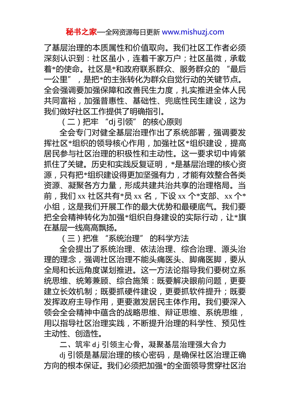 秘书之家—全网资源每日更新 www.mishuzj.com社区*课:把全会精神种进社区 让幸福扎根家门口同志们:风清浪稳,万物勃发。在全市上下深入学习贯彻*的二十届四中全会精神的热潮中,我们今天齐聚一堂,共同研读全会精神,梳理社区发展实践,把二十届四中全会的全面建设社会主义现代化国家、推进国家治理体系和治理能力现代化的会议要求,传递到社区的每一个角落,转化为新时代基层治理的具体方向、具体行动、具体成效。社区作为国家治理体系的 “神经末梢”,是政策落地、服务群众的 “最后一公里”。我们必须深学细悟全会精神,找准 “国之大者” 与 “家之要事” 的交汇点,把宏伟蓝图细化为解决居民烦心事、操心事、揪心事的家门口实践让大家的日子更有盼头、更有滋味、更有温度。一、深刻领会全会精神核心要义,把牢基层治理正确方向*的二十届四中全会是在我国迈上全面建设社会主义现代化国家新征程、向第二个百年奋斗目标进军的关键时刻召开的一次重要会议。全会专题研究坚持和完善中国特色社会主义制度、推进国家治理体系和治理能力现代化问题这是*中央从政治上、全局上、战略上全面考量作出的重大决策,充分体现了以人民为中心的发展思想,体现了我们*治国理政的高度自觉和历史担当。(一)把准 “人民至上” 的根本立场全会明确指出,人民至上是*领导人民进行伟大奋斗积累的宝贵历史经验,完善社会治理体系是推进国家治理体系和治理能力现代化的重要内容。这一重要论述深刻揭示秘书之家—全网资源每日更新 www.mishuzj.com了基层治理的本质属性和价值取向。我们社区工作者必须深刻认识到:社区虽小,连着千家万户;社区虽微,承载着*的使命。社区是*和政府联系群众、服务群众的 “最后一公里”,是把*的主张转化为群众自觉行动的关键节点。全会强调要加强保障和改善民生力度,扎实推进全体人民共同富裕,加强普惠性、基础性、兜底性民生建设,这为我们做好社区工作提供了明确指引。(二)把牢 “dj 引领” 的核心原则全会专门对健全基层治理作出了系统部署,强调要发挥社区*组织的领导核心作用,加强社区*组织建设,提高居民参与社区治理的积极性和主动性。这一要求切中肯綮抓住了关键。历史和实践反复证明,*是基层治理的核心资源,只有把*组织建设得更加坚强有力,才能有效整合各类资源、凝聚各方力量,形成共建共治共享的治理格局。当前,我们 xx 社区共有*员 xx 名,下设 xx 个*支部、xx 个*小组,这是我们开展工作的最大优势和最硬底气。我们要把全会精神转化为加强*组织自身建设的实际行动,让*旗在基层一线高高飘扬。(三)把准 “系统治理” 的科学方法全会提出了系统治理、依法治理、综合治理、源头治理的理念,强调社区治理不能头痛医头、脚痛医脚,要从全局和长远角度谋划推进。这一方法论指导我们要树立系统思维、统筹兼顾、综合施策:既要解决眼前问题,更要建立长效机制;既要抓硬件建设,更要抓软件提升;既要发挥政府主导作用,更要激发居民主体作用。我们要深入领会全会精神中蕴含的战略思维、辩证思维、系统思维,用以指导社区治理实践,不断提升治理的科学性、预见性主动性、创造性。二、筑牢 dj 引领主心骨,凝聚基层治理强大合力dj 引领是基层治理的核心密码,是确保社区治理正确方向的根本保证。我们必须把加强*的全面领导贯穿社区治秘书之家—全网资源每日更新 www.mishuzj.com理的各方面、全过程,让*旗在基层一线高高飘扬,让*员成为服务群众的 “红色先锋队”。(一)健全组织体系,织密 dj 引领 “一张网”组织建设是*的建设的重要基础。我们坚持把*组织建在网格上,构建起 “社区*委 — 网格*支部 — 楼栋*小组— *员中心户” 四级组织架构,实现了*的组织和工作全覆盖。目前,社区共划分 xx 个网格,配备 xx 名专职网格员、xx 名兼职网格员,每个网格都建立了*支部或*小组,形成了 “网格*支部统筹、*小组联楼、*员中心户联户” 的工作格局。*员带头巡查环境、调解纠纷、代办事项,让群众“小事不出网格、大事不出社区”,真正把*组织建设得更加坚强有力,让基层治理有了 “主心骨”,让居民群...