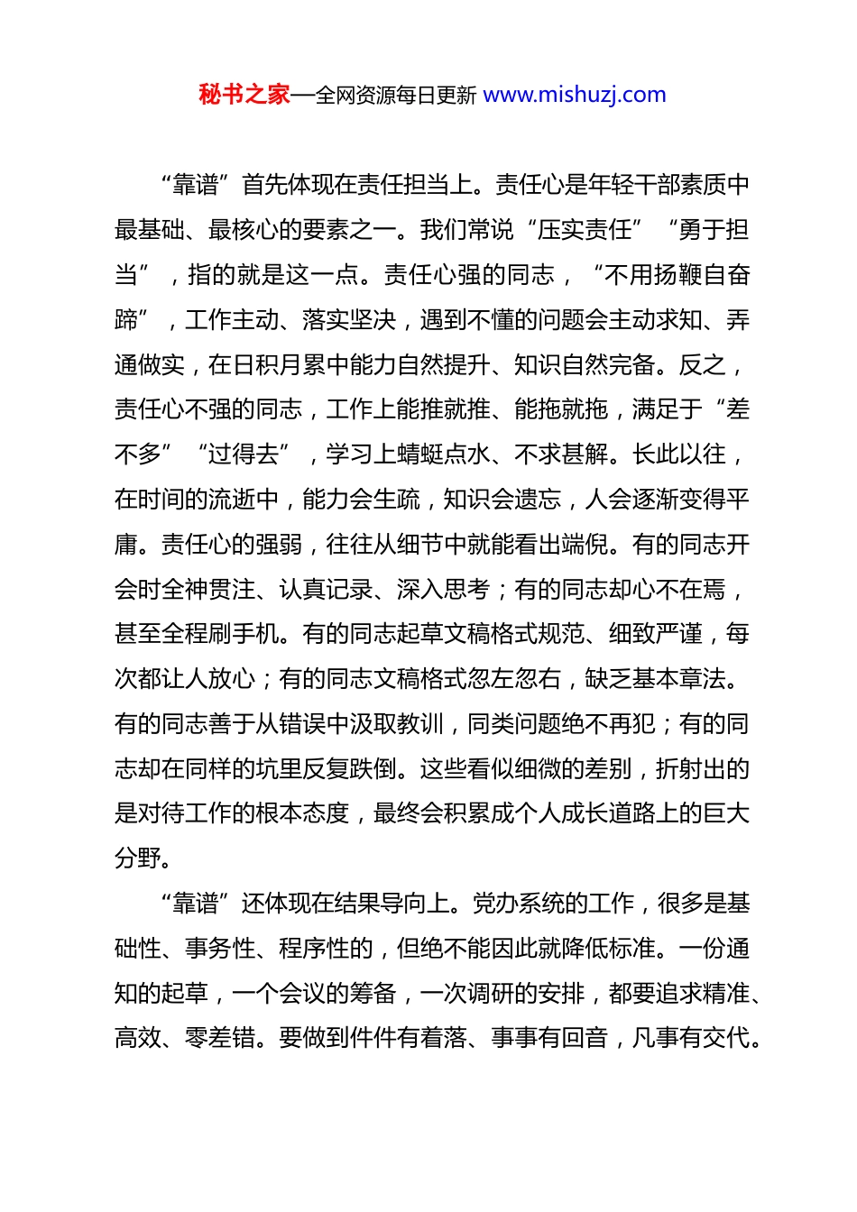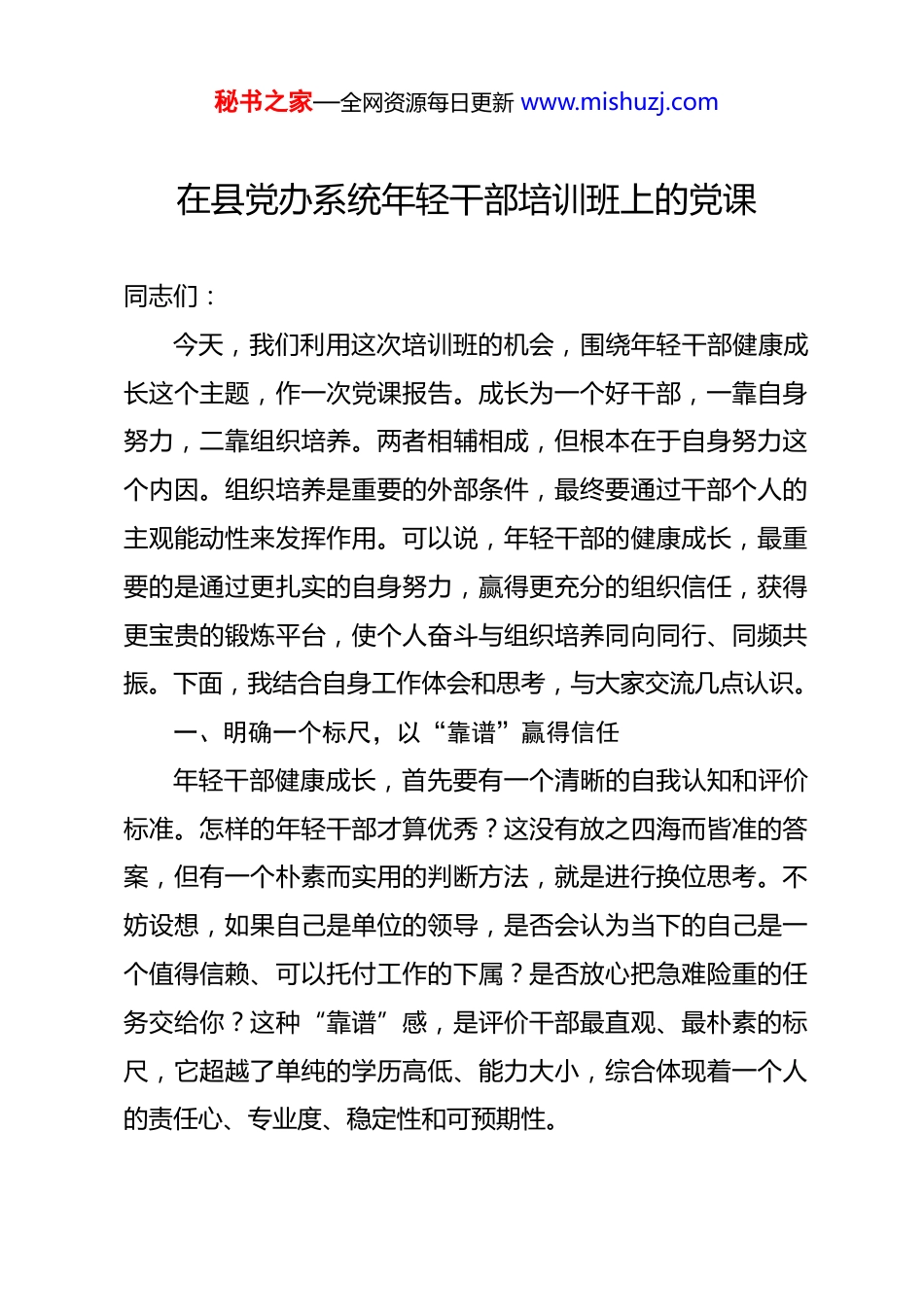 秘书之家—全网资源每日更新 www.mishuzj.com在县党办系统年轻干部培训班上的党课 同志们:今天,我们利用这次培训班的机会,围绕年轻干部健康成长这个主题,作一次党课报告。成长为一个好干部,一靠自身努力,二靠组织培养。两者相辅相成,但根本在于自身努力这个内因。组织培养是重要的外部条件,最终要通过干部个人的主观能动性来发挥作用。可以说,年轻干部的健康成长,最重要的是通过更扎实的自身努力,赢得更充分的组织信任,获得更宝贵的锻炼平台,使个人奋斗与组织培养同向同行、同频共振。下面,我结合自身工作体会和思考,与大家交流几点认识。一、明确一个标尺,以“靠谱”赢得信任年轻干部健康成长,首先要有一个清晰的自我认知和评价标准。怎样的年轻干部才算优秀?这没有放之四海而皆准的答案,但有一个朴素而实用的判断方法,就是进行换位思考。不妨设想,如果自己是单位的领导,是否会认为当下的自己是一个值得信赖、可以托付工作的下属?是否放心把急难险重的任务交给你?这种“靠谱”感,是评价干部最直观、最朴素的标尺,它超越了单纯的学历高低、能力大小,综合体现着一个人的责任心、专业度、稳定性和可预期性。秘书之家—全网资源每日更新 www.mishuzj.com“靠谱”首先体现在责任担当上。责任心是年轻干部素质中最基础、最核心的要素之一。我们常说“压实责任”“勇于担当”,指的就是这一点。责任心强的同志,“不用扬鞭自奋蹄”,工作主动、落实坚决,遇到不懂的问题会主动求知、弄通做实,在日积月累中能力自然提升、知识自然完备。反之,责任心不强的同志,工作上能推就推、能拖就拖,满足于“差不多”“过得去”,学习上蜻蜓点水、不求甚解。长此以往,在时间的流逝中,能力会生疏,知识会遗忘,人会逐渐变得平庸。责任心的强弱,往往从细节中就能看出端倪。有的同志开会时全神贯注、认真记录、深入思考;有的同志却心不在焉,甚至全程刷手机。有的同志起草文稿格式规范、细致严谨,每次都让人放心;有的同志文稿格式忽左忽右,缺乏基本章法。有的同志善于从错误中汲取教训,同类问题绝不再犯;有的同志却在同样的坑里反复跌倒。这些看似细微的差别,折射出的是对待工作的根本态度,最终会积累成个人成长道路上的巨大分野。“靠谱”还体现在结果导向上。党办系统的工作,很多是基础性、事务性、程序性的,但绝不能因此就降低标准。一份通知的起草,一个会议的筹备,一次调研的安排,都要追求精准、高效、零差错。要做到件件有着落、事事有回音,凡事有交代。秘书之家—全网资源每日更新 www.mishuzj.com领导交办的工作,不仅要“做了”,更要“做好”;不仅要达到基本要求,更要思考如何能做得更周全、更出色。这种追求极致、精益求精的态度,就是专业精神的体现。粟裕将军被誉为“战神”,其专业精神渗透到生活的点滴。他与妻子逛街,评价一个咖啡馆“不错”,理由是其位置便于架设机枪封锁街道——心中时刻装着打仗的事。地质学家李四光,为了测量精准,刻意训练自己每一步都跨出 85 厘米,以脚步丈量大地。他们的专业素养,并非挂在嘴边,而是融入一言一行、成为本能。年轻干部也要培养这种专业精神,干一行、爱一行、精一行,让自己经手的每一项工作,都成为自己能力和水平的“名片”。二、牢记一个道理,以“恒心”积蓄力量年轻干部的成长是一场马拉松,而非百米冲刺。必须牢记“相信时间的力量”这个道理,克服浮躁心态,保持历史耐心。一方面,要力戒浮躁,摒弃“走捷径”的幻想。成长没有电梯,只有台阶。不要总想着速成之法,企图一夜之间脱胎换骨。要着眼长远,谋定后动,将大目标分解为可执行、可衡量的小计划,持之以恒,积小胜为大胜。要警惕“寒号鸟”式的悲剧。对于寒号鸟来说,秋天筑巢是重要但不紧迫的事。它只顾享受眼前的安逸,直到寒冬将至才追悔莫及。年轻干部要避免重蹈覆辙,将更多时间投入到那些“重要而不紧迫”的事情秘书之家—全网资源每日更新 www.mishuzj.com上,比如系统学习理论、深入研究政策、主动思考谋划、锤炼文字功底、培养健康爱好等,为长远发展打下坚实基础。这些看似当下不显山露水的投入,正是未来厚...