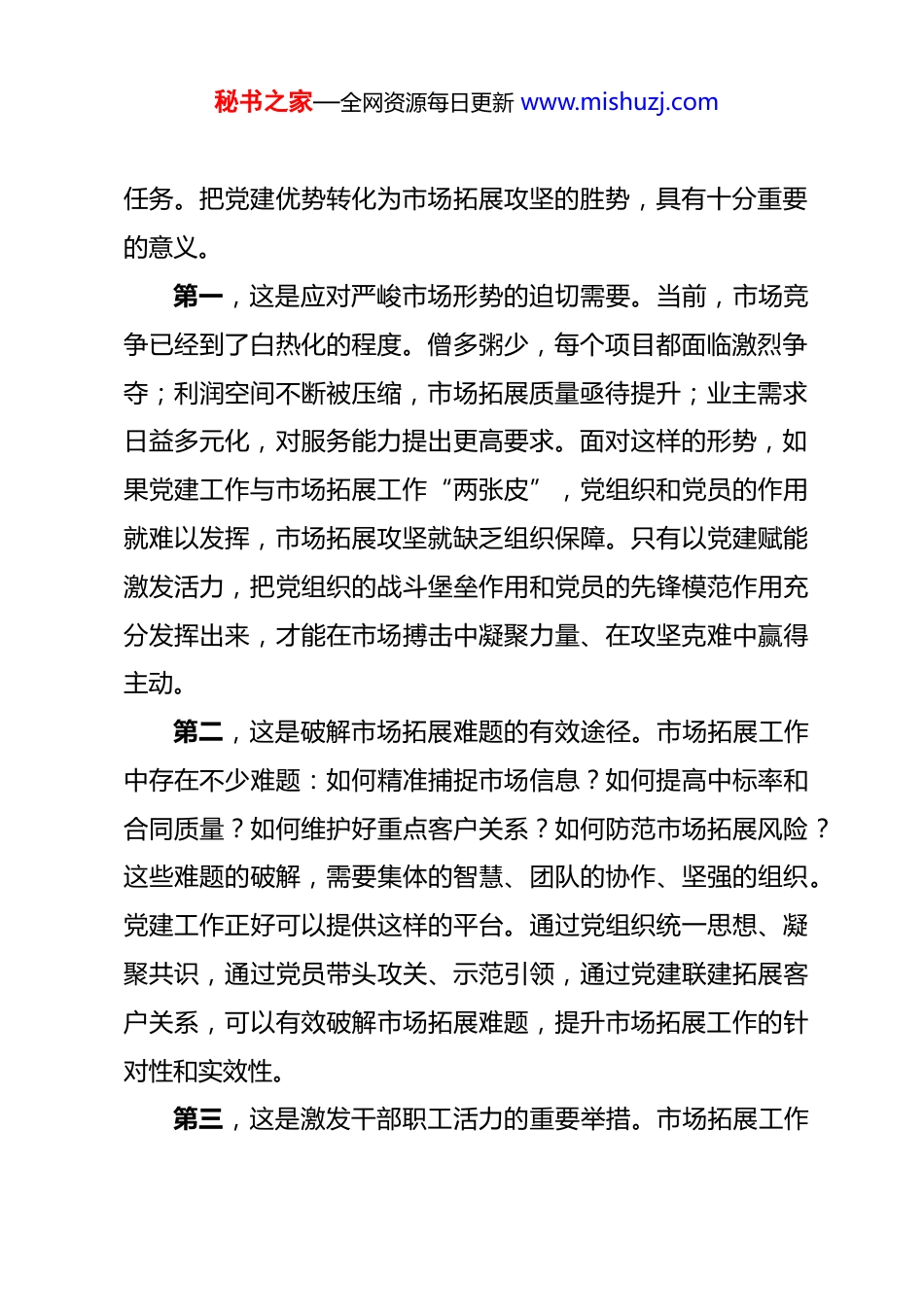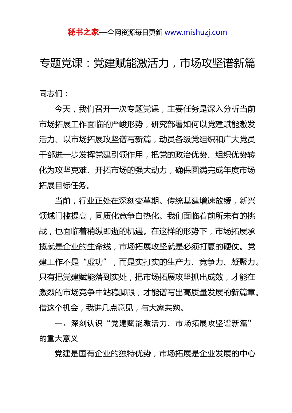 秘书之家—全网资源每日更新 www.mishuzj.com专题党课:党建赋能激活力,市场攻坚谱新篇 同志们:今天,我们召开一次专题党课,主要任务是深入分析当前市场拓展工作面临的严峻形势,研究部署如何以党建赋能激发活力、以市场拓展攻坚谱写新篇,动员各级党组织和广大党员干部进一步发挥党建引领作用,把党的政治优势、组织优势转化为攻坚克难、开拓市场的强大动力,确保圆满完成年度市场拓展目标任务。当前,行业正处在深刻变革期。传统基建增速放缓,新兴领域门槛提高,同质化竞争白热化。我们面临着前所未有的挑战,也面临着稍纵即逝的机遇。在这样的形势下,市场拓展承揽就是企业的生命线,市场拓展攻坚就是必须打赢的硬仗。党建工作不是“虚功”,而是实打实的生产力、竞争力、凝聚力。只有把党建赋能落到实处,把市场拓展攻坚抓出成效,才能在激烈的市场竞争中站稳脚跟,才能谱写出高质量发展的新篇章。借这个机会,我讲几点意见,与大家共勉。一、深刻认识“党建赋能激活力,市场拓展攻坚谱新篇”的重大意义党建是国有企业的独特优势,市场拓展是企业发展的中心秘书之家—全网资源每日更新 www.mishuzj.com任务。把党建优势转化为市场拓展攻坚的胜势,具有十分重要的意义。第一,这是应对严峻市场形势的迫切需要。当前,市场竞争已经到了白热化的程度。僧多粥少,每个项目都面临激烈争夺;利润空间不断被压缩,市场拓展质量亟待提升;业主需求日益多元化,对服务能力提出更高要求。面对这样的形势,如果党建工作与市场拓展工作“两张皮”,党组织和党员的作用就难以发挥,市场拓展攻坚就缺乏组织保障。只有以党建赋能激发活力,把党组织的战斗堡垒作用和党员的先锋模范作用充分发挥出来,才能在市场搏击中凝聚力量、在攻坚克难中赢得主动。第二,这是破解市场拓展难题的有效途径。市场拓展工作中存在不少难题:如何精准捕捉市场信息?如何提高中标率和合同质量?如何维护好重点客户关系?如何防范市场拓展风险?这些难题的破解,需要集体的智慧、团队的协作、坚强的组织。党建工作正好可以提供这样的平台。通过党组织统一思想、凝聚共识,通过党员带头攻关、示范引领,通过党建联建拓展客户关系,可以有效破解市场拓展难题,提升市场拓展工作的针对性和实效性。第三,这是激发干部职工活力的重要举措。市场拓展工作秘书之家—全网资源每日更新 www.mishuzj.com压力大、节奏快,长期处于高强度状态,干部职工容易产生疲劳感和畏难情绪。党建工作具有凝聚人心、鼓舞士气、激发活力的独特功能。通过强有力的思想政治工作,通过先进典型的示范引领,通过党组织的关心关爱,可以激发广大市场拓展人员的积极性、主动性、创造性,让他们以更加昂扬的斗志投入到市场拓展攻坚中去。第四,这是推动企业高质量发展的必然要求。高质量发展,首先要有高质量的市场拓展。没有优质的项目,就没有发展的基础;没有健康的市场拓展,就没有可持续的发展。党建赋能就是要通过加强党的建设,为市场拓展工作提供坚强的政治保证、思想保证、组织保证、作风保证,推动市场拓展工作从追求规模向追求质量转变,从粗放式向精细化转变,从单一模式向多元化转变,实现市场拓展工作的提质增效,为企业高质量发展奠定坚实基础。二、准确把握“党建赋能激活力”的内涵要求,把党的优势转化为攻坚力量党建赋能,不是一句口号,而是有着丰富内涵和明确要求的实践课题。要重点把握好“五个赋能”。第一,思想赋能:统一认识,凝聚攻坚共识。思想是行动的先导。要深入开展形势任务教育,把当前市场拓展工作面临秘书之家—全网资源每日更新 www.mishuzj.com的严峻形势讲清楚,把年度目标任务讲明白,把攻坚克难的信心树起来。要组织市场拓展人员围绕“怎么看、怎么办、怎么干”开展大讨论,引导大家谈认识、谈思路、谈举措,把思想统一到公司党委的决策部署上来。要用共同的目标凝聚人,用坚定的信念鼓舞人,让每一名市场拓展人员都认识到:市场拓展攻坚没有旁观者,人人都是主力军。要通过思想赋能,让“人人关心市场拓展、人人支持市场拓展、人人参与市场拓展”成为全体干部职工的自觉行动。第二,组织赋能:...