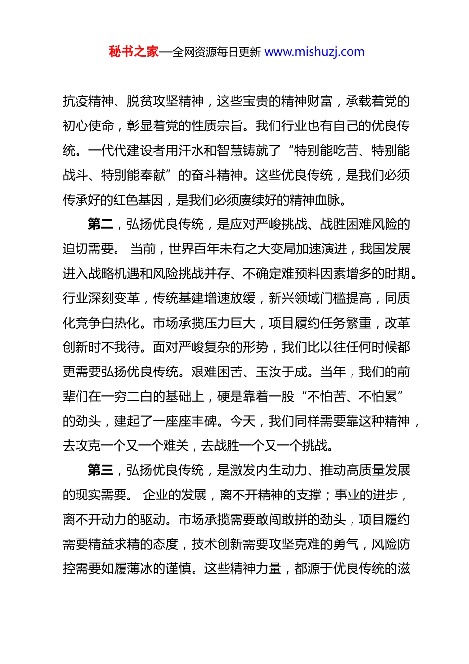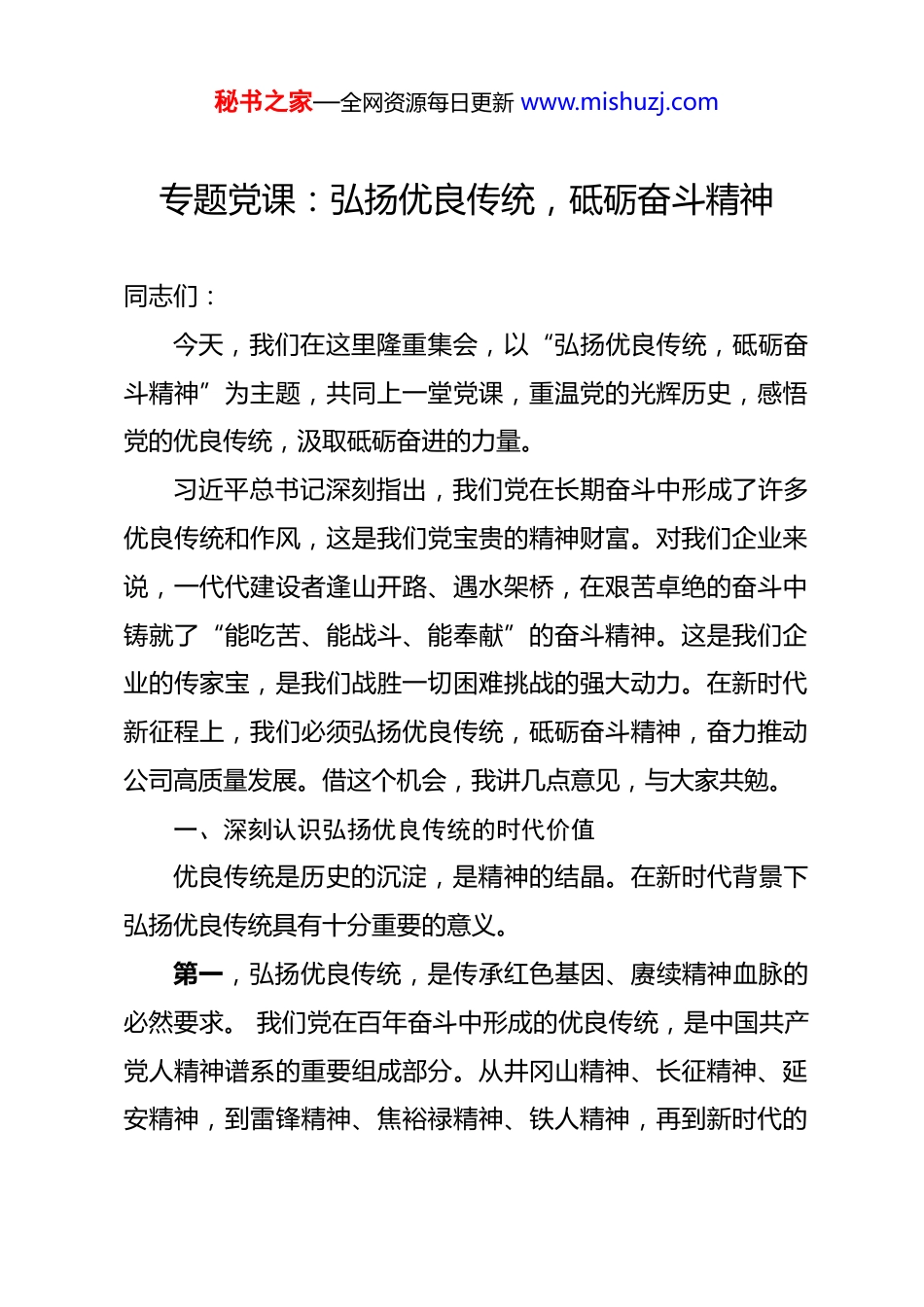 秘书之家—全网资源每日更新 www.mishuzj.com专题党课:弘扬优良传统,砥砺奋斗精神 同志们:今天,我们在这里隆重集会,以“弘扬优良传统,砥砺奋斗精神”为主题,共同上一堂党课,重温党的光辉历史,感悟党的优良传统,汲取砥砺奋进的力量。习近平总书记深刻指出,我们党在长期奋斗中形成了许多优良传统和作风,这是我们党宝贵的精神财富。对我们企业来说,一代代建设者逢山开路、遇水架桥,在艰苦卓绝的奋斗中铸就了“能吃苦、能战斗、能奉献”的奋斗精神。这是我们企业的传家宝,是我们战胜一切困难挑战的强大动力。在新时代新征程上,我们必须弘扬优良传统,砥砺奋斗精神,奋力推动公司高质量发展。借这个机会,我讲几点意见,与大家共勉。一、深刻认识弘扬优良传统的时代价值优良传统是历史的沉淀,是精神的结晶。在新时代背景下弘扬优良传统具有十分重要的意义。第一,弘扬优良传统,是传承红色基因、赓续精神血脉的必然要求。 我们党在百年奋斗中形成的优良传统,是中国共产党人精神谱系的重要组成部分。从井冈山精神、长征精神、延安精神,到雷锋精神、焦裕禄精神、铁人精神,再到新时代的秘书之家—全网资源每日更新 www.mishuzj.com抗疫精神、脱贫攻坚精神,这些宝贵的精神财富,承载着党的初心使命,彰显着党的性质宗旨。我们行业也有自己的优良传统。一代代建设者用汗水和智慧铸就了“特别能吃苦、特别能战斗、特别能奉献”的奋斗精神。这些优良传统,是我们必须传承好的红色基因,是我们必须赓续好的精神血脉。第二,弘扬优良传统,是应对严峻挑战、战胜困难风险的迫切需要。 当前,世界百年未有之大变局加速演进,我国发展进入战略机遇和风险挑战并存、不确定难预料因素增多的时期。行业深刻变革,传统基建增速放缓,新兴领域门槛提高,同质化竞争白热化。市场承揽压力巨大,项目履约任务繁重,改革创新时不我待。面对严峻复杂的形势,我们比以往任何时候都更需要弘扬优良传统。艰难困苦、玉汝于成。当年,我们的前辈们在一穷二白的基础上,硬是靠着一股“不怕苦、不怕累”的劲头,建起了一座座丰碑。今天,我们同样需要靠这种精神,去攻克一个又一个难关,去战胜一个又一个挑战。第三,弘扬优良传统,是激发内生动力、推动高质量发展的现实需要。 企业的发展,离不开精神的支撑;事业的进步,离不开动力的驱动。市场承揽需要敢闯敢拼的劲头,项目履约需要精益求精的态度,技术创新需要攻坚克难的勇气,风险防控需要如履薄冰的谨慎。这些精神力量,都源于优良传统的滋秘书之家—全网资源每日更新 www.mishuzj.com养。只有弘扬优良传统,才能激发干部职工的内生动力,才能凝聚起推动发展的磅礴力量。我们要从优良传统中汲取精神营养,把艰苦奋斗的作风发扬光大,把拼搏进取的精神融入血脉,推动企业不断向前发展。第四,弘扬优良传统,是加强队伍建设、培养时代新人的重要途径。 干部是事业发展的骨干,青年是事业发展的未来。一支队伍有没有战斗力,不仅看能力素质,更看精神风貌。优良传统是培养人的最好教材,奋斗精神是成就人的最大动力。我们要用优良传统教育人、引导人、塑造人,培养造就一支特别能吃苦、特别能战斗、特别能奉献的干部职工队伍。要让年轻一代了解企业的发展历程,感悟先辈的奋斗精神,接过历史的接力棒,跑好新时代的接力赛。二、准确把握优良传统的丰富内涵我们企业的优良传统,是一代代建设者在长期实践中形成的宝贵精神财富。要准确把握其丰富内涵,深刻理解其精神实质。第一,特别能吃苦的奉献精神。我们的前辈们,住的是帐篷板房,吃的是粗茶淡饭,用的是简陋工具。白天头顶烈日、风餐露宿,夜晚点着油灯、研究图纸。他们硬是在一片荒芜中,竖起了创业的旗帜,打下了发展的根基。这种“特别能吃苦”秘书之家—全网资源每日更新 www.mishuzj.com的精神,就是不怕苦、不怕累、不怕脏、不怕难,在任何艰苦条件下都能坚守岗位、默默奉献。今天,我们的条件虽然好了,但这种吃苦精神不能丢。市场口的同志常年在外跑市场,项目上的同志常年驻守工地,风餐露宿、背井离乡,这种苦,是奋斗的苦;这种累,是光荣的累。我们要把这种“特别...