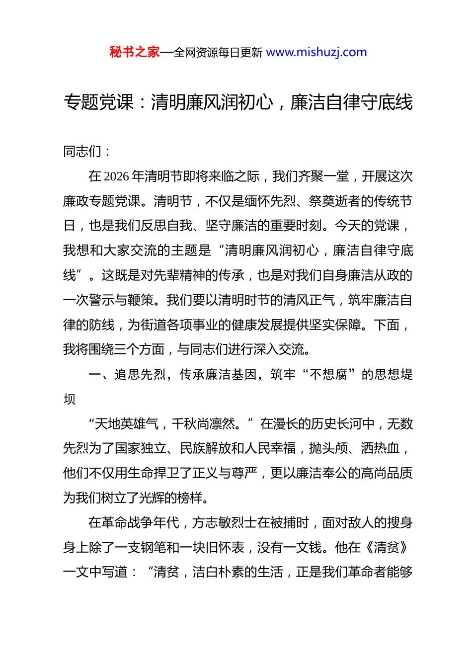 秘书之家—全网资源每日更新 www.mishuzj.com专题党课:清明廉风润初心,廉洁自律守底线 同志们:在 2026 年清明节即将来临之际,我们齐聚一堂,开展这次廉政专题党课。清明节,不仅是缅怀先烈、祭奠逝者的传统节日,也是我们反思自我、坚守廉洁的重要时刻。今天的党课,我想和大家交流的主题是“清明廉风润初心,廉洁自律守底线”。这既是对先辈精神的传承,也是对我们自身廉洁从政的一次警示与鞭策。我们要以清明时节的清风正气,筑牢廉洁自律的防线,为街道各项事业的健康发展提供坚实保障。下面,我将围绕三个方面,与同志们进行深入交流。一、追思先烈,传承廉洁基因,筑牢“不想腐”的思想堤坝“天地英雄气,千秋尚凛然。”在漫长的历史长河中,无数先烈为了国家独立、民族解放和人民幸福,抛头颅、洒热血,他们不仅用生命捍卫了正义与尊严,更以廉洁奉公的高尚品质为我们树立了光辉的榜样。在革命战争年代,方志敏烈士在被捕时,面对敌人的搜身身上除了一支钢笔和一块旧怀表,没有一文钱。他在《清贫》一文中写道:“清贫,洁白朴素的生活,正是我们革命者能够秘书之家—全网资源每日更新 www.mishuzj.com战胜许多困难的地方!”这种廉洁自律、两袖清风的品质,正是共产党人理想信念的生动写照。又如杨靖宇将军,在冰天雪地、弹尽粮绝的情况下,孤身一人与大量日寇周旋,战斗几昼夜后壮烈牺牲。他以坚定的信念和高尚的品格,诠释了对国家和人民的忠诚,也展现了廉洁奉公的崇高精神。然而,在当今社会,随着经济的快速发展和物质生活的日益丰富,少数党员干部在各种诱惑面前迷失了方向,忘记了初心和使命。有的利用职务之便谋取私利,搞权钱交易;有的贪图享乐,生活奢靡;有的形式主义、官僚主义严重,对群众的疾苦漠不关心。这些行为不仅损害了党和政府的形象,也伤害了人民群众的感情。同志们,清明节是我们缅怀先烈、传承精神的重要时刻。我们要以先烈为榜样,坚定理想信念,补足精神之“钙”。一是坚定信仰,坚守政治立场理想信念是共产党人的精神支柱和政治灵魂。我们要深入学习习近平新时代中国特色社会主义思想,深刻领悟“两个确立”的决定性意义,增强“四个意识”、坚定“四个自信”、做到“两个维护”。始终保持对党的忠诚,在思想上、政治上、行动上同党中央保持高度一致,确保在任何时候、任何情况下都能坚守政治立场,不被各种错误思潮所左右。秘书之家—全网资源每日更新 www.mishuzj.com二是牢记初心,践行宗旨意识我们党的初心和使命是为中国人民谋幸福,为中华民族谋复兴。作为基层干部,我们要时刻牢记自己的身份和职责,把人民群众的利益放在首位,全心全意为人民服务。要深入基层、深入群众,了解群众的需求和疾苦,切实解决群众的实际问题,让人民群众感受到党和政府的关怀与温暖。三是弘扬正气,保持廉洁本色廉洁自律是党员干部的基本准则。我们要自觉遵守党纪国法,严格要求自己,做到廉洁从政、廉洁用权、廉洁修身、廉洁齐家。要坚决抵制各种腐朽思想的侵蚀,保持清醒的头脑,做到不为名利所动,不为金钱所惑,始终保持共产党人的浩然正气。二、正风肃纪,严守纪律规矩,扎紧“不能腐”的制度笼子“欲知平直,则必准绳;欲知方圆,则必规矩。”纪律规矩是我们党的生命线,是党员干部必须遵守的行为准则。在清明节这个特殊的节点,我们更要严格遵守纪律规矩,确保各项工作风清气正。近年来,我们街道在党风廉政建设方面取得了一定的成绩但也存在一些不容忽视的问题。个别干部纪律意识淡薄,对规秘书之家—全网资源每日更新 www.mishuzj.com章制度置若罔闻;有的在工作中敷衍塞责,不作为、慢作为;还有的在清明祭祀等活动中,存在铺张浪费、违规违纪等现象。这些问题不仅影响了街道的形象和工作效率,也损害了党和政府的公信力。为了进一步加强纪律建设,扎紧“不能腐”的制度笼子,我们要做好以下几点:一是加强纪律教育,增强规矩意识要通过开展廉政教育活动、专题培训等方式,组织党员干部深入学习党纪国法和各项规章制度,让大家明白哪些事能做、哪些事不能做,自觉遵守纪律规矩。要结合清明节的特点,开展廉洁祭祀、文明祭祀等主题教育...