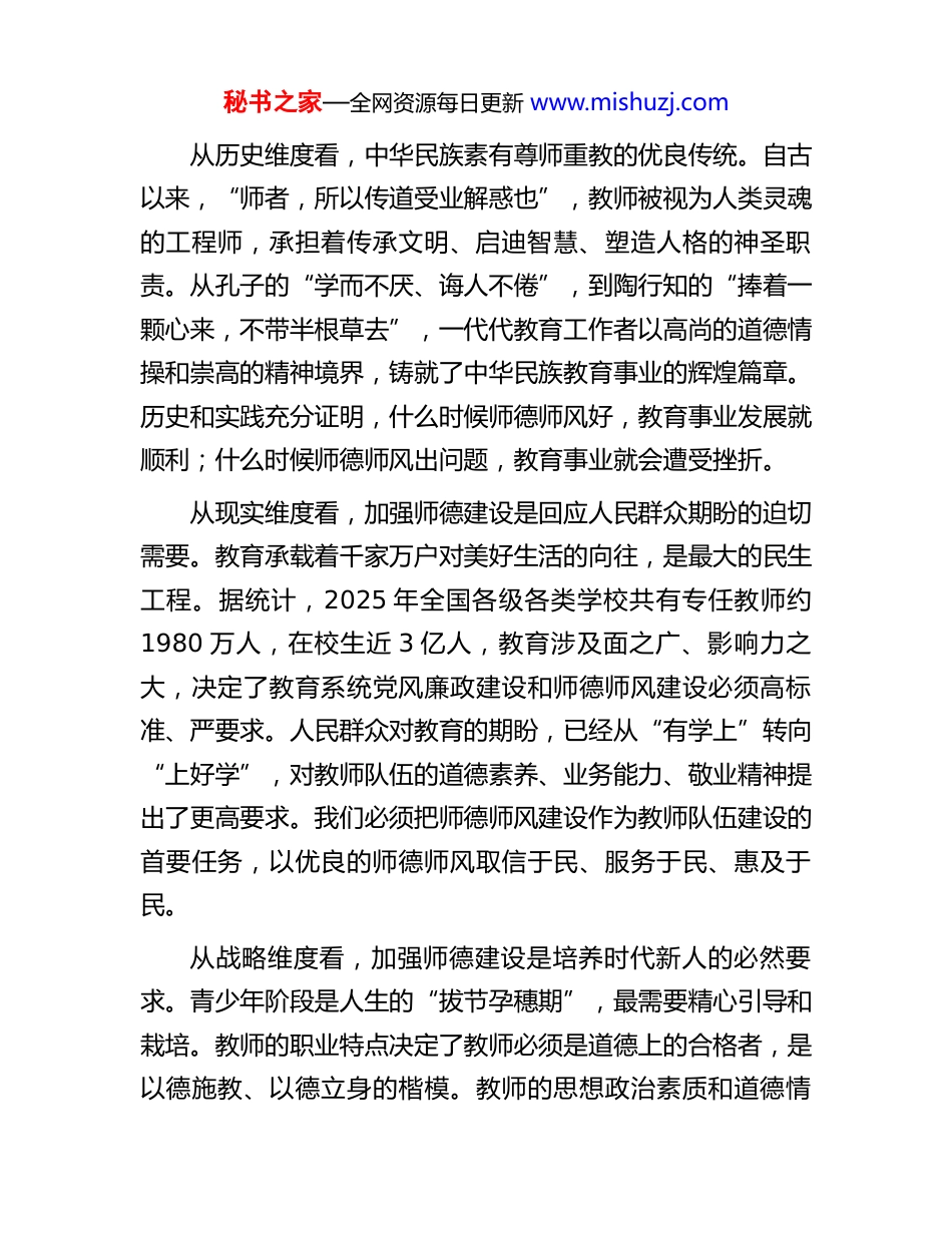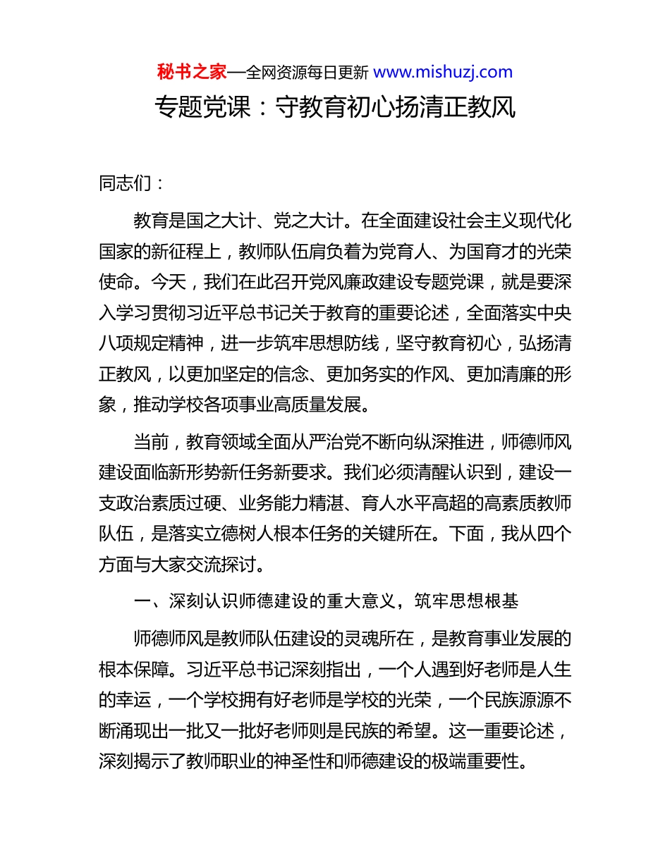 秘书之家—全网资源每日更新 www.mishuzj.com专题党课:守教育初心扬清正教风同志们:教育是国之大计、党之大计。在全面建设社会主义现代化国家的新征程上,教师队伍肩负着为党育人、为国育才的光荣使命。今天,我们在此召开党风廉政建设专题党课,就是要深入学习贯彻习近平总书记关于教育的重要论述,全面落实中央八项规定精神,进一步筑牢思想防线,坚守教育初心,弘扬清正教风,以更加坚定的信念、更加务实的作风、更加清廉的形象,推动学校各项事业高质量发展。当前,教育领域全面从严治党不断向纵深推进,师德师风建设面临新形势新任务新要求。我们必须清醒认识到,建设一支政治素质过硬、业务能力精湛、育人水平高超的高素质教师队伍,是落实立德树人根本任务的关键所在。下面,我从四个方面与大家交流探讨。一、深刻认识师德建设的重大意义,筑牢思想根基师德师风是教师队伍建设的灵魂所在,是教育事业发展的根本保障。习近平总书记深刻指出,一个人遇到好老师是人生的幸运,一个学校拥有好老师是学校的光荣,一个民族源源不断涌现出一批又一批好老师则是民族的希望。这一重要论述,深刻揭示了教师职业的神圣性和师德建设的极端重要性。秘书之家—全网资源每日更新 www.mishuzj.com从历史维度看,中华民族素有尊师重教的优良传统。自古以来,“师者,所以传道受业解惑也”,教师被视为人类灵魂的工程师,承担着传承文明、启迪智慧、塑造人格的神圣职责。从孔子的“学而不厌、诲人不倦”,到陶行知的“捧着一颗心来,不带半根草去”,一代代教育工作者以高尚的道德情操和崇高的精神境界,铸就了中华民族教育事业的辉煌篇章。历史和实践充分证明,什么时候师德师风好,教育事业发展就顺利;什么时候师德师风出问题,教育事业就会遭受挫折。从现实维度看,加强师德建设是回应人民群众期盼的迫切需要。教育承载着千家万户对美好生活的向往,是最大的民生工程。据统计,2025 年全国各级各类学校共有专任教师约1980 万人,在校生近 3 亿人,教育涉及面之广、影响力之大,决定了教育系统党风廉政建设和师德师风建设必须高标准、严要求。人民群众对教育的期盼,已经从“有学上”转向“上好学”,对教师队伍的道德素养、业务能力、敬业精神提出了更高要求。我们必须把师德师风建设作为教师队伍建设的首要任务,以优良的师德师风取信于民、服务于民、惠及于民。从战略维度看,加强师德建设是培养时代新人的必然要求。青少年阶段是人生的“拔节孕穗期”,最需要精心引导和栽培。教师的职业特点决定了教师必须是道德上的合格者,是以德施教、以德立身的楷模。教师的思想政治素质和道德情秘书之家—全网资源每日更新 www.mishuzj.com操,直接影响着学生的价值取向和人生航向。当前,世界百年未有之大变局加速演进,各种思想文化交流交融交锋更加频繁,意识形态领域斗争尖锐复杂。教师作为学生成长的引路人,必须具备坚定的政治立场、正确的价值观念和高尚的道德情操,才能帮助青少年扣好人生第一粒扣子,培养担当民族复兴大任的时代新人。从纪律维度看,加强师德建设是推进全面从严治党的内在要求。党的十八大以来,以习近平同志为核心的党中央把全面从严治党纳入“四个全面”战略布局,以坚定决心、空前力度推进党风廉政建设和反腐败斗争。教育系统不是真空地带,全面从严治党必须向基层延伸、向纵深发展。我们必须深刻认识到,师德师风问题本质上是党性问题、作风问题,师德师风建设是教育系统全面从严治党的重要组成部分。只有把师德师风建设抓紧抓实,才能营造风清气正的教育生态,才能为教育事业高质量发展提供坚强保障。同志们,师德师风建设是一项系统工程,涉及思想建设、制度建设、监督管理等多个方面。我们必须从政治高度、全局视野、战略思维来认识和把握师德建设的重大意义,切实增强责任感和使命感,把师德师风建设摆在更加突出的位置,常抓不懈、久久为功。二、深入践行职业行为准则,恪守从教底线秘书之家—全网资源每日更新 www.mishuzj.com制度是管根本、管长远的。2018 年,教育部印发《新时代中小学教师职业行为十项准则》,明确提出了坚定政治方向、自觉爱...