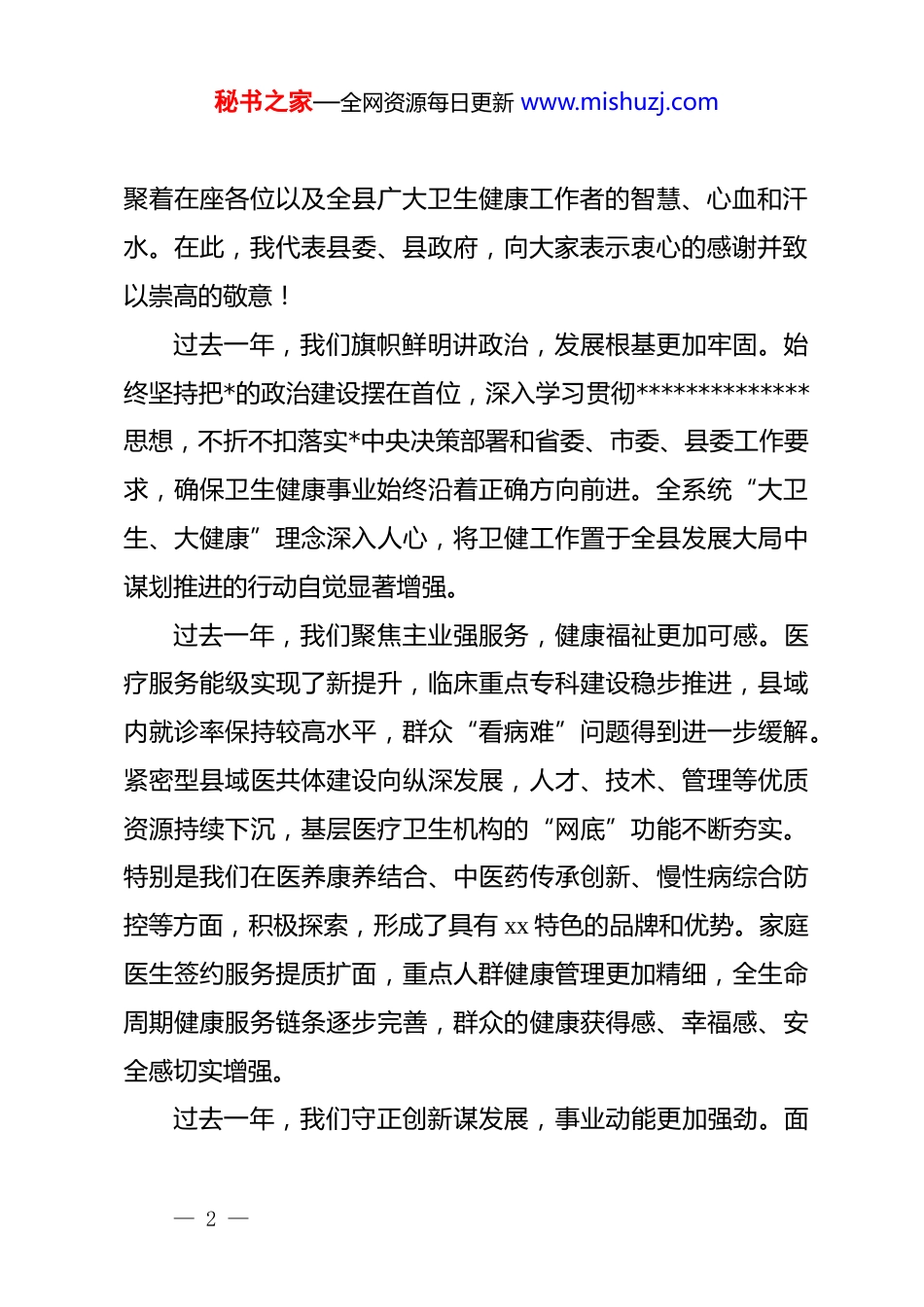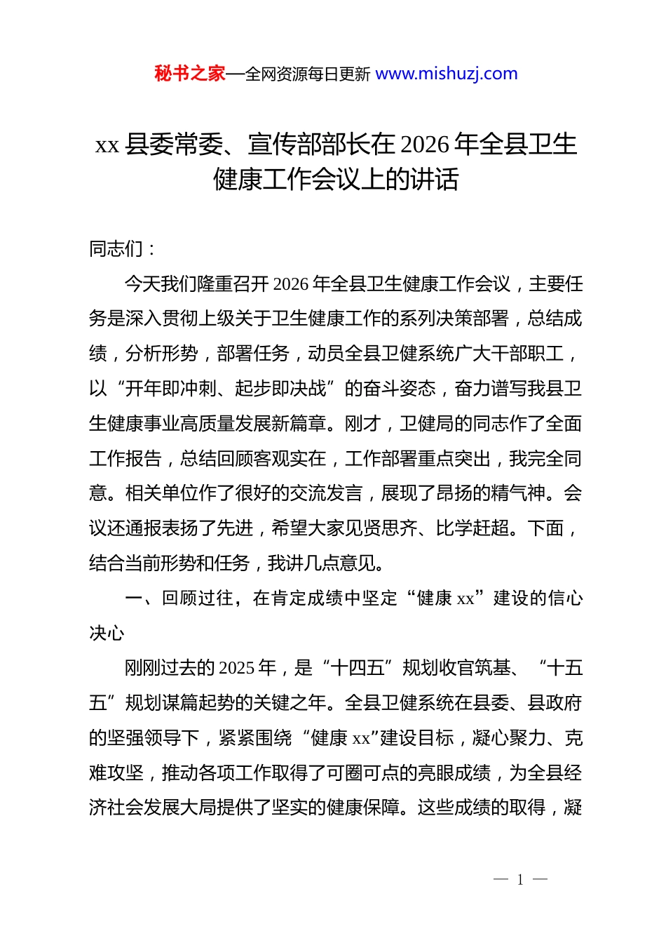 秘书之家—全网资源每日更新 www.mishuzj.comxx 县委常委、宣传部部长在 2026 年全县卫生健康工作会议上的讲话同志们:今天我们隆重召开 2026 年全县卫生健康工作会议,主要任务是深入贯彻上级关于卫生健康工作的系列决策部署,总结成绩,分析形势,部署任务,动员全县卫健系统广大干部职工,以“开年即冲刺、起步即决战”的奋斗姿态,奋力谱写我县卫生健康事业高质量发展新篇章。刚才,卫健局的同志作了全面工作报告,总结回顾客观实在,工作部署重点突出,我完全同意。相关单位作了很好的交流发言,展现了昂扬的精气神。会议还通报表扬了先进,希望大家见贤思齐、比学赶超。下面,结合当前形势和任务,我讲几点意见。一、回顾过往,在肯定成绩中坚定“健康 xx”建设的信心决心刚刚过去的 2025 年,是“十四五”规划收官筑基、“十五五”规划谋篇起势的关键之年。全县卫健系统在县委、县政府的坚强领导下,紧紧围绕“健康 xx”建设目标,凝心聚力、克难攻坚,推动各项工作取得了可圈可点的亮眼成绩,为全县经济社会发展大局提供了坚实的健康保障。这些成绩的取得,凝— 1 —秘书之家—全网资源每日更新 www.mishuzj.com聚着在座各位以及全县广大卫生健康工作者的智慧、心血和汗水。在此,我代表县委、县政府,向大家表示衷心的感谢并致以崇高的敬意!过去一年,我们旗帜鲜明讲政治,发展根基更加牢固。始终坚持把*的政治建设摆在首位,深入学习贯彻**************思想,不折不扣落实*中央决策部署和省委、市委、县委工作要求,确保卫生健康事业始终沿着正确方向前进。全系统“大卫生、大健康”理念深入人心,将卫健工作置于全县发展大局中谋划推进的行动自觉显著增强。过去一年,我们聚焦主业强服务,健康福祉更加可感。医疗服务能级实现了新提升,临床重点专科建设稳步推进,县域内就诊率保持较高水平,群众“看病难”问题得到进一步缓解。紧密型县域医共体建设向纵深发展,人才、技术、管理等优质资源持续下沉,基层医疗卫生机构的“网底”功能不断夯实。特别是我们在医养康养结合、中医药传承创新、慢性病综合防控等方面,积极探索,形成了具有 xx 特色的品牌和优势。家庭医生签约服务提质扩面,重点人群健康管理更加精细,全生命周期健康服务链条逐步完善,群众的健康获得感、幸福感、安全感切实增强。过去一年,我们守正创新谋发展,事业动能更加强劲。面— 2 —秘书之家—全网资源每日更新 www.mishuzj.com对人口结构变化、疾病谱系转变、群众健康需求升级等多重挑战,全县卫健系统没有畏难退缩,而是主动作为,在深化医药卫生体制改革、优化健康产业发展环境、推动“卫健经济”与县域经济融合等方面,进行了富有成效的探索。与高等院校、科研机构的合作更加紧密,产研融合成果转化初见成效。公共卫生应急管理体系在实战中经受住了考验,重大传染病防控和突发公共卫生事件处置能力得到锤炼和提升。事非经过不知难,成如容易却艰辛。回顾一年来的奋斗历程,我们更加深刻地认识到:必须坚持*的全面领导,把牢事业发展的“定盘星”;必须坚持以人民为中心,筑牢执政为民的“压舱石”;必须坚持改革创新,激活高质量发展的“动力源”;必须坚持系统观念,下好统筹协调的“一盘棋”;必须坚持实干担当,锤炼敢打必胜的“硬作风”。这些在实践中积累的宝贵经验,值得我们继续坚持和发扬。二、审时度势,在把握大局中明晰卫生健康事业的时代方位2026 年,是中华人民共和国成立 77 周年,是实施“十五五”规划的开局之年。做好今年的卫生健康工作,责任重大,意义深远。我们必须胸怀“国之大者”,深刻认识卫生健康工作在*和国家事业全局中的特殊重要地位,自觉将各项工作置于— 3 —秘书之家—全网资源每日更新 www.mishuzj.com中国式现代化宏伟蓝图中来定位和推动。从宏观战略看,卫生健康是“国之大者”。*的二十大对推进健康中国建设作出了全面部署,强调要把保障人民健康放在优先发展的战略位置。当前,我国社会主要矛盾已经转化为人民日益增长的美好生活需要和不平衡不充分的发展之间的矛盾,而健康是美好生活最重要的基石,也是最普惠的民生福祉。随...