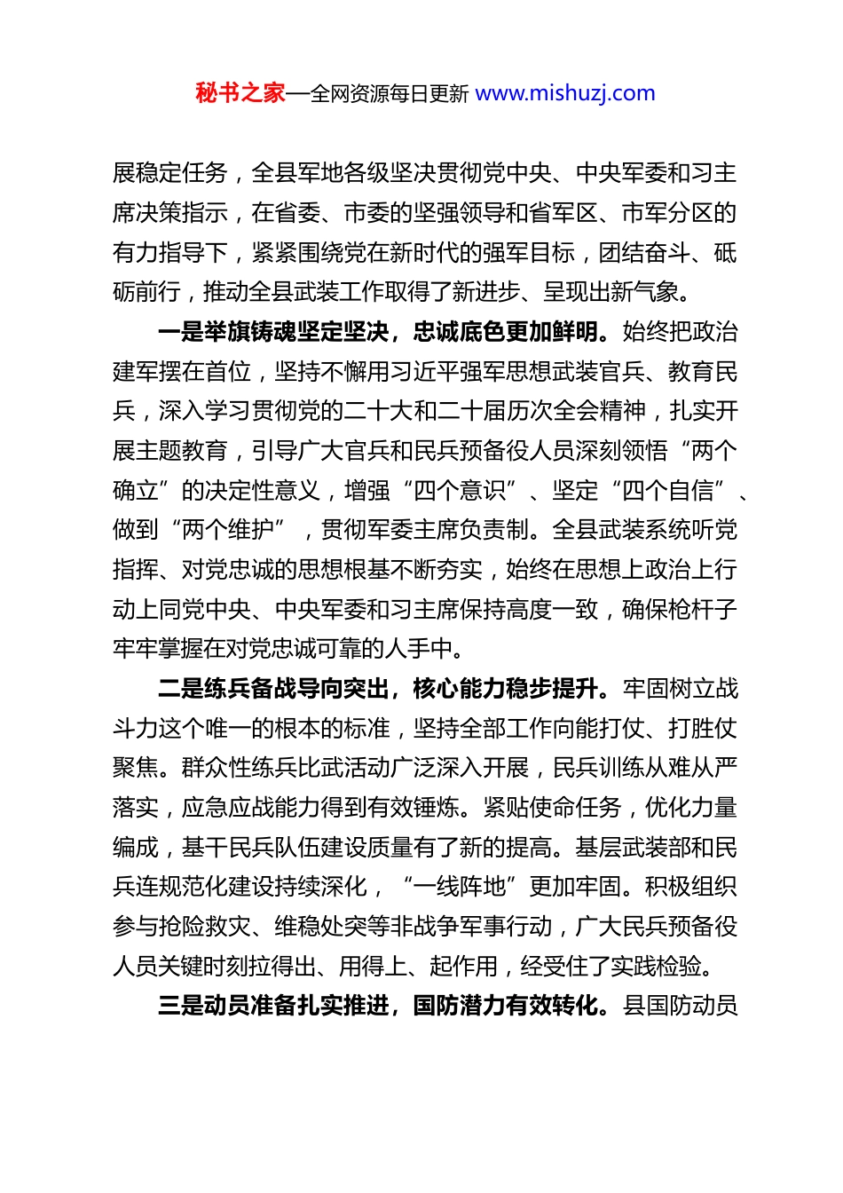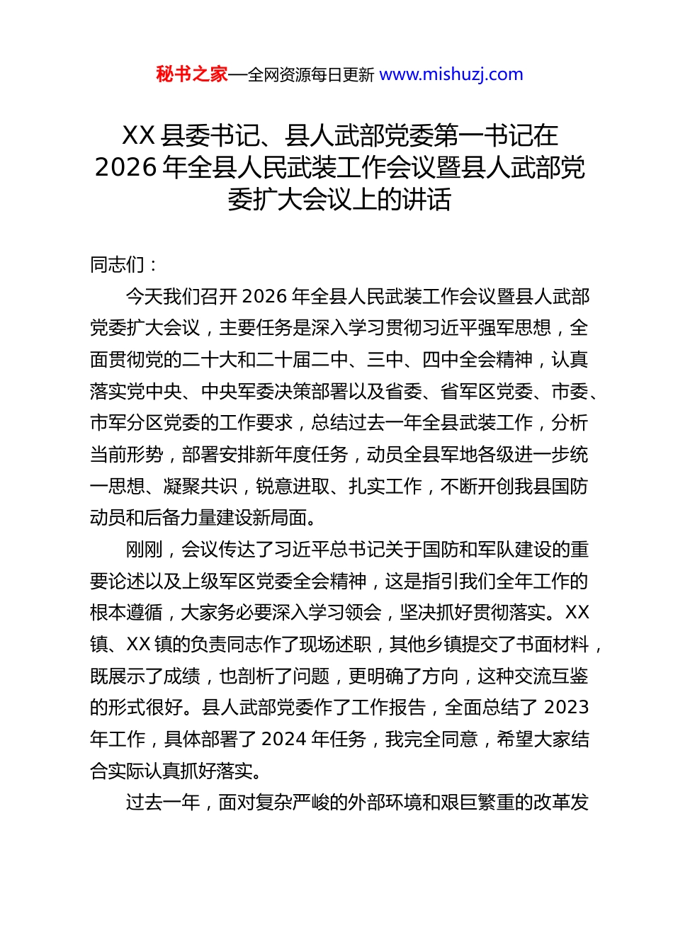秘书之家—全网资源每日更新 www.mishuzj.comXX 县委书记、县人武部党委第一书记在2026 年全县人民武装工作会议暨县人武部党委扩大会议上的讲话同志们:今天我们召开 2026 年全县人民武装工作会议暨县人武部党委扩大会议,主要任务是深入学习贯彻习近平强军思想,全面贯彻党的二十大和二十届二中、三中、四中全会精神,认真落实党中央、中央军委决策部署以及省委、省军区党委、市委、市军分区党委的工作要求,总结过去一年全县武装工作,分析当前形势,部署安排新年度任务,动员全县军地各级进一步统一思想、凝聚共识,锐意进取、扎实工作,不断开创我县国防动员和后备力量建设新局面。刚刚,会议传达了习近平总书记关于国防和军队建设的重要论述以及上级军区党委全会精神,这是指引我们全年工作的根本遵循,大家务必要深入学习领会,坚决抓好贯彻落实。XX镇、XX 镇的负责同志作了现场述职,其他乡镇提交了书面材料,既展示了成绩,也剖析了问题,更明确了方向,这种交流互鉴的形式很好。县人武部党委作了工作报告,全面总结了 2023年工作,具体部署了 2024 年任务,我完全同意,希望大家结合实际认真抓好落实。过去一年,面对复杂严峻的外部环境和艰巨繁重的改革发秘书之家—全网资源每日更新 www.mishuzj.com展稳定任务,全县军地各级坚决贯彻党中央、中央军委和习主席决策指示,在省委、市委的坚强领导和省军区、市军分区的有力指导下,紧紧围绕党在新时代的强军目标,团结奋斗、砥砺前行,推动全县武装工作取得了新进步、呈现出新气象。一是举旗铸魂坚定坚决,忠诚底色更加鲜明。始终把政治建军摆在首位,坚持不懈用习近平强军思想武装官兵、教育民兵,深入学习贯彻党的二十大和二十届历次全会精神,扎实开展主题教育,引导广大官兵和民兵预备役人员深刻领悟“两个确立”的决定性意义,增强“四个意识”、坚定“四个自信”、做到“两个维护”,贯彻军委主席负责制。全县武装系统听党指挥、对党忠诚的思想根基不断夯实,始终在思想上政治上行动上同党中央、中央军委和习主席保持高度一致,确保枪杆子牢牢掌握在对党忠诚可靠的人手中。二是练兵备战导向突出,核心能力稳步提升。牢固树立战斗力这个唯一的根本的标准,坚持全部工作向能打仗、打胜仗聚焦。群众性练兵比武活动广泛深入开展,民兵训练从难从严落实,应急应战能力得到有效锤炼。紧贴使命任务,优化力量编成,基干民兵队伍建设质量有了新的提高。基层武装部和民兵连规范化建设持续深化,“一线阵地”更加牢固。积极组织参与抢险救灾、维稳处突等非战争军事行动,广大民兵预备役人员关键时刻拉得出、用得上、起作用,经受住了实践检验。三是动员准备扎实推进,国防潜力有效转化。县国防动员秘书之家—全网资源每日更新 www.mishuzj.com委员会各成员单位履职尽责,机制运行更加顺畅高效。常态化开展国防潜力调查,数据更新及时,底数清晰。征兵工作坚持高质量高标准,严把体格检查、政治考核、审批定兵等关口,圆满完成了年度新兵征集任务,为部队输送了一批政治合格、素质优良的兵员。军民融合发展战略深入实施,在基础设施共建、科技协同创新、产业融合发展等方面进行了有益探索,军地需求对接更加精准。四是双拥共建持续深化,军政军民团结巩固。大力弘扬“军民一家亲”的优良传统和光荣革命传统,用心用情做好拥军优属工作,严格落实各项优抚安置政策,着力解决官兵“三后”问题。军地互提需求、互办实事“双清单”制度得到有效落实,一批涉及训练场地、家属就业、子女入学等方面的实际困难得到妥善解决。驻县部队和广大官兵视驻地为故乡,把群众当亲人,在完成军事任务的同时,积极投身地方经济社会发展,在乡村振兴、生态保护、文明创建等工作中主动作为,特别是在应对突发自然灾害时冲锋在前,发挥了生力军和突击队作用,为全县改革发展稳定大局作出了突出贡献,赢得了全县人民的高度赞誉。在此,我代表县委、县政府和全县人民,向辛勤工作在国防动员和后备力量建设一线的全体官兵、文职人员、职工和广大民兵预备役人员,表示衷心的感谢并致以诚挚的问候!在肯定成绩的同时,我们也要清醒看到工作中存...