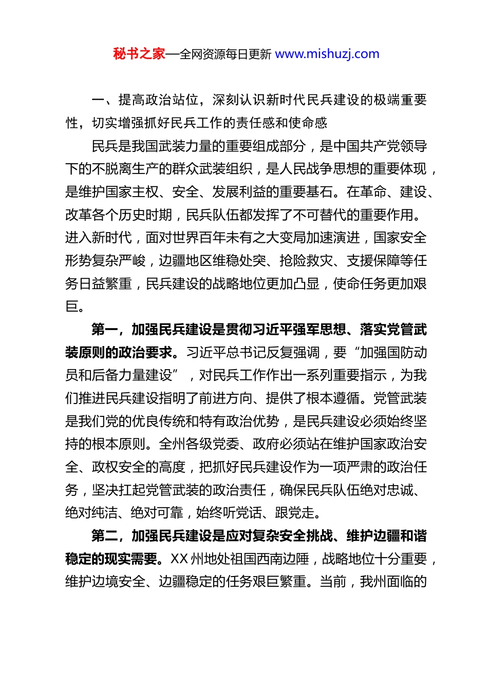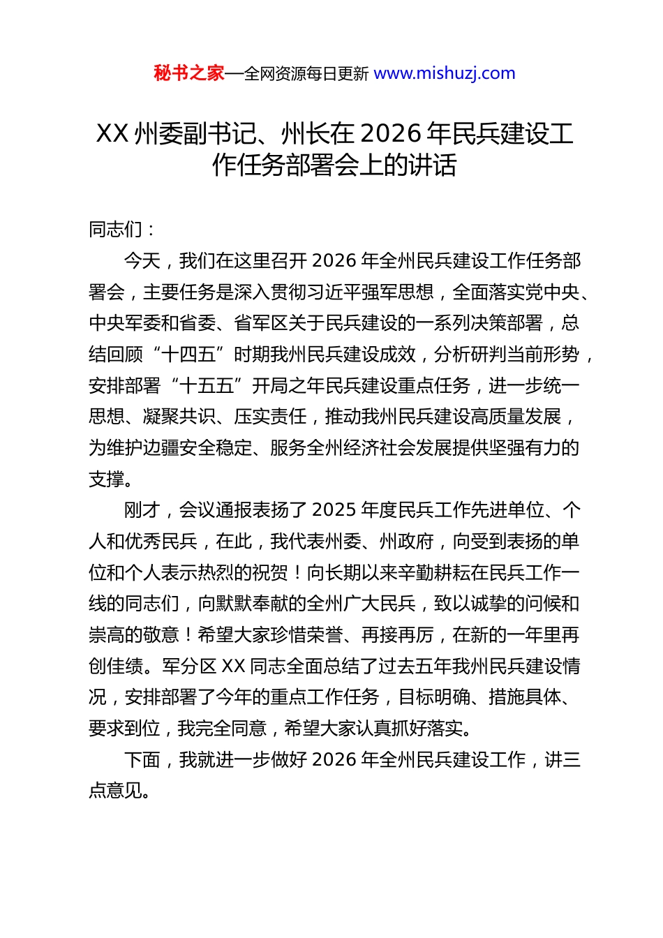 秘书之家—全网资源每日更新 www.mishuzj.comXX 州委副书记、州长在 2026 年民兵建设工作任务部署会上的讲话同志们:今天,我们在这里召开 2026 年全州民兵建设工作任务部署会,主要任务是深入贯彻习近平强军思想,全面落实党中央、中央军委和省委、省军区关于民兵建设的一系列决策部署,总结回顾“十四五”时期我州民兵建设成效,分析研判当前形势,安排部署“十五五”开局之年民兵建设重点任务,进一步统一思想、凝聚共识、压实责任,推动我州民兵建设高质量发展,为维护边疆安全稳定、服务全州经济社会发展提供坚强有力的支撑。刚才,会议通报表扬了 2025 年度民兵工作先进单位、个人和优秀民兵,在此,我代表州委、州政府,向受到表扬的单位和个人表示热烈的祝贺!向长期以来辛勤耕耘在民兵工作一线的同志们,向默默奉献的全州广大民兵,致以诚挚的问候和崇高的敬意!希望大家珍惜荣誉、再接再厉,在新的一年里再创佳绩。军分区 XX 同志全面总结了过去五年我州民兵建设情况,安排部署了今年的重点工作任务,目标明确、措施具体、要求到位,我完全同意,希望大家认真抓好落实。下面,我就进一步做好 2026 年全州民兵建设工作,讲三点意见。秘书之家—全网资源每日更新 www.mishuzj.com一、提高政治站位,深刻认识新时代民兵建设的极端重要性,切实增强抓好民兵工作的责任感和使命感民兵是我国武装力量的重要组成部分,是中国共产党领导下的不脱离生产的群众武装组织,是人民战争思想的重要体现,是维护国家主权、安全、发展利益的重要基石。在革命、建设、改革各个历史时期,民兵队伍都发挥了不可替代的重要作用。进入新时代,面对世界百年未有之大变局加速演进,国家安全形势复杂严峻,边疆地区维稳处突、抢险救灾、支援保障等任务日益繁重,民兵建设的战略地位更加凸显,使命任务更加艰巨。第一,加强民兵建设是贯彻习近平强军思想、落实党管武装原则的政治要求。习近平总书记反复强调,要“加强国防动员和后备力量建设”,对民兵工作作出一系列重要指示,为我们推进民兵建设指明了前进方向、提供了根本遵循。党管武装是我们党的优良传统和特有政治优势,是民兵建设必须始终坚持的根本原则。全州各级党委、政府必须站在维护国家政治安全、政权安全的高度,把抓好民兵建设作为一项严肃的政治任务,坚决扛起党管武装的政治责任,确保民兵队伍绝对忠诚、绝对纯洁、绝对可靠,始终听党话、跟党走。第二,加强民兵建设是应对复杂安全挑战、维护边疆和谐稳定的现实需要。XX 州地处祖国西南边陲,战略地位十分重要,维护边境安全、边疆稳定的任务艰巨繁重。当前,我州面临的秘书之家—全网资源每日更新 www.mishuzj.com外部环境更趋复杂,传统安全威胁与非传统安全威胁相互交织,反恐维稳、边境管控、应急处突等压力持续增大。民兵队伍作为“建在身边、抓在手中、用在关键”的可靠力量,在配合部队作战、参与维稳控边、遂行应急任务等方面具有独特优势和不可替代的作用。只有建强建好民兵队伍,我们才能有效应对各种风险挑战,牢牢守住不发生系统性安全风险的底线,确保边疆长治久安。第三,加强民兵建设是服务经济社会发展、提升应急治理能力的重要支撑。民兵队伍寓兵于民、亦兵亦民,既是国防力量的重要组成部分,也是经济社会建设的重要力量。在参与地方经济建设、乡村振兴、生态保护、民族团结进步创建等方面,广大民兵发挥了生力军和突击队作用。特别是在抢险救灾、疫情防控、森林防火等急难险重任务面前,我州民兵总是冲锋在前、勇挑重担,展现了过硬的素质和优良的作风。进入“十五五”开局之年,面对高质量发展与高水平安全良性互动的新要求,迫切需要我们将民兵建设深度融入应急管理体系和基层治理体系,使这支队伍在服务经济社会发展、保障人民生命财产安全中发挥更大作用。全州各级各部门要进一步提高政治站位,深刻认识加强民兵建设是巩固党的执政地位、维护国家长治久安、保障人民幸福安康的战略之举,切实增强抓好民兵工作的思想自觉、政治自觉和行动自觉,以更高标准、更实举措、更大力度,推动我秘书之家—全网资源每日更新 www.mishuzj.com州民兵建...