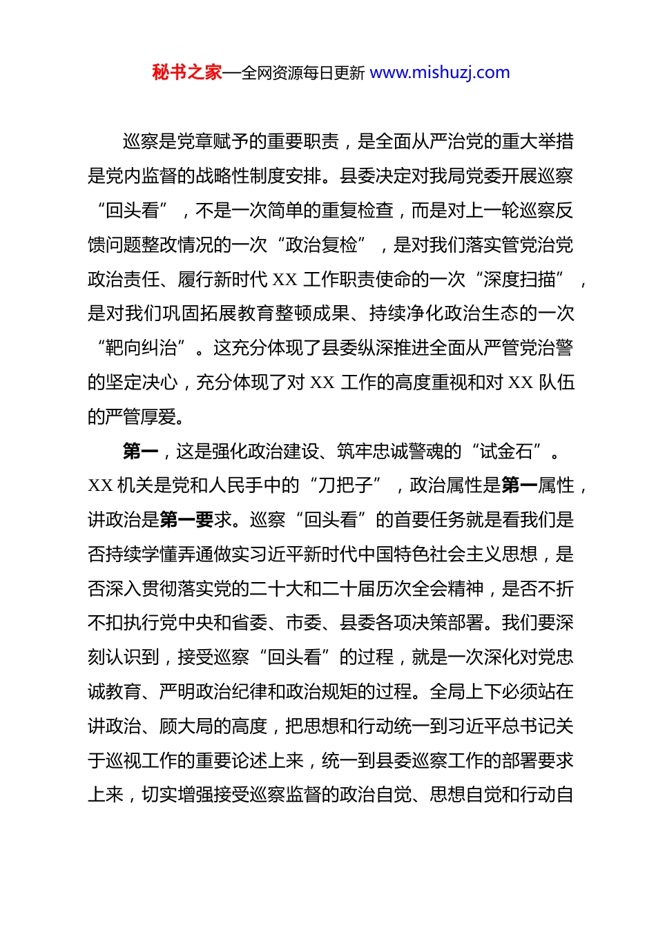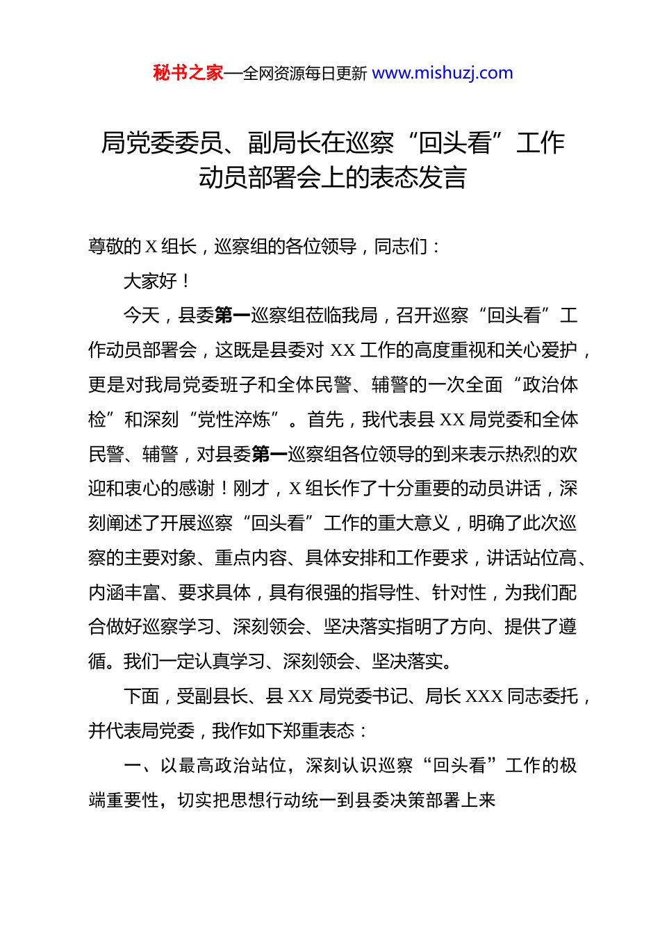秘书之家—全网资源每日更新 www.mishuzj.com局党委委员、副局长在巡察“回头看”工作动员部署会上的表态发言 尊敬的 X 组长,巡察组的各位领导,同志们:大家好!今天,县委第一巡察组莅临我局,召开巡察“回头看”工作动员部署会,这既是县委对 XX 工作的高度重视和关心爱护,更是对我局党委班子和全体民警、辅警的一次全面“政治体检”和深刻“党性淬炼”。首先,我代表县 XX 局党委和全体民警、辅警,对县委第一巡察组各位领导的到来表示热烈的欢迎和衷心的感谢!刚才,X 组长作了十分重要的动员讲话,深刻阐述了开展巡察“回头看”工作的重大意义,明确了此次巡察的主要对象、重点内容、具体安排和工作要求,讲话站位高、内涵丰富、要求具体,具有很强的指导性、针对性,为我们配合做好巡察学习、深刻领会、坚决落实指明了方向、提供了遵循。我们一定认真学习、深刻领会、坚决落实。下面,受副县长、县 XX 局党委书记、局长 XXX 同志委托,并代表局党委,我作如下郑重表态:一、以最高政治站位,深刻认识巡察“回头看”工作的极端重要性,切实把思想行动统一到县委决策部署上来秘书之家—全网资源每日更新 www.mishuzj.com巡察是党章赋予的重要职责,是全面从严治党的重大举措是党内监督的战略性制度安排。县委决定对我局党委开展巡察“回头看”,不是一次简单的重复检查,而是对上一轮巡察反馈问题整改情况的一次“政治复检”,是对我们落实管党治党政治责任、履行新时代 XX 工作职责使命的一次“深度扫描”,是对我们巩固拓展教育整顿成果、持续净化政治生态的一次“靶向纠治”。这充分体现了县委纵深推进全面从严管党治警的坚定决心,充分体现了对 XX 工作的高度重视和对 XX 队伍的严管厚爱。第一,这是强化政治建设、筑牢忠诚警魂的“试金石”。 XX 机关是党和人民手中的“刀把子”,政治属性是第一属性,讲政治是第一要求。巡察“回头看”的首要任务就是看我们是否持续学懂弄通做实习近平新时代中国特色社会主义思想,是否深入贯彻落实党的二十大和二十届历次全会精神,是否不折不扣执行党中央和省委、市委、县委各项决策部署。我们要深刻认识到,接受巡察“回头看”的过程,就是一次深化对党忠诚教育、严明政治纪律和政治规矩的过程。全局上下必须站在讲政治、顾大局的高度,把思想和行动统一到习近平总书记关于巡视工作的重要论述上来,统一到县委巡察工作的部署要求上来,切实增强接受巡察监督的政治自觉、思想自觉和行动自秘书之家—全网资源每日更新 www.mishuzj.com觉。要把这次巡察“回头看”作为检验我们“四个意识”强不强、“四个自信”坚定不坚定、“两个维护”坚决不坚决的“试金石”,始终在政治立场、政治方向、政治原则、政治道路上同党中央保持高度一致,确保 XX 队伍绝对忠诚、绝对纯洁、绝对可靠。第二,这是检验整改成效、巩固拓展成果的“助推器”。巡察工作的生命力在于成果运用,关键在于问题整改。上一轮巡察为我们精准把脉、开出良方,帮助我们解决了一批长期想解决而未解决的难题。但整改工作只有进行时,没有完成时。这次“回头看”,就是要聚焦上轮巡察反馈问题的整改落实情况,重点检查整改责任是否压实、整改措施是否落地、整改效果是否持久、长效机制是否建立。我们要防止问题反弹回潮,坚决杜绝“纸面整改”“虚假整改”,是对我们整改决心、整改态度、整改能力的再次检验。全局上下要以“永远在路上”的执着,对巡察整改工作再审视、再盘点、再深化,决不能有“闯关”思想,决不能有“歇脚”念头,必须以实实在在的整改成效,向县委和全县人民交出一份满意的答卷。第三,这是推动 XX 工作高质量发展、提升履职能力的“动力源”。当前,我县正处在高质量发展的关键时期,维护国家安全、社会安定、人民安宁的任务艰巨繁重。XX 工作面秘书之家—全网资源每日更新 www.mishuzj.com临的风险挑战前所未有,肩负的职责使命更加重大。巡察“回头看”不仅是对我们工作的一次全面检阅,更是帮助我们发现问题、补齐短板、改进工作、推动发展的宝贵契机。我们要把这次巡察“回头看”作为查找工作差距、改进工作作风、...