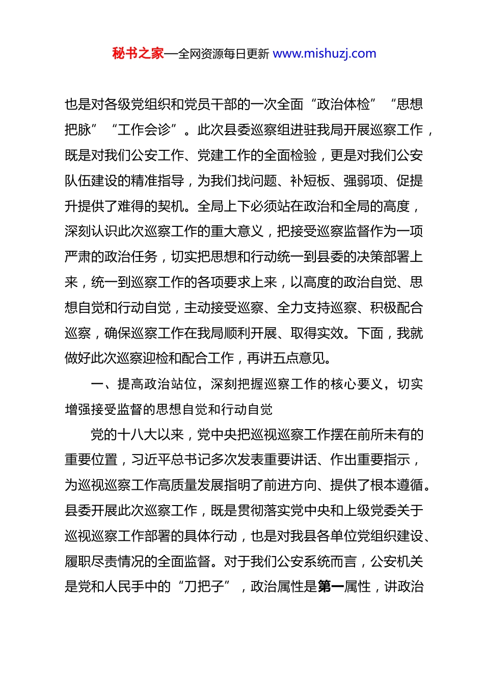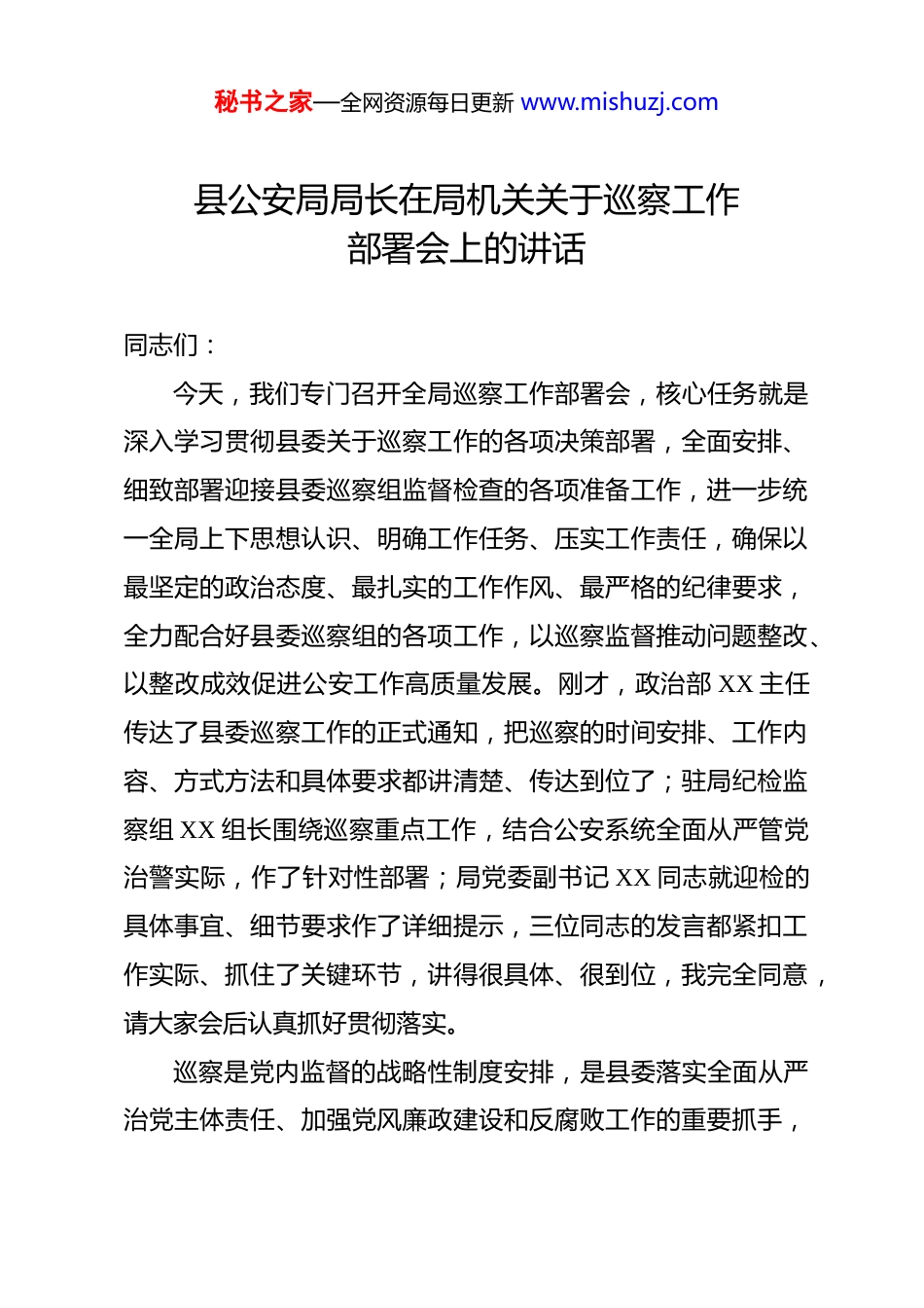 秘书之家—全网资源每日更新 www.mishuzj.com县公安局局长在局机关关于巡察工作部署会上的讲话 同志们:今天,我们专门召开全局巡察工作部署会,核心任务就是深入学习贯彻县委关于巡察工作的各项决策部署,全面安排、细致部署迎接县委巡察组监督检查的各项准备工作,进一步统一全局上下思想认识、明确工作任务、压实工作责任,确保以最坚定的政治态度、最扎实的工作作风、最严格的纪律要求,全力配合好县委巡察组的各项工作,以巡察监督推动问题整改、以整改成效促进公安工作高质量发展。刚才,政治部 XX 主任传达了县委巡察工作的正式通知,把巡察的时间安排、工作内容、方式方法和具体要求都讲清楚、传达到位了;驻局纪检监察组 XX 组长围绕巡察重点工作,结合公安系统全面从严管党治警实际,作了针对性部署;局党委副书记 XX 同志就迎检的具体事宜、细节要求作了详细提示,三位同志的发言都紧扣工作实际、抓住了关键环节,讲得很具体、很到位,我完全同意,请大家会后认真抓好贯彻落实。巡察是党内监督的战略性制度安排,是县委落实全面从严治党主体责任、加强党风廉政建设和反腐败工作的重要抓手,秘书之家—全网资源每日更新 www.mishuzj.com也是对各级党组织和党员干部的一次全面“政治体检”“思想把脉”“工作会诊”。此次县委巡察组进驻我局开展巡察工作,既是对我们公安工作、党建工作的全面检验,更是对我们公安队伍建设的精准指导,为我们找问题、补短板、强弱项、促提升提供了难得的契机。全局上下必须站在政治和全局的高度,深刻认识此次巡察工作的重大意义,把接受巡察监督作为一项严肃的政治任务,切实把思想和行动统一到县委的决策部署上来,统一到巡察工作的各项要求上来,以高度的政治自觉、思想自觉和行动自觉,主动接受巡察、全力支持巡察、积极配合巡察,确保巡察工作在我局顺利开展、取得实效。下面,我就做好此次巡察迎检和配合工作,再讲五点意见。一、提高政治站位,深刻把握巡察工作的核心要义,切实增强接受监督的思想自觉和行动自觉党的十八大以来,党中央把巡视巡察工作摆在前所未有的重要位置,习近平总书记多次发表重要讲话、作出重要指示,为巡视巡察工作高质量发展指明了前进方向、提供了根本遵循。县委开展此次巡察工作,既是贯彻落实党中央和上级党委关于巡视巡察工作部署的具体行动,也是对我县各单位党组织建设、履职尽责情况的全面监督。对于我们公安系统而言,公安机关是党和人民手中的“刀把子”,政治属性是第一属性,讲政治秘书之家—全网资源每日更新 www.mishuzj.com是第一要求,接受县委巡察组的监督检查,更是我们必须履行的政治责任、必须完成的政治任务。第一,要深刻认识到,巡察是一次深刻的政治洗礼。公安机关作为政法机关的重要组成部分,必须始终坚持党对公安工作的绝对领导、全面领导,始终在思想上政治上行动上同以习近平同志为核心的党中央保持高度一致。此次巡察,核心就是看我们是否坚决贯彻落实党中央关于公安工作的各项决策部署,是否严格执行县委、县政府和上级公安机关的工作要求,是否切实履行好党和人民赋予的新时代公安使命任务。全局上下要以此次巡察为契机,深入学习习近平新时代中国特色社会主义思想,特别是习近平法治思想、习近平总书记关于新时代公安工作的重要论述,进一步筑牢政治忠诚、坚定政治立场、提高政治判断力、政治领悟力、政治执行力,切实把“两个维护”体现在具体行动上、落实到公安工作中。第二,要深刻认识到,巡察是一次全面的工作检验。近年来,在县委、县政府和上级公安机关的坚强领导下,全局上下攻坚克难、真抓实干,在维护社会大局稳定、打击违法犯罪、强化社会治安防控、深化基层治理、优化营商环境、服务人民群众等方面取得了一系列成效,队伍建设也呈现出稳中向好的发展态势。但我们也要清醒地认识到,对照新时代公安工作的秘书之家—全网资源每日更新 www.mishuzj.com高质量发展要求,对照县委、县政府的殷切期望,对照人民群众的美好期盼,我们的工作还存在一些差距和不足,党建工作与业务工作融合还不够紧密、部分民警工作作风还不够扎实、一些工作举措落地见效还...