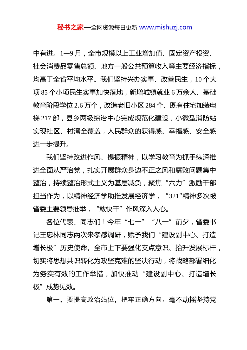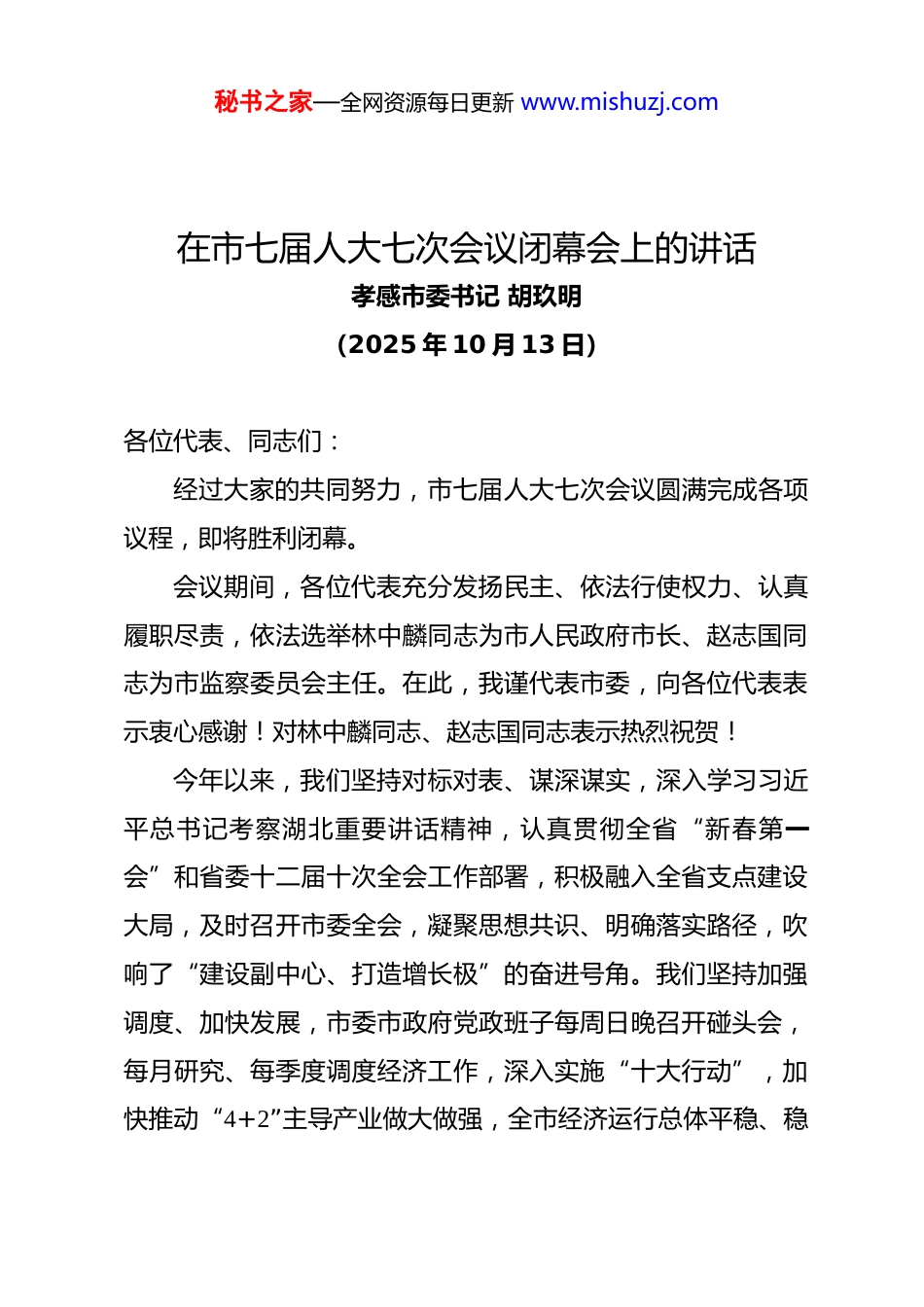 秘书之家—全网资源每日更新 www.mishuzj.com在市七届人大七次会议闭幕会上的讲话孝感市委书记 胡玖明(2025 年 10 月 13 日)各位代表、同志们:经过大家的共同努力,市七届人大七次会议圆满完成各项议程,即将胜利闭幕。会议期间,各位代表充分发扬民主、依法行使权力、认真履职尽责,依法选举林中麟同志为市人民政府市长、赵志国同志为市监察委员会主任。在此,我谨代表市委,向各位代表表示衷心感谢!对林中麟同志、赵志国同志表示热烈祝贺!今年以来,我们坚持对标对表、谋深谋实,深入学习习近平总书记考察湖北重要讲话精神,认真贯彻全省“新春第一会”和省委十二届十次全会工作部署,积极融入全省支点建设大局,及时召开市委全会,凝聚思想共识、明确落实路径,吹响了“建设副中心、打造增长极”的奋进号角。我们坚持加强调度、加快发展,市委市政府党政班子每周日晚召开碰头会,每月研究、每季度调度经济工作,深入实施“十大行动”,加快推动“4+2”主导产业做大做强,全市经济运行总体平稳、稳秘书之家—全网资源每日更新 www.mishuzj.com中有进。1—9 月,全市规模以上工业增加值、固定资产投资、社会消费品零售总额、地方一般公共预算收入等主要经济指标,均高于全省平均水平。我们坚持兴办实事、改善民生,10 个大项 85 个小项民生实事加快落地,新增城镇就业 6 万余人、基础教育阶段学位 2.6 万个,改造老旧小区 284 个、既有住宅加装电梯 217 部,县乡两级综治中心完成规范化建设,小微型消防站实现社区、村湾全覆盖,人民群众的获得感、幸福感、安全感进一步提升。我们坚持改进作风、提振精神,以学习教育为抓手纵深推进全面从严治党,扎实开展群众身边不正之风和腐败问题集中整治,持续整治形式主义为基层减负,聚焦“六力”激励干部担当作为,以精神经济学助推发展经济学,“321”精神多次被省委主要领导推举,“敢快干”作风深入人心。各位代表、同志们!今年“七一”“八一”前夕,省委书记王忠林同志两次来孝感调研,赋予我们“建设副中心、打造增长极”历史使命。全市上下要强化支点意识、抬升发展标杆,切实将思想共识转化为攻坚克难的坚决行动,将战略部署细化为务实有效的工作举措,加快推动“建设副中心、打造增长极”成势见效。第一,要提高政治站位,把牢正确方向。毫不动摇坚持党秘书之家—全网资源每日更新 www.mishuzj.com的全面领导,深刻领悟“两个确立”的决定性意义,把深入贯彻落实习近平总书记考察湖北重要讲话精神,与学习贯彻即将召开的党的二十届四中全会精神结合起来,认真开展“十五五”规划编制工作,谋定后动、谋定快动,推动党中央决策部署和省委工作要求在孝感创造性落实。第二,要抬升发展标杆,主动担当作为。锚定“建设副中心、打造增长极”的战略目标和七大重点任务,按照“一年开新局、五年大变化、十年结硕果”的安排部署,以 1.5 倍的发展系数加压奋进、狠抓落实,奋力建设全国百强城市。要全力以赴大抓工业、大抓招商、大抓项目,持续壮大实体经济,全力建设先进制造业强市。要积极培育新质生产力,完善政产学研金服用“北斗七星式”转化体系,加快打造“全国有一定影响、全省有重要地位”的科技创新成果转化高地。要坚决落实枢纽提能战略,加快构建外联内畅、立体高效的交通体系,争创全国现代商贸流通体系试点城市。要强力推进主城崛起,加快把东城新区打造为产城融合核心示范区,统筹老城更新和新城变新,持续提升主城的首位度、竞争力、带动性。要坚定不移依托武汉、发展孝感,持续深化汉孝规划对接、交通快联、产业协作、科创协同、市场互促、民生共享。第三,要站稳人民立场,切实改善民生。坚持以人民为中秘书之家—全网资源每日更新 www.mishuzj.com心的发展思想,用心用情用力做好衣食住行、业教保医等民生实事。要立足“投资于人”,把政策资金优先投向民生领域,全面提升基本公共服务水平。要持续深化文明城市创建工作,不断提升群众的参与度、满意度。要高标准建设美丽孝感,用铁的手腕、打铁力度治气治水,加快孝云乡村振兴走廊、“两湖绿道”“三个公园”“万树村”建设,让全体人...