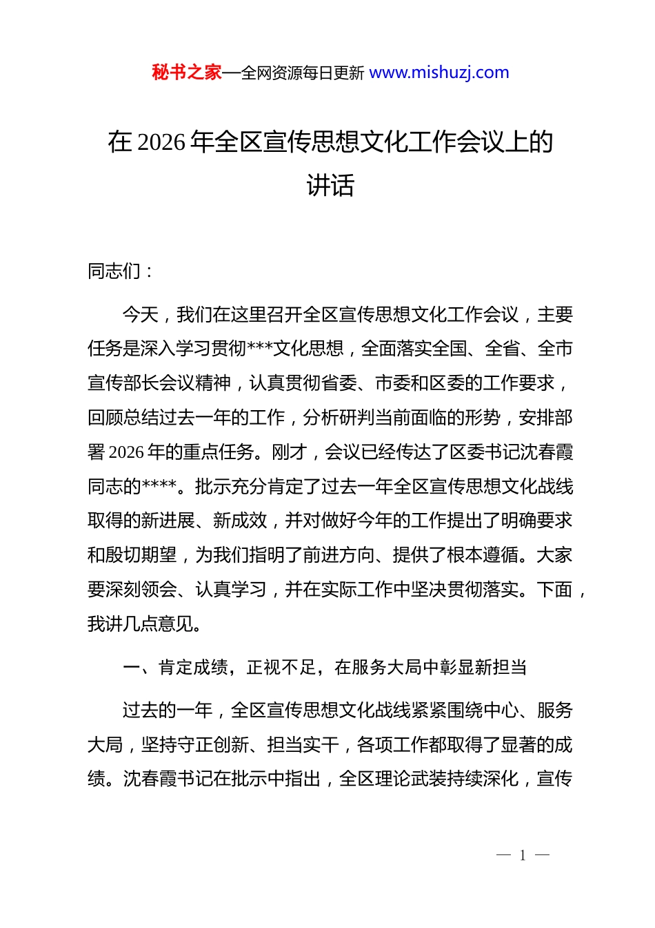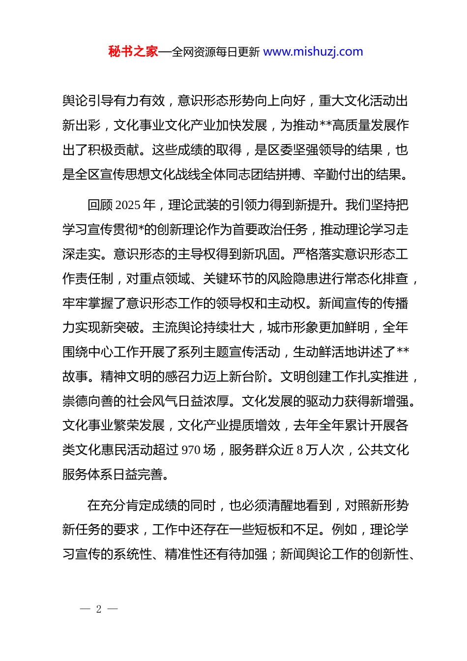 秘书之家—全网资源每日更新 www.mishuzj.com在 2026 年全区宣传思想文化工作会议上的讲话同志们:今天,我们在这里召开全区宣传思想文化工作会议,主要任务是深入学习贯彻***文化思想,全面落实全国、全省、全市宣传部长会议精神,认真贯彻省委、市委和区委的工作要求,回顾总结过去一年的工作,分析研判当前面临的形势,安排部署 2026 年的重点任务。刚才,会议已经传达了区委书记沈春霞同志的****。批示充分肯定了过去一年全区宣传思想文化战线取得的新进展、新成效,并对做好今年的工作提出了明确要求和殷切期望,为我们指明了前进方向、提供了根本遵循。大家要深刻领会、认真学习,并在实际工作中坚决贯彻落实。下面,我讲几点意见。一、肯定成绩,正视不足,在服务大局中彰显新担当过去的一年,全区宣传思想文化战线紧紧围绕中心、服务大局,坚持守正创新、担当实干,各项工作都取得了显著的成绩。沈春霞书记在批示中指出,全区理论武装持续深化,宣传— 1 —秘书之家—全网资源每日更新 www.mishuzj.com舆论引导有力有效,意识形态形势向上向好,重大文化活动出新出彩,文化事业文化产业加快发展,为推动**高质量发展作出了积极贡献。这些成绩的取得,是区委坚强领导的结果,也是全区宣传思想文化战线全体同志团结拼搏、辛勤付出的结果。回顾 2025 年,理论武装的引领力得到新提升。我们坚持把学习宣传贯彻*的创新理论作为首要政治任务,推动理论学习走深走实。意识形态的主导权得到新巩固。严格落实意识形态工作责任制,对重点领域、关键环节的风险隐患进行常态化排查,牢牢掌握了意识形态工作的领导权和主动权。新闻宣传的传播力实现新突破。主流舆论持续壮大,城市形象更加鲜明,全年围绕中心工作开展了系列主题宣传活动,生动鲜活地讲述了**故事。精神文明的感召力迈上新台阶。文明创建工作扎实推进,崇德向善的社会风气日益浓厚。文化发展的驱动力获得新增强。文化事业繁荣发展,文化产业提质增效,去年全年累计开展各类文化惠民活动超过 970 场,服务群众近 8 万人次,公共文化服务体系日益完善。在充分肯定成绩的同时,也必须清醒地看到,对照新形势新任务的要求,工作中还存在一些短板和不足。例如,理论学习宣传的系统性、精准性还有待加强;新闻舆论工作的创新性、— 2 —秘书之家—全网资源每日更新 www.mishuzj.com影响力仍需提升;文化产品和服务的供给质量与群众日益增长的精神文化需求相比还有差距;网络空间治理和意识形态领域的风险挑战依然严峻;干部队伍的能力作风建设还需要进一步强化。对于这些问题,必须高度重视,采取有力措施,在今后的工作中切实加以解决。二、认清形势,把握机遇,在守正创新中明确新方位2026 年是中华人民共和国成立 77 周年,是中国共产*成立105 周年,是实施“十五五”规划的开局之年,也是**建市 70周年、**建区 50 周年的重要年份。站在新的历史起点上,宣传思想文化工作面临着新的时代背景和历史任务,其地位作用更加重要,肩负的责任使命也更加重大。从宏观层面看,世界百年未有之大变局加速演进,各种思想文化交流交融交锋更加频繁,意识形态领域的斗争尖锐复杂,这对我们维护意识 tain 意识形态安全、掌握舆论主导权提出了更高要求。从发展层面看,人民群众对高质量精神文化生活的需求日益增长,对文化产品和服务的品质、内涵、形式都有了新的期待,这对我们推动文化繁荣、提升服务效能提出了更高要求。从区域层面看,**正处在转型升级、跨越发展的关键时期,“十五五”规划的顺利开局,需要强大的思想保证、丰润— 3 —秘书之家—全网资源每日更新 www.mishuzj.com的道德滋养、有力的舆论支持和良好的文化条件。因此,全区宣传思想文化战线必须胸怀“国之大者”,准确把握新的历史方位和时代坐标,深刻认识肩负的职责使命,增强工作的预见性、主动性和创造性。要自觉把宣传思想文化工作放到全区发展大局中去思考、去谋划、去推进,以高度的政治责任感和历史使命感,切实担负起举旗帜、聚民心、育新人、兴文化、展形象的使命任务。三、聚焦重点,狠抓落实,在奋发有为中开创新局面做好今...