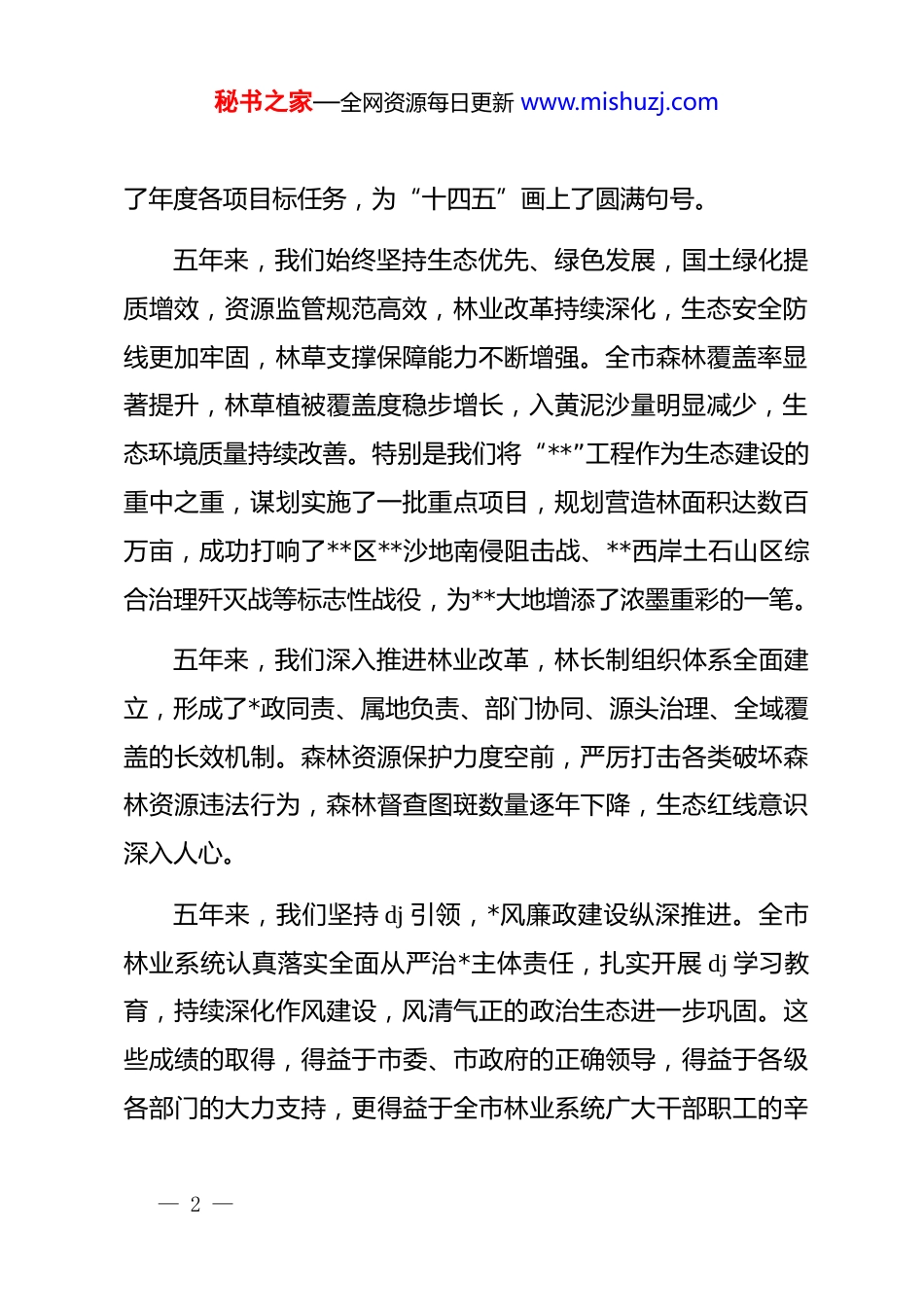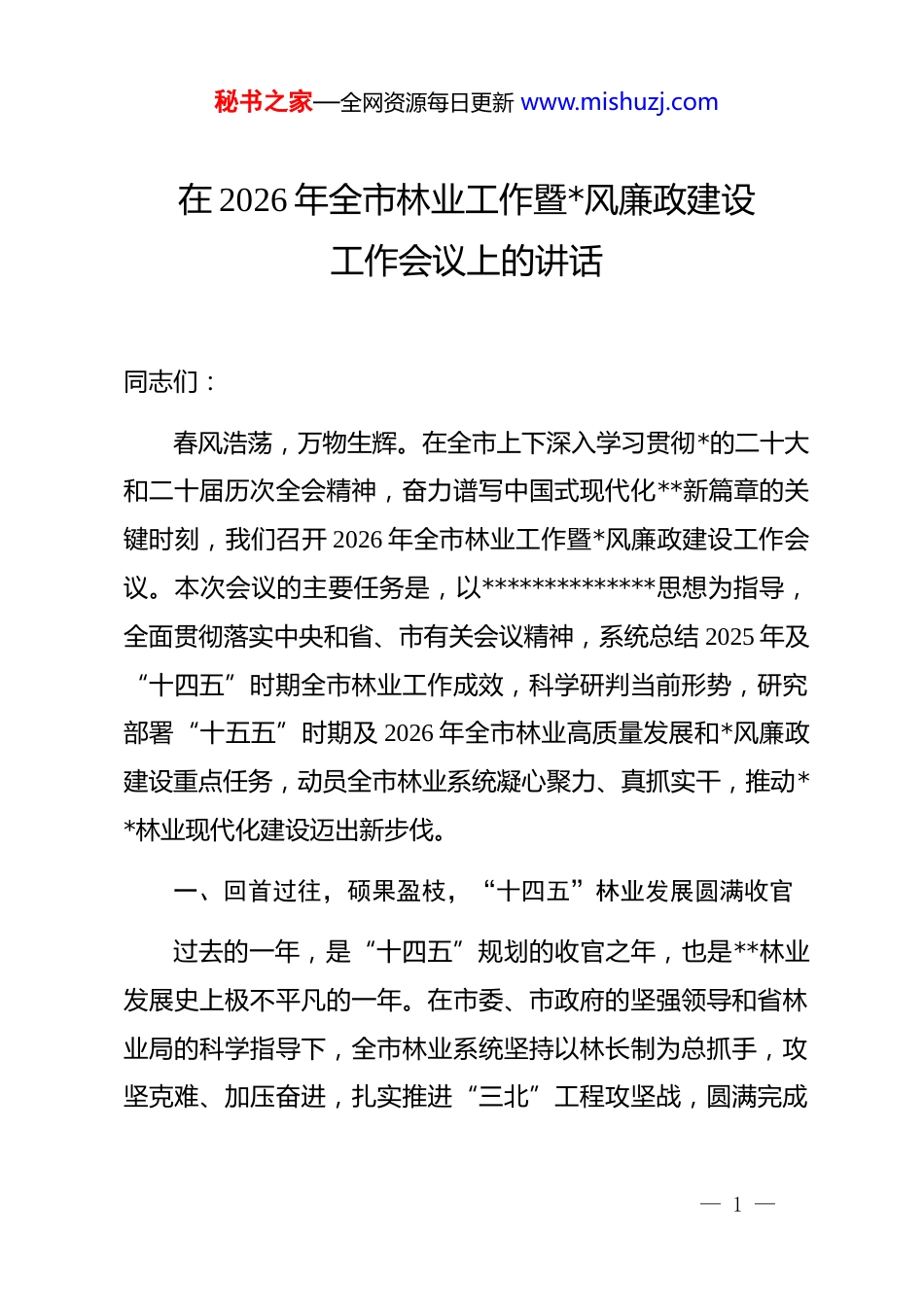 秘书之家—全网资源每日更新 www.mishuzj.com在 2026 年全市林业工作暨*风廉政建设工作会议上的讲话同志们:春风浩荡,万物生辉。在全市上下深入学习贯彻*的二十大和二十届历次全会精神,奋力谱写中国式现代化**新篇章的关键时刻,我们召开 2026 年全市林业工作暨*风廉政建设工作会议。本次会议的主要任务是,以**************思想为指导,全面贯彻落实中央和省、市有关会议精神,系统总结 2025 年及“十四五”时期全市林业工作成效,科学研判当前形势,研究部署“十五五”时期及 2026 年全市林业高质量发展和*风廉政建设重点任务,动员全市林业系统凝心聚力、真抓实干,推动**林业现代化建设迈出新步伐。一、回首过往,硕果盈枝,“十四五”林业发展圆满收官过去的一年,是“十四五”规划的收官之年,也是**林业发展史上极不平凡的一年。在市委、市政府的坚强领导和省林业局的科学指导下,全市林业系统坚持以林长制为总抓手,攻坚克难、加压奋进,扎实推进“三北”工程攻坚战,圆满完成— 1 —秘书之家—全网资源每日更新 www.mishuzj.com了年度各项目标任务,为“十四五”画上了圆满句号。五年来,我们始终坚持生态优先、绿色发展,国土绿化提质增效,资源监管规范高效,林业改革持续深化,生态安全防线更加牢固,林草支撑保障能力不断增强。全市森林覆盖率显著提升,林草植被覆盖度稳步增长,入黄泥沙量明显减少,生态环境质量持续改善。特别是我们将“**”工程作为生态建设的重中之重,谋划实施了一批重点项目,规划营造林面积达数百万亩,成功打响了**区**沙地南侵阻击战、**西岸土石山区综合治理歼灭战等标志性战役,为**大地增添了浓墨重彩的一笔。五年来,我们深入推进林业改革,林长制组织体系全面建立,形成了*政同责、属地负责、部门协同、源头治理、全域覆盖的长效机制。森林资源保护力度空前,严厉打击各类破坏森林资源违法行为,森林督查图斑数量逐年下降,生态红线意识深入人心。五年来,我们坚持 dj 引领,*风廉政建设纵深推进。全市林业系统认真落实全面从严治*主体责任,扎实开展 dj 学习教育,持续深化作风建设,风清气正的政治生态进一步巩固。这些成绩的取得,得益于市委、市政府的正确领导,得益于各级各部门的大力支持,更得益于全市林业系统广大干部职工的辛— 2 —秘书之家—全网资源每日更新 www.mishuzj.com勤付出。二、认清形势,把握大势,科学谋划“十五五”林业发展蓝图“十五五”时期,是全市“追赶超越、增光添彩”的关键五年,也是全市林业加快现代化建设、实现高质量发展的攻坚期。当前,生态文明建设已进入实现生态环境改善由量变到质变的关键时期,林业发展面临着前所未有的机遇和挑战。从机遇看,*中央、国务院高度重视林业草原工作,******多次就林业生态建设作出****批示,为我们指明了前进方向。随着黄河流域生态保护和高质量发展战略的深入实施,国家对“三北”工程等重大生态工程的投入力度持续加大,林业发展的政策红利加速释放。从挑战看,我市生态环境基础依然脆弱,水资源短缺矛盾突出,造林绿化进入攻坚克难的“啃硬骨头”阶段,森林资源保护管理压力依然较大,林业产业发展质量和效益有待进一步提升。面对新形势新任务,我们必须坚持以**************思想为指导,全面贯彻*的二十大和二十届历次全会精神,贯通落实******历次来陕考察重要讲话****,坚持“三绿”并举、“四— 3 —秘书之家—全网资源每日更新 www.mishuzj.com库”联动,更加注重“提质、兴业、利民”。要紧紧围绕黄河流域生态保护和高质量发展战略,坚持以林长制为抓手,以打好“**”工程攻坚战为牵引,以深化林业改革为动力,全力推进国土绿化、资源保护、生态价值转化、林草灾害防控等重点任务,不断推动**山川大地由浅绿向深绿迈进,为美丽**建设和经济社会高质量发展贡献林业力量。三、聚焦重点,精准发力,扎实做好 2026 年各项工作2026 年是“十五五”开局之年,做好今年工作意义重大。全市林业系统要紧紧围绕高质量发展主题,突出抓好以下重点工作。第一,聚焦政治领航,筑牢思想根基。要把学习贯彻**************思想作为首要政...