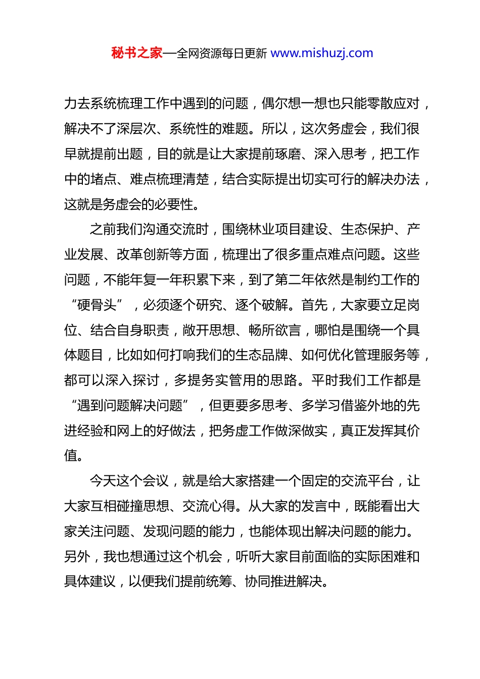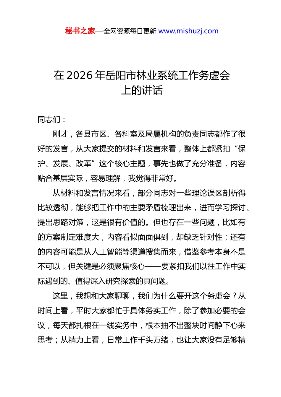秘书之家—全网资源每日更新 www.mishuzj.com在 2026 年岳阳市林业系统工作务虚会上的讲话 同志们:刚才,各县市区、各科室及局属机构的负责同志都作了很好的发言,从大家提交的材料和发言来看,整体上都紧扣“保护、发展、改革”这个核心主题,事先也做了充分准备,内容贴合基层实际,容易理解,我觉得非常好。从材料和发言情况来看,部分同志对一些理论误区剖析得比较透彻,能够把工作中的主要矛盾梳理出来,进而学习探讨、提出思路对策,这是很有价值的。但也存在一些问题,比如有的方案制定难度大,内容看似面面俱到,却缺乏针对性;还有的内容可能是从人工智能等渠道搜集而来,借鉴参考本身不是不可以,但关键是必须聚焦核心——要紧扣我们以往工作中实际遇到的、值得深入研究探索的真问题。这里,我想和大家聊聊,我们为什么要开这个务虚会?从时间上看,平时大家都忙于具体务实工作,除了参加必要的会议,每天都扎根在一线实务中,根本抽不出整块时间静下心来思考;从精力上看,日常工作千头万绪,也让大家没有足够精秘书之家—全网资源每日更新 www.mishuzj.com力去系统梳理工作中遇到的问题,偶尔想一想也只能零散应对,解决不了深层次、系统性的难题。所以,这次务虚会,我们很早就提前出题,目的就是让大家提前琢磨、深入思考,把工作中的堵点、难点梳理清楚,结合实际提出切实可行的解决办法,这就是务虚会的必要性。之前我们沟通交流时,围绕林业项目建设、生态保护、产业发展、改革创新等方面,梳理出了很多重点难点问题。这些问题,不能年复一年积累下来,到了第二年依然是制约工作的“硬骨头”,必须逐个研究、逐个破解。首先,大家要立足岗位、结合自身职责,敞开思想、畅所欲言,哪怕是围绕一个具体题目,比如如何打响我们的生态品牌、如何优化管理服务等,都可以深入探讨,多提务实管用的思路。平时我们工作都是“遇到问题解决问题”,但更要多思考、多学习借鉴外地的先进经验和网上的好做法,把务虚工作做深做实,真正发挥其价值。今天这个会议,就是给大家搭建一个固定的交流平台,让大家互相碰撞思想、交流心得。从大家的发言中,既能看出大家关注问题、发现问题的能力,也能体现出解决问题的能力。另外,我也想通过这个机会,听听大家目前面临的实际困难和具体建议,以便我们提前统筹、协同推进解决。秘书之家—全网资源每日更新 www.mishuzj.com接下来,我再讲讲怎么务虚。今天我们聊了一下午,大家畅所欲言,时间紧、任务重,大家也很辛苦。但务虚绝不是雾里看花、泛泛而谈,更不是虚张声势、言之无物,不能随便交流几句就结束了。关键是要掌握科学的方法,找准问题靶心,核心就是运用“吃透上情、摸清下情、了解外情、把握内情”的“四情工作法”。面对一个问题,要搞清楚上级的政策要求是什么、外地的先进做法是什么、我们岳阳林业的实际情况是什么、我们自身目前是怎么推进的,有哪些优势和不足,通过这样的对比分析,才能精准找到问题根源和解决路径。所以说,务虚本身就是务实,务虚也是创新,对于那些没有固定答案、需要突破常规的问题,我们必须用创新的思路和方法去破解。由于时间关系,下面我简要讲三点意见:第一,瞄准历史方位,坚持战略引领谋全局。刚才很多同志都谈到了“十五五”时期岳阳林业的发展定位,谋划“十五五”规划,必须站在历史发展的高度,树立战略思维。要深刻把握国家层面的部署要求,比如国家关于农、林、牧、渔的发展规划,关于长江经济带绿色发展、壮大生态产业等相关部署,国家和省里的规划每一个字都经过反复斟酌,吃透这些精神,才能找准我们下一步的工作方向。同时,要清醒认识到我们工作中存在的短板不足,比如在生态保护、产业发展等方面,与秘书之家—全网资源每日更新 www.mishuzj.com上级要求和群众期盼还有差距。要充分发挥岳阳的四大优势,即政策优势、区位优势、生态优势、成本优势,重点做好“城市文章”和“生态文章”。其中,政治优势和生态优势是我们必须牢牢把握的核心。国家高度重视生态文明建设,出台了一系列政策文件,比如相关的56 号文件,这就是我们的政策支撑;而生态优势是岳阳林业的本...