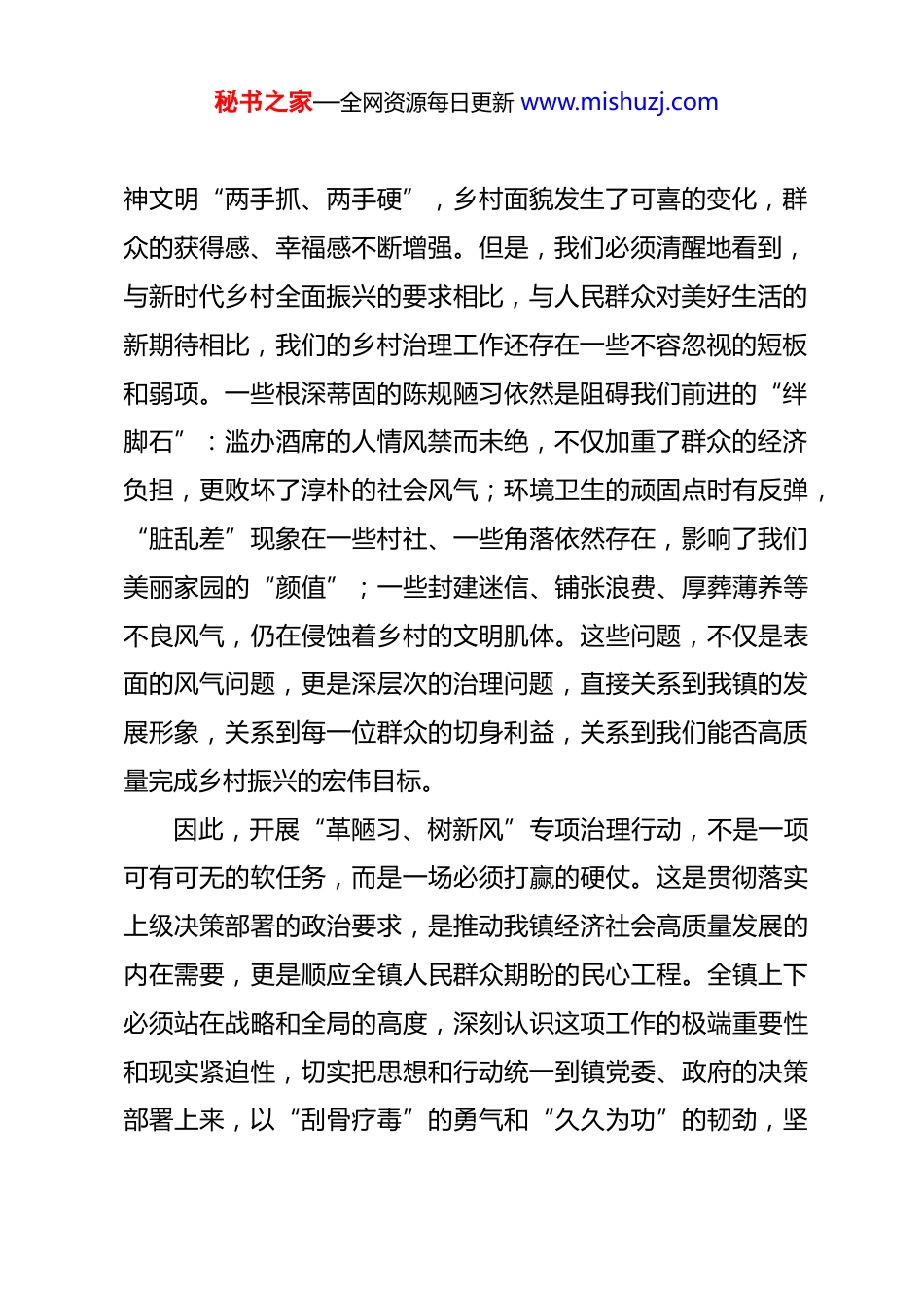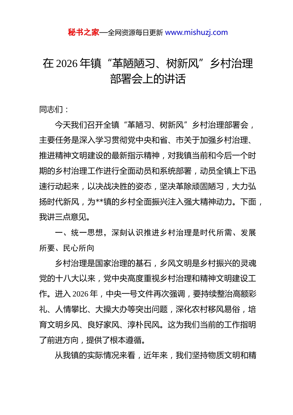 秘书之家—全网资源每日更新 www.mishuzj.com在 2026 年镇“革陋陋习、树新风”乡村治理部署会上的讲话 同志们:今天我们召开全镇“革陋习、树新风”乡村治理部署会,主要任务是深入学习贯彻党中央和省、市关于加强乡村治理、推进精神文明建设的最新指示精神,对我镇当前和今后一个时期的乡村治理工作进行全面动员和系统部署,动员全镇上下迅速行动起来,以决战决胜的姿态,坚决革除顽固陋习,大力弘扬时代新风,为**镇的乡村全面振兴注入强大精神动力。下面,我讲三点意见。一、统一思想,深刻认识推进乡村治理是时代所需、发展所要、民心所向乡村治理是国家治理的基石,乡风文明是乡村振兴的灵魂党的十八大以来,党中央高度重视乡村治理和精神文明建设工作。进入 2026 年,中央一号文件再次强调,要持续整治高额彩礼、人情攀比、大操大办等突出问题,深化农村移风易俗,培育文明乡风、良好家风、淳朴民风。这为我们当前的工作指明了前进方向,提供了根本遵循。从我镇的实际情况来看,近年来,我们坚持物质文明和精秘书之家—全网资源每日更新 www.mishuzj.com神文明“两手抓、两手硬”,乡村面貌发生了可喜的变化,群众的获得感、幸福感不断增强。但是,我们必须清醒地看到,与新时代乡村全面振兴的要求相比,与人民群众对美好生活的新期待相比,我们的乡村治理工作还存在一些不容忽视的短板和弱项。一些根深蒂固的陈规陋习依然是阻碍我们前进的“绊脚石”:滥办酒席的人情风禁而未绝,不仅加重了群众的经济负担,更败坏了淳朴的社会风气;环境卫生的顽固点时有反弹,“脏乱差”现象在一些村社、一些角落依然存在,影响了我们美丽家园的“颜值”;一些封建迷信、铺张浪费、厚葬薄养等不良风气,仍在侵蚀着乡村的文明肌体。这些问题,不仅是表面的风气问题,更是深层次的治理问题,直接关系到我镇的发展形象,关系到每一位群众的切身利益,关系到我们能否高质量完成乡村振兴的宏伟目标。因此,开展“革陋习、树新风”专项治理行动,不是一项可有可无的软任务,而是一场必须打赢的硬仗。这是贯彻落实上级决策部署的政治要求,是推动我镇经济社会高质量发展的内在需要,更是顺应全镇人民群众期盼的民心工程。全镇上下必须站在战略和全局的高度,深刻认识这项工作的极端重要性和现实紧迫性,切实把思想和行动统一到镇党委、政府的决策部署上来,以“刮骨疗毒”的勇气和“久久为功”的韧劲,坚秘书之家—全网资源每日更新 www.mishuzj.com决打好这场乡村治理的攻坚战、持久战。二、聚焦重点,准确把握以“三提升”为目标的乡村治理核心任务根据今天会议印发的《**镇“革陋习、树新风”乡村治理实施方案》,我们的总体目标是明确的,就是要通过“半年集中整治、一年巩固提升”,最终实现乡风文明、人居环境、基层治理“三提升”。为实现这一目标,我们必须紧紧围绕以下三个核心任务,精准发力,务求实效。(一)以“破除陈规”为突破口,实现乡风文明新提升。乡风文明是乡村治理的“面子”,更是“里子”。当前,我们的首要任务,就是要向“滥办酒席”等顽瘴痼疾“亮剑”。据不完全统计,过去一年我镇农村人均人情开支占家庭纯收入的比重超过 15%,有的甚至高达 30%,群众对此苦不堪言。这种风气不刹住,勤劳致富的成果就会在一次次“人情消费”中被稀释。因此,我们必须严格落实宴席申报备案制度。各村(社区)要立即行动,对婚丧嫁娶之外的生日宴、升学宴、乔迁宴等各类宴席进行严格规范和控制。申报备案不是目的,而是引导和监督的手段。要通过这个制度,让群众明白哪些酒席该办、怎么办,形成“婚事新办、丧事简办、余事不办”的社会共识。同时,要充分发挥红白理事会的作用,让他们成为移风易俗的秘书之家—全网资源每日更新 www.mishuzj.com宣传队、监督员。要大力倡导“零彩礼”“低彩礼”,破除婚嫁攀比之风,切实为群众减轻负担。(二)以“净美家园”为着力点,实现人居环境新提升。良好的人居环境是乡村振兴的底色,也是广大群众最直接的民生福祉。环境卫生“脏乱差”问题,看似小事,实则反映了我们的治理能力和文明程度。我们必须下定决心,打一场人居环境整治...