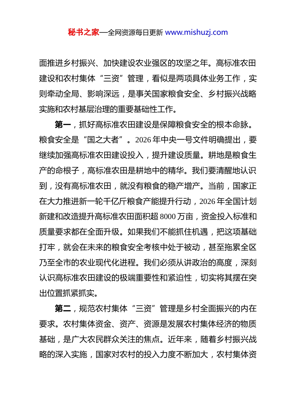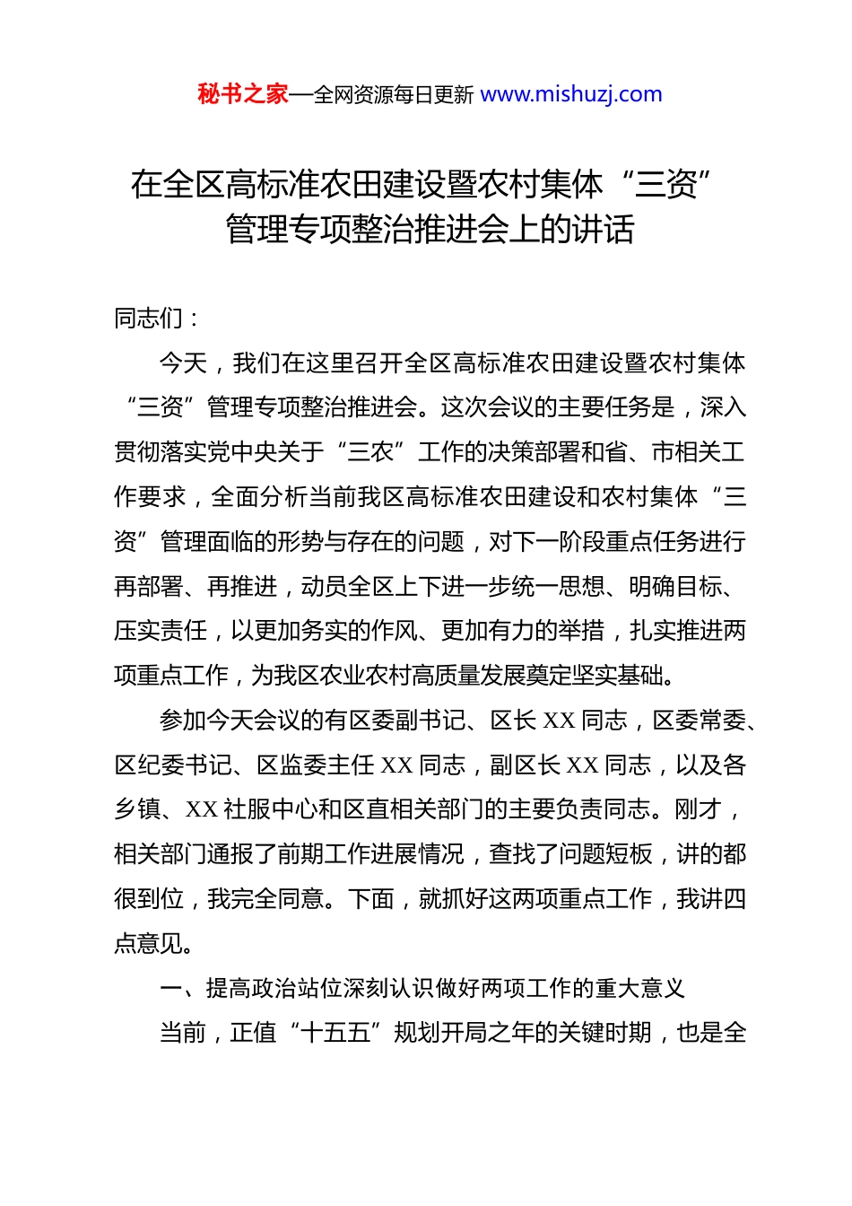 秘书之家—全网资源每日更新 www.mishuzj.com在全区高标准农田建设暨农村集体“三资”管理专项整治推进会上的讲话 同志们:今天,我们在这里召开全区高标准农田建设暨农村集体“三资”管理专项整治推进会。这次会议的主要任务是,深入贯彻落实党中央关于“三农”工作的决策部署和省、市相关工作要求,全面分析当前我区高标准农田建设和农村集体“三资”管理面临的形势与存在的问题,对下一阶段重点任务进行再部署、再推进,动员全区上下进一步统一思想、明确目标、压实责任,以更加务实的作风、更加有力的举措,扎实推进两项重点工作,为我区农业农村高质量发展奠定坚实基础。参加今天会议的有区委副书记、区长 XX 同志,区委常委、区纪委书记、区监委主任 XX 同志,副区长 XX 同志,以及各乡镇、XX 社服中心和区直相关部门的主要负责同志。刚才,相关部门通报了前期工作进展情况,查找了问题短板,讲的都很到位,我完全同意。下面,就抓好这两项重点工作,我讲四点意见。一、提高政治站位深刻认识做好两项工作的重大意义当前,正值“十五五”规划开局之年的关键时期,也是全秘书之家—全网资源每日更新 www.mishuzj.com面推进乡村振兴、加快建设农业强区的攻坚之年。高标准农田建设和农村集体“三资”管理,看似是两项具体业务工作,实则牵动全局、影响深远,是事关国家粮食安全、乡村振兴战略实施和农村基层治理的重要基础性工作。第一,抓好高标准农田建设是保障粮食安全的根本命脉。粮食安全是“国之大者”。2026 年中央一号文件明确提出,要继续加强高标准农田建设投入,提升建设质量。耕地是粮食生产的命根子,高标准农田是耕地中的精华。我们要清醒地认识到,没有高标准农田,就没有粮食的稳产增产。当前,国家正在大力推进新一轮千亿斤粮食产能提升行动,2026 年全国计划新建和改造提升高标准农田面积超 8000 万亩,资金投入标准和质量要求都在全面升级。如果我们不能抓住机遇,把这项基础打牢,就会在未来的粮食安全考核中处于被动,甚至拖累全区乃至全市的农业现代化进程。我们必须从讲政治的高度,深刻认识高标准农田建设的极端重要性和紧迫性,切实将其摆在突出位置抓紧抓实。第二,规范农村集体“三资”管理是乡村全面振兴的内在要求。农村集体资金、资产、资源是发展农村集体经济的物质基础,是广大农民群众关注的焦点。近年来,随着乡村振兴战略的深入实施,国家对农村的投入力度不断加大,农村集体资秘书之家—全网资源每日更新 www.mishuzj.com产总量迅速增加,管理难度也随之加大。从各地通报的案例来看,农村集体“三资”管理领域问题频发,极易滋生“微腐败”,严重侵害农民群众利益,损害党和政府形象。规范“三资”管理,不仅是经济问题,更是政治问题和民生问题。只有管好用好这些资产,才能有效破解农村集体“三资”管理难题,实现集体资产的保值增值与规范运行,才能让农民群众有更多的获得感、幸福感,才能为乡村治理提供坚实的物质基础和群众基础。第三,推进两项专项整治是提升基层治理效能的重要抓手。无论是高标准农田建设中存在的工程质量、后期管护问题,还是“三资”管理中的账目不清、资产流失问题,其根源都在于制度不健全、监管不到位、责任不落实。开展专项整治,就是要通过解决具体问题,倒逼制度完善、机制创新,提升基层治理的规范化、法治化水平。全区上下必须切实提高政治站位,把这两项工作作为当前一项重要政治任务,以对党和人民高度负责的态度,坚决抓紧抓好、抓出成效。二、聚焦关键环节全力推进高标准农田建设提质增效近年来,我区在高标准农田建设方面取得了一定成效,但也要清醒看到,部分项目仍存在底数不清、建设质量不高、后期管护缺失等问题。特别是 2026 年作为高标准农田建设规模和秘书之家—全网资源每日更新 www.mishuzj.com投入全面升级的一年,我们必须坚持问题导向,抓实三个环节,确保建一块、成一块。一是要摸清底数夯实基础。底数清才能情况明。要全面建立项目台账,对已建成和在建的高标准农田项目进行拉网式排查。要厘清实施主体、建设进度及后期管护现状,做到心中有数。不仅要查清数量,更...