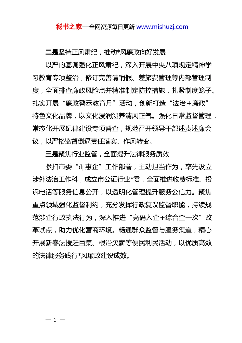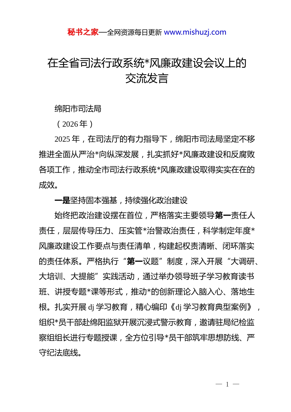 秘书之家—全网资源每日更新 www.mishuzj.com在全省司法行政系统*风廉政建设会议上的交流发言绵阳市司法局(2026 年)2025 年,在司法厅的有力指导下,绵阳市司法局坚定不移推进全面从严治*向纵深发展,扎实抓好*风廉政建设和反腐败各项工作,推动全市司法行政系统*风廉政建设取得实实在在的成效。一是坚持固本强基,持续强化政治建设始终把政治建设摆在首位,严格落实主要领导第一责任人责任,层层传导压力、压实管*治警政治责任,科学制定年度*风廉政建设工作要点与责任清单,构建起权责清晰、闭环落实的责任体系。严格执行“第一议题”制度,深入开展“大调研、大培训、大提能”实践活动,通过举办领导班子学习教育读书班、讲授专题*课等形式,推动*的创新理论入脑入心、落地生根。扎实开展 dj 学习教育,精心编印《dj 学习教育典型案例》,组织*员干部赴绵阳监狱开展沉浸式警示教育,邀请驻局纪检监察组组长进行专题授课,全方位引导*员干部筑牢思想防线、严守纪法底线。— 1 —秘书之家—全网资源每日更新 www.mishuzj.com二是坚持正风肃纪,推动*风廉政向好发展以严的基调强化正风肃纪,深入开展中央八项规定精神学习教育专项整治,修订完善请销假、差旅费管理等内部管理制度,全面排查廉政风险点并精准制定防控措施,扎紧制度笼子。扎实开展“廉政警示教育月”活动,创新打造“法治+廉政”特色文化品牌,以文化浸润涵养清风正气。强化日常监督管理,常态化开展纪律建设专项督查,规范召开领导干部述责述廉会议,以严格监督倒逼责任落实、作风转变。三是聚焦行业监管,全面提升法律服务质效紧扣市委“dj 惠企”工作部署,主动担当作为,率先设立涉外法治工作科,成立市公证行业*委,全面推进收费标准、投诉电话等服务信息公开,以透明化管理提升服务公信力。聚焦重点领域强化监督制约,充分发挥行政复议监督职能,持续规范涉企行政执法行为,深入推进“亮码入企+综合查一次”改革试点,助力优化营商环境。畅通群众监督与服务渠道,精心开展新春法援赶百集、根治欠薪等便民利民活动,以优质高效的法律服务践行*风廉政建设成效。— 2 —