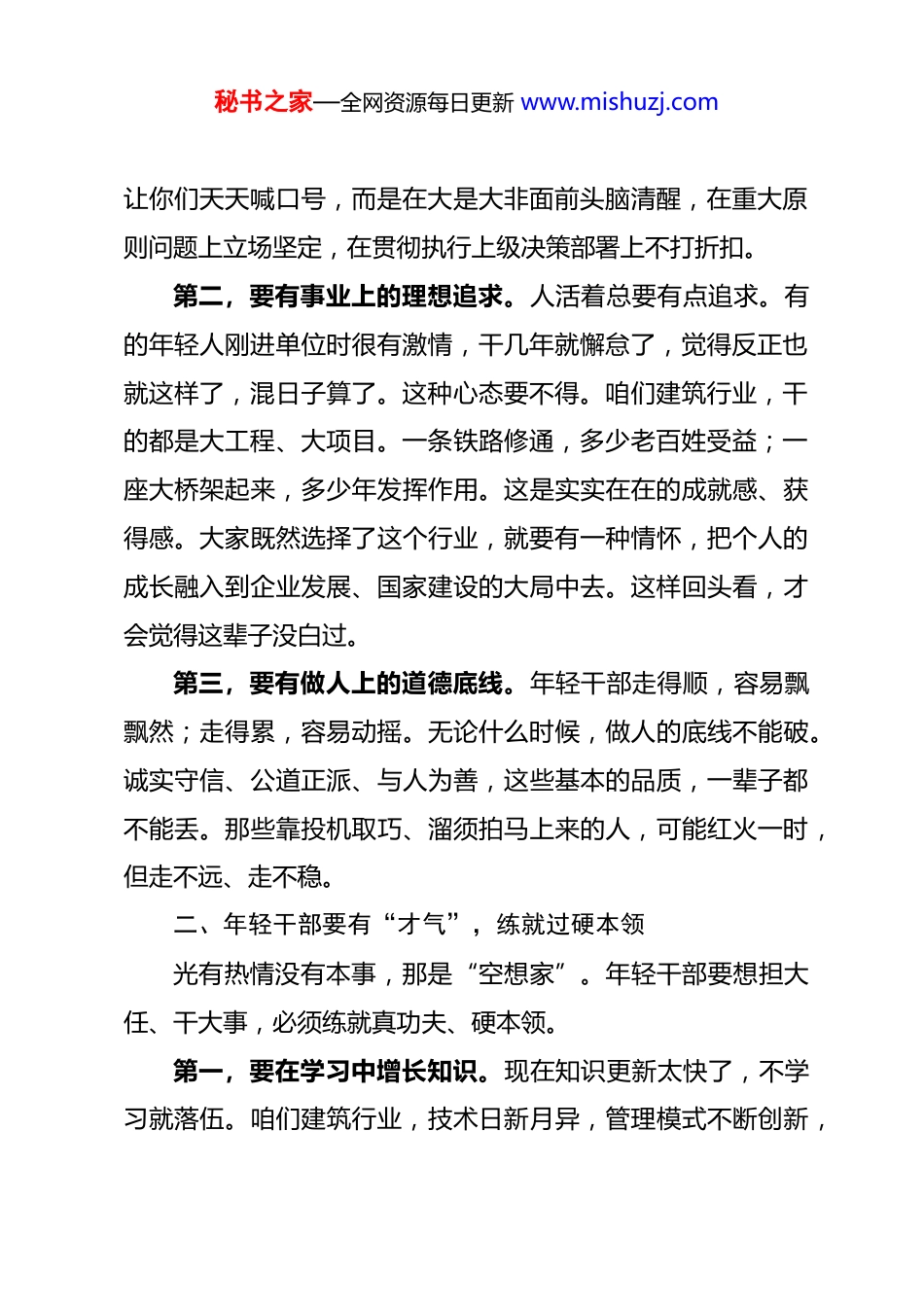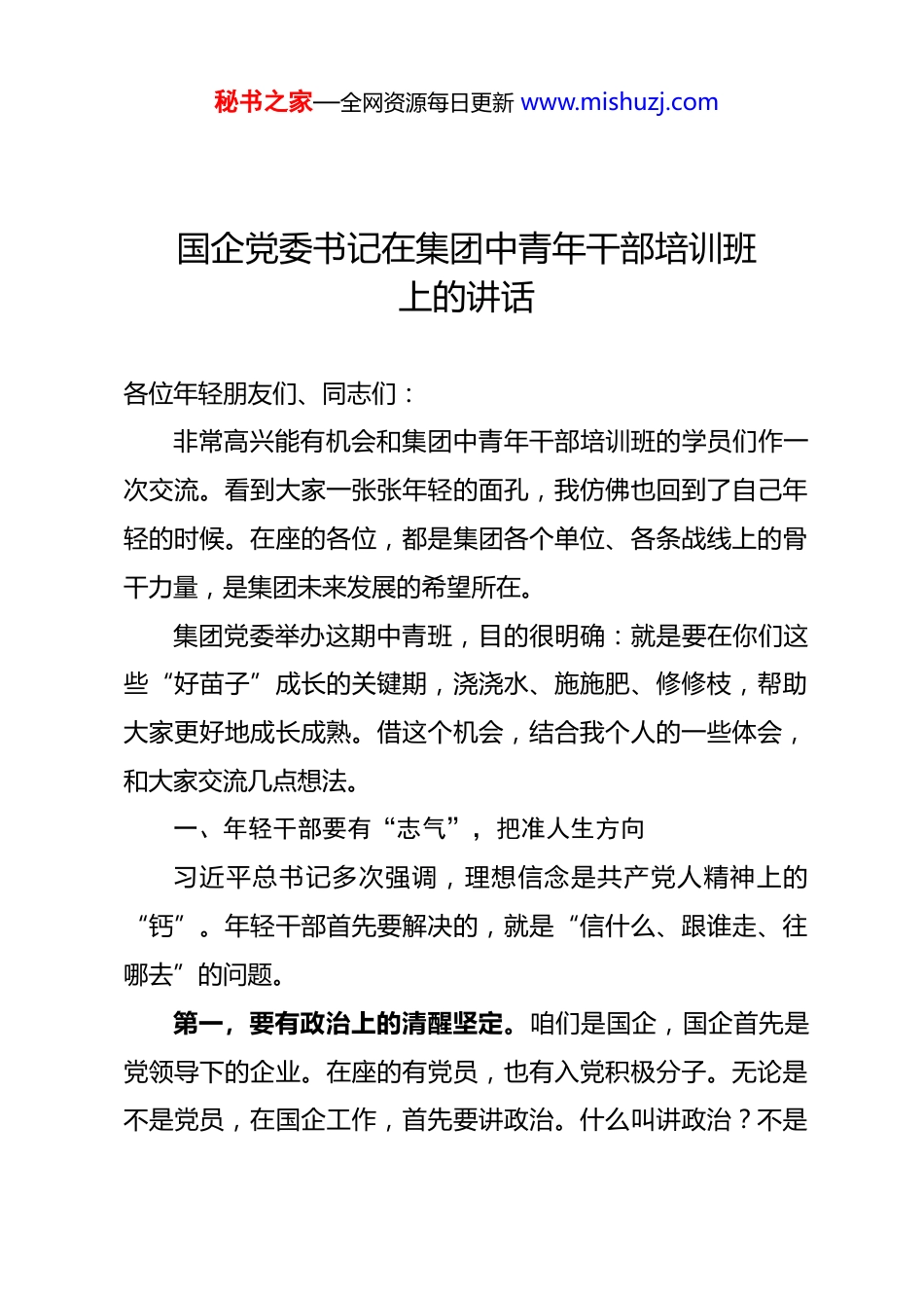 秘书之家—全网资源每日更新 www.mishuzj.com国企党委书记在集团中青年干部培训班上的讲话各位年轻朋友们、同志们:非常高兴能有机会和集团中青年干部培训班的学员们作一次交流。看到大家一张张年轻的面孔,我仿佛也回到了自己年轻的时候。在座的各位,都是集团各个单位、各条战线上的骨干力量,是集团未来发展的希望所在。集团党委举办这期中青班,目的很明确:就是要在你们这些“好苗子”成长的关键期,浇浇水、施施肥、修修枝,帮助大家更好地成长成熟。借这个机会,结合我个人的一些体会,和大家交流几点想法。一、年轻干部要有“志气”,把准人生方向习近平总书记多次强调,理想信念是共产党人精神上的“钙”。年轻干部首先要解决的,就是“信什么、跟谁走、往哪去”的问题。第一,要有政治上的清醒坚定。咱们是国企,国企首先是党领导下的企业。在座的有党员,也有入党积极分子。无论是不是党员,在国企工作,首先要讲政治。什么叫讲政治?不是秘书之家—全网资源每日更新 www.mishuzj.com让你们天天喊口号,而是在大是大非面前头脑清醒,在重大原则问题上立场坚定,在贯彻执行上级决策部署上不打折扣。第二,要有事业上的理想追求。人活着总要有点追求。有的年轻人刚进单位时很有激情,干几年就懈怠了,觉得反正也就这样了,混日子算了。这种心态要不得。咱们建筑行业,干的都是大工程、大项目。一条铁路修通,多少老百姓受益;一座大桥架起来,多少年发挥作用。这是实实在在的成就感、获得感。大家既然选择了这个行业,就要有一种情怀,把个人的成长融入到企业发展、国家建设的大局中去。这样回头看,才会觉得这辈子没白过。第三,要有做人上的道德底线。年轻干部走得顺,容易飘飘然;走得累,容易动摇。无论什么时候,做人的底线不能破。诚实守信、公道正派、与人为善,这些基本的品质,一辈子都不能丢。那些靠投机取巧、溜须拍马上来的人,可能红火一时,但走不远、走不稳。二、年轻干部要有“才气”,练就过硬本领光有热情没有本事,那是“空想家”。年轻干部要想担大任、干大事,必须练就真功夫、硬本领。第一,要在学习中增长知识。现在知识更新太快了,不学习就落伍。咱们建筑行业,技术日新月异,管理模式不断创新,秘书之家—全网资源每日更新 www.mishuzj.com新业态、新模式层出不穷。前两天我听说,有家单位在搞“智能建造”,机器人砌墙、无人机巡查,效率提高了一大截。这些东西,你不学能行吗?学习不只是看几本书、听几堂课。要带着问题学、结合实际学。比如你搞经营的,能不能把国家政策研究透、把市场规律琢磨透?你搞技术的,能不能把行业前沿技术学明白、把施工工法搞精通?把学习当成一种习惯、一种生活方式,日积月累,差距就出来了。第二,要在实践中增长才干。纸上得来终觉浅,绝知此事要躬行。再多的理论知识,不经过实践检验,都是纸上谈兵。咱们建筑行业最锻炼人,项目一线是最好的课堂,市场前沿是最好的老师。我认识一个年轻项目经理,刚毕业时被派到山里修铁路,住板房、吃食堂、整天泡在工地上,一待就是三年。三年下来,他从一个啥也不懂的学生娃,变成了工地上什么都能拿得起的“多面手”。后来他跟我说,那三年吃的苦,值了。年轻人,不要怕吃苦,不要怕去艰苦的地方,那是你们成长的“磨刀石”。第三,要在挫折中增长智慧。一帆风顺不是人生的常态。年轻人走上社会,肯定会遇到各种挫折:项目没拿下来、工作出了纰漏、和同事闹了矛盾、被领导批评了……这些都很正常。关键是怎么对待挫折。有的人摔一跤就爬不起来了,从此一蹶秘书之家—全网资源每日更新 www.mishuzj.com不振;有的人却能把挫折当财富,从失败中吸取教训、增长智慧。大家要记住,年轻时候吃点亏、受点挫,不是坏事。现在把该踩的坑都踩一遍,以后才能走得更稳。三、年轻干部要有“锐气”,勇于担当作为年轻人要有年轻人的样子。什么样子?朝气蓬勃、敢想敢干、不怕困难、勇于担当。第一,要有敢闯敢试的劲头。咱们搞经营的,最怕什么?最怕四平八稳、按部就班。市场瞬息万变,机会稍纵即逝,等你把方案研究透了、把风险评估好了,黄花菜都凉了。当然,不是让大家蛮干...