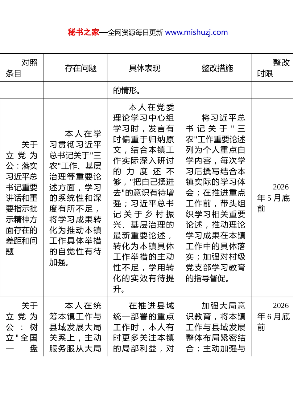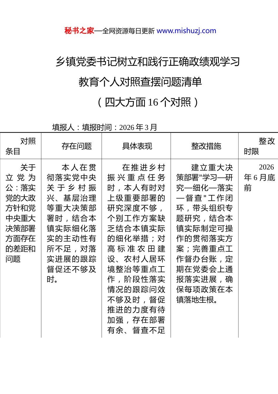 秘书之家—全网资源每日更新 www.mishuzj.com乡镇党委书记树立和践行正确政绩观学习教育个人对照查摆问题清单(四大方面 16 个对照)填报人:填报时间:2026 年 3 月对照条目存在问题具体表现整改措施整改时限关于立 党 为公:落实党的大政方针和党中央重大决策部署方面存在的差距和问题本 人 在 贯彻落实党中央关 于 乡 村 振兴、基层治理等重大决策部署时,结合本镇实际细化落实的主动性有所不足,对落实进展的跟踪督促还不够及时。在 推 进 乡 村振 兴 重 点 任 务时,本人有时对上级重要部署的研究深度不够,个别工作方案缺乏结合本镇实际的细化举措;对高 标 准 农 田 建设、农村人居环境整治等重点工作,阶段性落实情况的跟踪问效不够及时,督促推进的力度有待加强,存在部署有余、督查不足建立重大决策部署"学习—研究—细化—落实— 督 查 " 工 作 闭环,带头组织专题研究,结合本镇实际制定可操作的贯彻落实方案;完善重点工作督办台账,定期在党委会上通报落实进展,确保每项政策在本镇落地生根。2026年 6 月底前秘书之家—全网资源每日更新 www.mishuzj.com对照条目存在问题具体表现整改措施整改时限的情形。关于立 党 为公:落实习近平总书记重要讲话和重要指示批示精神方面存在的差距和问题本 人 在 学习贯彻习近平总书记关于"三农"工作、基层治理等重要论述方面,学习的系统性和深度有所不足,将学习成果转化为推动本镇工作具体举措的自觉性有待加强。本 人 在 党 委理论学习中心组学习时,发言有时偏重于归纳原文,结合本镇工作实际深入研讨的 力 度 还 不够,"把自己摆进去"的意识有待增强;习近平总书记 关 于 乡 村 振兴、基层治理的最新重要论述,转化为本镇具体工作举措的主动性不足,学用转化的实效有待提升。将习近平总书 记 关 于 " 三农"工作重要论述列为个人重点自学内容,每次学习后撰写结合本镇实际的学习体会;在推进重点工作前,带头组织学习相关重要论述,推动理论学习成果在本镇工作中的具体落实;加强对村级党支部学习教育的指导督促。2026年 5 月底前关于立 党 为公 : 树立 " 全 国一盘本 人 在 统筹本镇工作与县域发展大局关系上,主动服务服从大局在 推 进 县 域统一部署的重点工作时,本人有时更多关注本镇的局部利益,对加强大局意识教育,将本镇工作与县域发展整体布局紧密结合;主动加强与2026年 6 月底前秘书之家—全网资源每日更新 www.mishuzj.com对照条目存在问题具体表现整改措施整改时限棋 " 思想、服务服从大局方面存在的差距和问题的意识有时不够强,就本镇看本镇、缺乏全局视野的倾向在个别工作中有所体现。如何服务县域整体发展大局的主动谋划不够;在配合上级开展专项工作时,主动对接的积极性有时不足,等待上级具体安排多、自 主 谋 划 落 实少;在处理跨村利 益 协 调 事 项时,统筹协调的主 动 性 有 待 加强。上级部门和相关镇 街 的 对 接 联系;定期研究本镇工作与县域发展 大 局 的 结 合点,强化服务大局的主动性和自觉性。关于立 党 为公:对照岗位职责履职方面存在的差距和问题本 人 作 为镇党委书记,在履行党委书记岗位职责方面,对班子成员履行"一岗双责"的日常督促提醒还不够及时,统筹抓好党建工作与业务工作深度融本 人 有 时 对班子成员分管领域工作推进情况的跟踪了解不够及时,对分管领域存在的薄弱环节发现不够早;在推进党建工作与业务工作融合方 面 , 有 时 存在"两张皮"的倾完善党委书记 岗 位 职 责 清单,对照职责逐项查缺补漏;加强对班子成员履职情况的日常关注,完善"一岗双责 " 落 实 督 促 机制;推动党建工作与本镇中心工作同步部署、同2026年 6 月底前秘书之家—全网资源每日更新 www.mishuzj.com对照条目存在问题具体表现整改措施整改时限合的力度有待加强。向,党建工作引领业务发展的效果有待提升;对村级班子履职情况的日常指导和监督有所不足,个别村级工作推进迟缓的情形未能及时发现推动改进。步推进、同步考核;定期开展村级工作督查,...