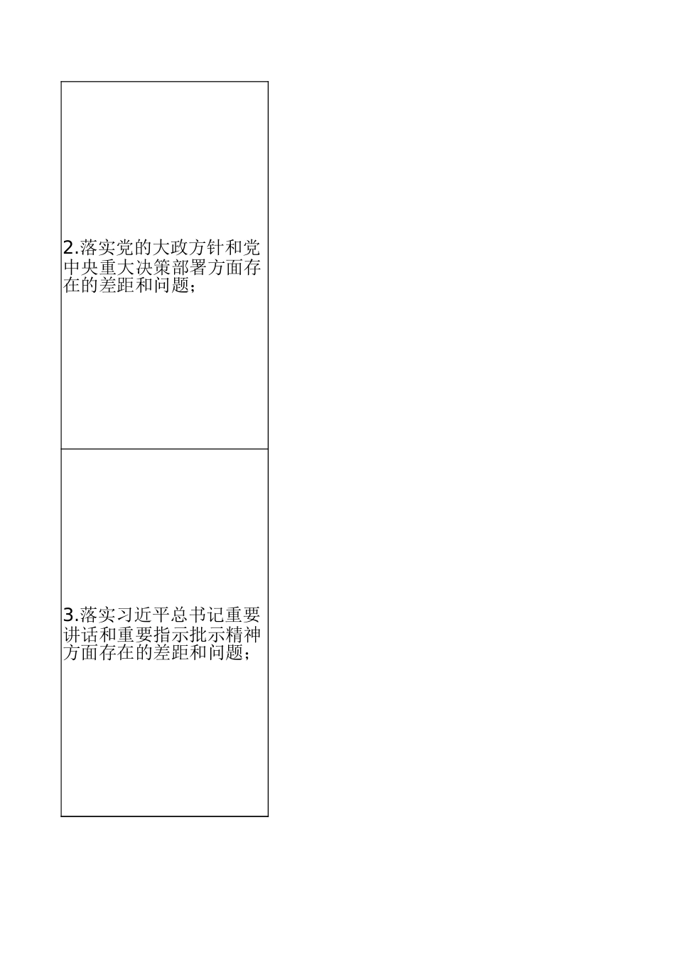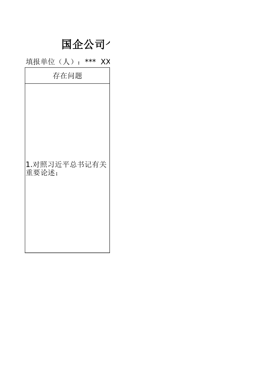 存在问题国企公司个人学习教育问题查摆清单(22个填报单位(人):*** XX党委书记 填报时间:1.对照习近平总书记有关重要论述;2.落实党的大政方针和党中央重大决策部署方面存在的差距和问题;3.落实习近平总书记重要讲话和重要指示批示精神方面存在的差距和问题;4.树立“全国一盘棋”思想、服务服从大局方面存在的差距和问题;5.对照岗位职责履职方面存在的差距和问题。6.坚持人民至上、践行全心全意为人民服务宗旨方面存在的差距和问题;7.深入基层、联系服务群众方面存在的差距和问题;8.推动解决民生、信访、群众急难愁盼问题方面存在的差距和不足;9.贯彻执行民主集中制方面存在的差距和问题;10.政策规划“翻烧饼”的问题;11.违反群众意愿不切实际决策的问题;12.新官不理旧账方面存在的具体问题;13.急功近利、盲目蛮干、违规新增地方政府隐性债务的问题;14.弄虚作假方面存在的具体问题;15.搞“形象工程”、“政绩工程”的问题;16.畏难避责、斗争精神不强的问题;17.工作方法简单、搞“一刀切”的问题;18.对照纪检监察、巡视巡察、审计监督、财会监督、同级监督等反馈问题;19.中央巡视整改;20.深入贯彻中央⑧项规定精神学习教育整改;21.“十五五”规划编制实施;22.生态环保督察;具体表现公司个人学习教育问题查摆清单(22个方面66条)*** XX党委书记 填报时间:一是理论学习与岗位实践结合还不够紧密。本人能够按要求跟进学习习近平总书记重要讲话和重要指示批示精神,认真参集中学习和专题研讨,但在学懂弄通做实上还不够深入,特别是在把党的创新论转化为抓改革、强管理、促发展、防风险的具体思路和务实举措方面,还存结合不够紧、转化不够快的问题,有时还没有真正做到从理论中找方向、从理中找方法、从理论中找答案。二是学用贯通、知行合一还有差距。对习近平总书记关于国有企业改革发展和党的建设的重要论述,能够做到及时习、及时跟进,但在系统理解、深入把握、贯通落实上还不够到位,对其中蕴的政治要求、发展导向、实践路径理解还不够深,在指导分管工作、破解实际题、推动任务落实时,理论指导实践的作用发挥还不够充分。三是从政治上看问题的意识还需增强。平时思考和推动工作,更多还是从职责分工、业务推进、目标完成等角度研究题,对一些经营管理问题、改革发展问题、风险防控问题背后的政治要求、政责任、政治影响认识还不够深,对“国之大者”的领会把握还不够到位,用政眼光观察和分析问题的能力还需进一步提升。一是贯彻落实还不够精准有力。对党中央关于深化国资国企改革、推动高质量发展、发展新质生产力、防范化重大风险等重大决策部署,能够做到及时学习领会、认真抓好落实,但结合本岗位细化任务、实化举措、推动落地还不够到位,个别工作还存在理解不深、握不准、落实不细的问题。二是服务大局的主动性还不够强。在推动分管工作时,能够立足岗位职责抓落实,但对企业承担的政治责任**、济责任、社会责任统筹把握还不够到位,对如何把分管领域工作放到企业改革展全局中去谋划思考还不够深入,有时更多关注局部工作推进,对服务大局、撑全局、融入全局考虑得还不够充分。三是执行落实的韧劲还需加强。对一些重点工作、难点任务,能够做到按要求推进落实,但在持续跟进、盯住放、一抓到底方面做得还不够,有时存在部署时要求较高、推进中抓得较紧,在后续督导、成效评估、闭环管理上用力不足的问题,导致个别事项推进成效不够理想。一是学习领会还不够深入透彻。对习近平总书记关于本行业、本领域、本企业相关工作的重要讲话和重要指示示精神,能够做到及时学习、认真传达,但在联系岗位职责深学细悟方面还不到位,对有关要求还存在理解不够系统、把握不够精准的问题,导致在具体执中有时还停留在一般性落实层面。二是对标落实还不够具体有力。在贯彻落实总书记重要讲话和重要指示批示精神时,有时还存在对照不够细、合不够深、落点不够准的问题,没有完全做到把自己摆进去、把职责摆进去、把工作摆进去,特别是在把有关要求体现到具体任务、具体措施、具体责任上还需要进一步深化细化。三是跟踪问效还不够严实。对已经部署推进的事...