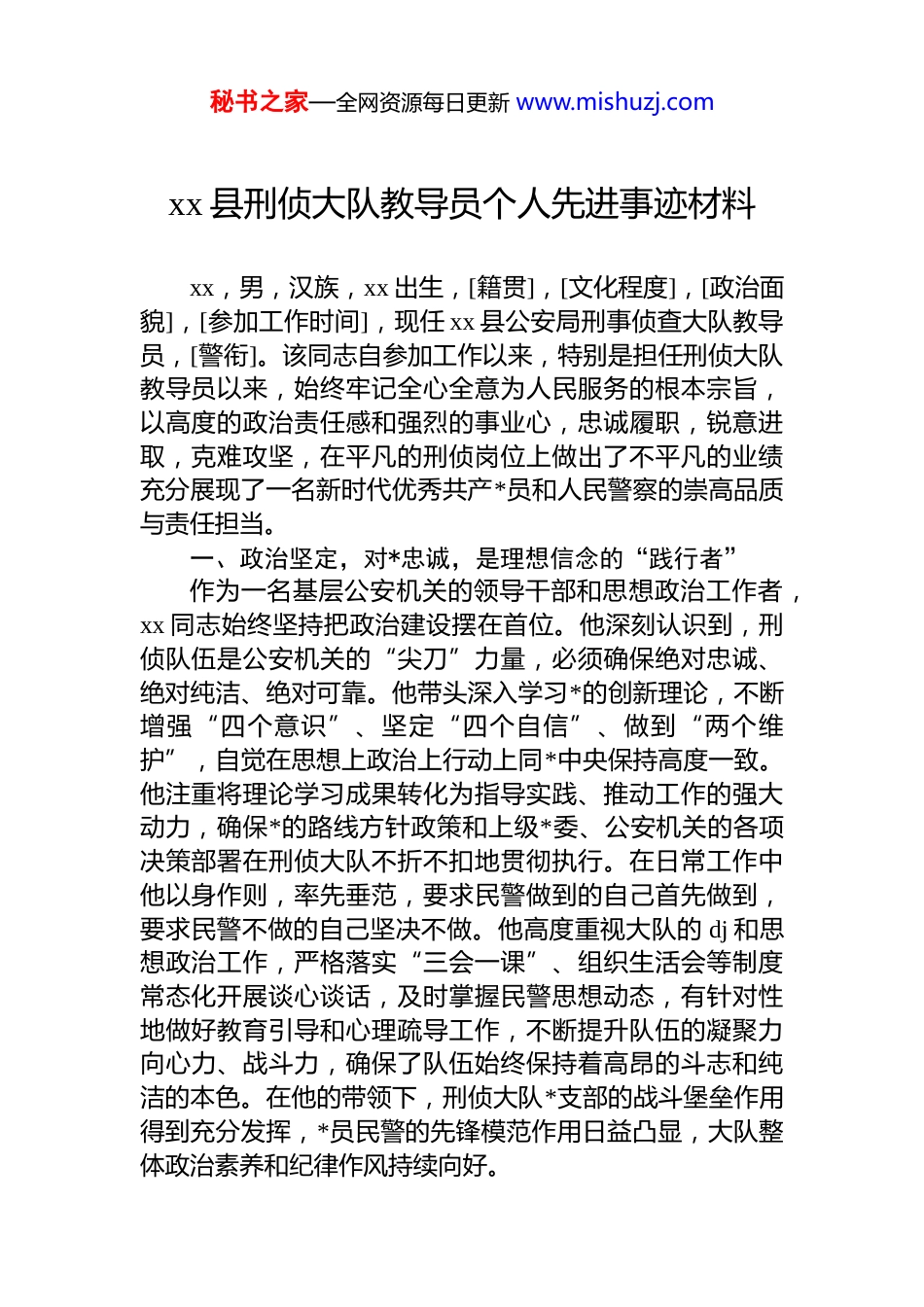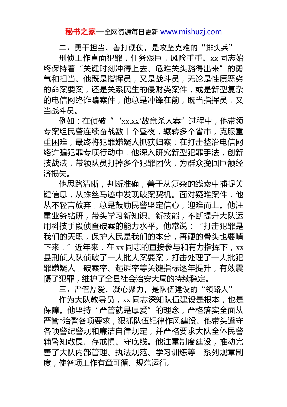 秘书之家—全网资源每日更新 www.mishuzj.comxx 县刑侦大队教导员个人先进事迹材料xx,男,汉族,xx 出生,[籍贯],[文化程度],[政治面貌],[参加工作时间],现任 xx 县公安局刑事侦查大队教导员,[警衔]。该同志自参加工作以来,特别是担任刑侦大队教导员以来,始终牢记全心全意为人民服务的根本宗旨,以高度的政治责任感和强烈的事业心,忠诚履职,锐意进取,克难攻坚,在平凡的刑侦岗位上做出了不平凡的业绩充分展现了一名新时代优秀共产*员和人民警察的崇高品质与责任担当。一、政治坚定,对*忠诚,是理想信念的“践行者”作为一名基层公安机关的领导干部和思想政治工作者,xx 同志始终坚持把政治建设摆在首位。他深刻认识到,刑侦队伍是公安机关的“尖刀”力量,必须确保绝对忠诚、绝对纯洁、绝对可靠。他带头深入学习*的创新理论,不断增强“四个意识”、坚定“四个自信”、做到“两个维护”,自觉在思想上政治上行动上同*中央保持高度一致。他注重将理论学习成果转化为指导实践、推动工作的强大动力,确保*的路线方针政策和上级*委、公安机关的各项决策部署在刑侦大队不折不扣地贯彻执行。在日常工作中他以身作则,率先垂范,要求民警做到的自己首先做到,要求民警不做的自己坚决不做。他高度重视大队的 dj 和思想政治工作,严格落实“三会一课”、组织生活会等制度常态化开展谈心谈话,及时掌握民警思想动态,有针对性地做好教育引导和心理疏导工作,不断提升队伍的凝聚力向心力、战斗力,确保了队伍始终保持着高昂的斗志和纯洁的本色。在他的带领下,刑侦大队*支部的战斗堡垒作用得到充分发挥,*员民警的先锋模范作用日益凸显,大队整体政治素养和纪律作风持续向好。秘书之家—全网资源每日更新 www.mishuzj.com二、勇于担当,善打硬仗,是攻坚克难的“排头兵”刑侦工作直面犯罪,任务艰巨,风险重重。xx 同志始终保持着“关键时刻冲得上去、危难关头豁得出来”的勇气和担当。他既是指挥员,又是战斗员,无论是性质恶劣的命案要案,还是关系民生的侵财类案件,或是新型复杂的电信网络诈骗案件,他总是冲锋在前,既当指挥员,又当战斗员。例如:在侦破“‘xx.xx’故意杀人案”过程中,他带领专案组民警连续奋战数十个昼夜,辗转多个省市,克服重重困难,最终将犯罪嫌疑人抓获归案;在打击整治电信网络诈骗犯罪专项行动中,他深入研究新型犯罪手法,创新技战法,带领队员打掉多个犯罪团伙,为群众挽回巨额经济损失。他思路清晰,判断准确,善于从复杂的线索中捕捉关键信息,从蛛丝马迹中发现破案契机。面对疑难案件,他从不轻言放弃,总是鼓励民警坚定信心,迎难而上。他注重业务钻研,带头学习新知识、新技能,不断提升大队运用科技手段侦查破案的能力水平。他常说:“打击犯罪是我们的天职,保护人民是我们的本分,再硬的骨头也要啃下来!”近年来,在 xx 同志的直接参与和有力指挥下,xx县刑侦大队侦破了一大批大案要案,打击处理了一大批犯罪嫌疑人,破案率、起诉率等关键指标逐年提升,有效震慑了犯罪,维护了全县社会治安大局的持续稳定。三、严管厚爱,凝心聚力,是队伍建设的“领路人”作为大队教导员,xx 同志深知队伍建设是根本,也是保障。他坚持“严管就是厚爱”的理念,严格落实全面从严管*治警各项要求,狠抓队伍纪律作风建设。他带头遵守各项警纪警规和廉洁自律规定,并严格要求大队全体民警辅警知敬畏、存戒惧、守底线。他注重制度建设,推动完善了大队内部管理、执法规范、学习训练等一系列规章制度,使各项工作有章可循、规范运行。秘书之家—全网资源每日更新 www.mishuzj.com在严格管理的同时,他更是一位关心关爱同志的“贴心人”。他熟悉大队每一位民警、辅警的基本情况、性格特点和家庭状况。谁家有困难,他第一时间了解并尽力帮助解决;谁思想上有了疙瘩,他耐心细致地开导化解;谁在工作上取得了成绩,他及时给予肯定和鼓励。他积极争取改善大队的办公、办案条件,努力为大家营造一个良好的工作环境。他关心青年民警的成长,毫无保留地传授工作经验,指导他们快速提升业务能力。他倡导“快乐工作幸福生活”的理念,组织开展形式多...