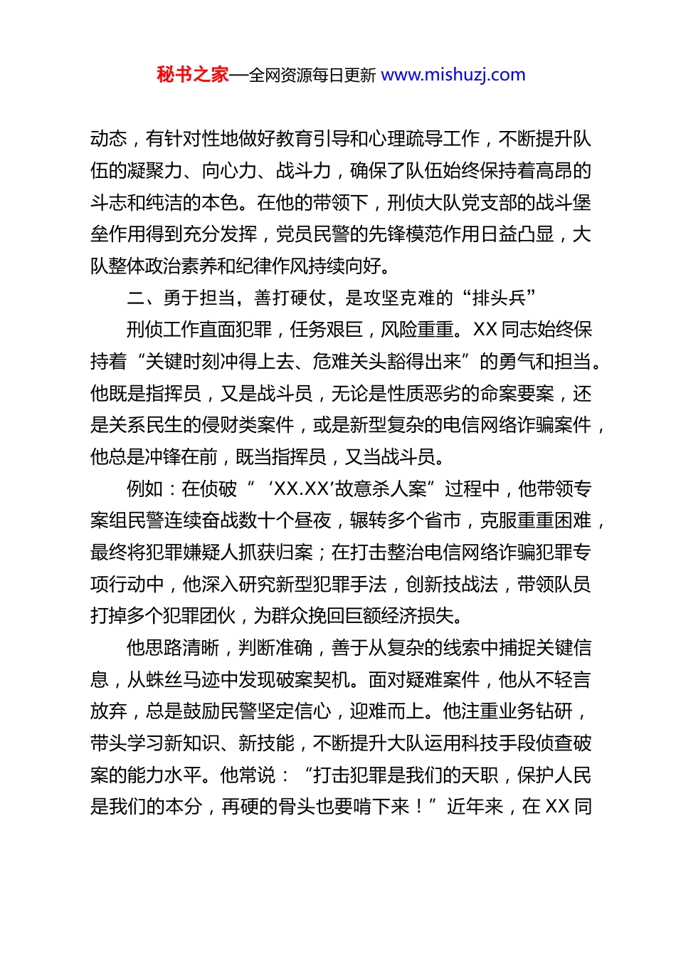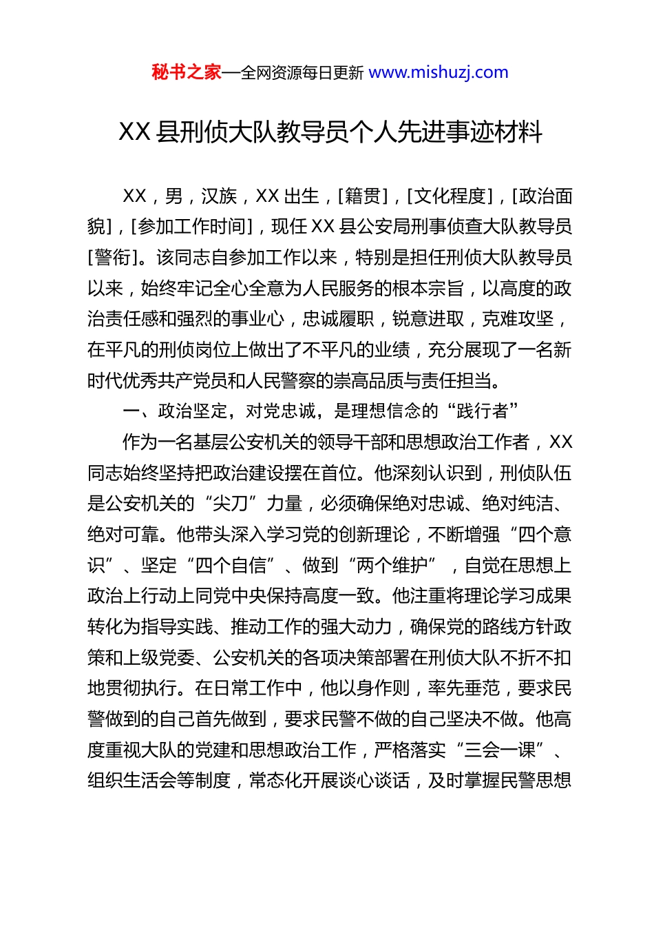 秘书之家—全网资源每日更新 www.mishuzj.comXX 县刑侦大队教导员个人先进事迹材料XX,男,汉族,XX 出生,[籍贯],[文化程度],[政治面貌],[参加工作时间],现任 XX 县公安局刑事侦查大队教导员[警衔]。该同志自参加工作以来,特别是担任刑侦大队教导员以来,始终牢记全心全意为人民服务的根本宗旨,以高度的政治责任感和强烈的事业心,忠诚履职,锐意进取,克难攻坚,在平凡的刑侦岗位上做出了不平凡的业绩,充分展现了一名新时代优秀共产党员和人民警察的崇高品质与责任担当。一、政治坚定,对党忠诚,是理想信念的“践行者”作为一名基层公安机关的领导干部和思想政治工作者,XX同志始终坚持把政治建设摆在首位。他深刻认识到,刑侦队伍是公安机关的“尖刀”力量,必须确保绝对忠诚、绝对纯洁、绝对可靠。他带头深入学习党的创新理论,不断增强“四个意识”、坚定“四个自信”、做到“两个维护”,自觉在思想上政治上行动上同党中央保持高度一致。他注重将理论学习成果转化为指导实践、推动工作的强大动力,确保党的路线方针政策和上级党委、公安机关的各项决策部署在刑侦大队不折不扣地贯彻执行。在日常工作中,他以身作则,率先垂范,要求民警做到的自己首先做到,要求民警不做的自己坚决不做。他高度重视大队的党建和思想政治工作,严格落实“三会一课”、组织生活会等制度,常态化开展谈心谈话,及时掌握民警思想秘书之家—全网资源每日更新 www.mishuzj.com动态,有针对性地做好教育引导和心理疏导工作,不断提升队伍的凝聚力、向心力、战斗力,确保了队伍始终保持着高昂的斗志和纯洁的本色。在他的带领下,刑侦大队党支部的战斗堡垒作用得到充分发挥,党员民警的先锋模范作用日益凸显,大队整体政治素养和纪律作风持续向好。二、勇于担当,善打硬仗,是攻坚克难的“排头兵”刑侦工作直面犯罪,任务艰巨,风险重重。XX 同志始终保持着“关键时刻冲得上去、危难关头豁得出来”的勇气和担当。他既是指挥员,又是战斗员,无论是性质恶劣的命案要案,还是关系民生的侵财类案件,或是新型复杂的电信网络诈骗案件,他总是冲锋在前,既当指挥员,又当战斗员。例如:在侦破“‘XX.XX’故意杀人案”过程中,他带领专案组民警连续奋战数十个昼夜,辗转多个省市,克服重重困难,最终将犯罪嫌疑人抓获归案;在打击整治电信网络诈骗犯罪专项行动中,他深入研究新型犯罪手法,创新技战法,带领队员打掉多个犯罪团伙,为群众挽回巨额经济损失。他思路清晰,判断准确,善于从复杂的线索中捕捉关键信息,从蛛丝马迹中发现破案契机。面对疑难案件,他从不轻言放弃,总是鼓励民警坚定信心,迎难而上。他注重业务钻研,带头学习新知识、新技能,不断提升大队运用科技手段侦查破案的能力水平。他常说:“打击犯罪是我们的天职,保护人民是我们的本分,再硬的骨头也要啃下来!”近年来,在 XX 同秘书之家—全网资源每日更新 www.mishuzj.com志的直接参与和有力指挥下,XX 县刑侦大队侦破了一大批大案要案,打击处理了一大批犯罪嫌疑人,破案率、起诉率等关键指标逐年提升,有效震慑了犯罪,维护了全县社会治安大局的持续稳定。三、严管厚爱,凝心聚力,是队伍建设的“领路人”作为大队教导员,XX 同志深知队伍建设是根本,也是保障。他坚持“严管就是厚爱”的理念,严格落实全面从严管党治警各项要求,狠抓队伍纪律作风建设。他带头遵守各项警纪警规和廉洁自律规定,并严格要求大队全体民警、辅警知敬畏、存戒惧、守底线。他注重制度建设,推动完善了大队内部管理、执法规范、学习训练等一系列规章制度,使各项工作有章可循、规范运行。在严格管理的同时,他更是一位关心关爱同志的“贴心人”。他熟悉大队每一位民警、辅警的基本情况、性格特点和家庭状况。谁家有困难,他第一时间了解并尽力帮助解决;谁思想上有了疙瘩,他耐心细致地开导化解;谁在工作上取得了成绩,他及时给予肯定和鼓励。他积极争取改善大队的办公、办案条件,努力为大家营造一个良好的工作环境。他关心青年民警的成长,毫无保留地传授工作经验,指导他们快速提升业务能力。他倡导“快乐工作、幸福生活”的理念...