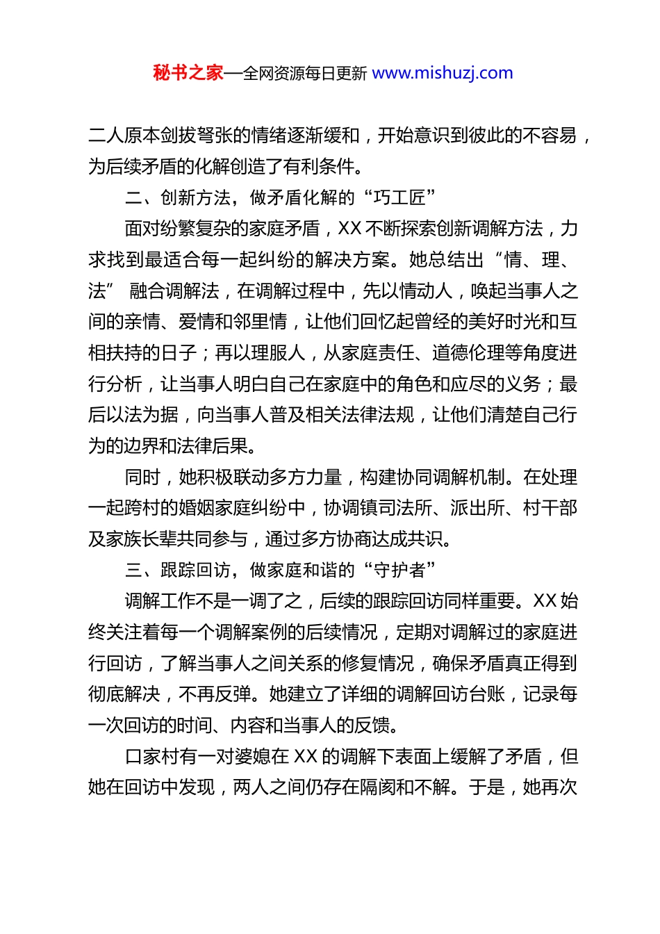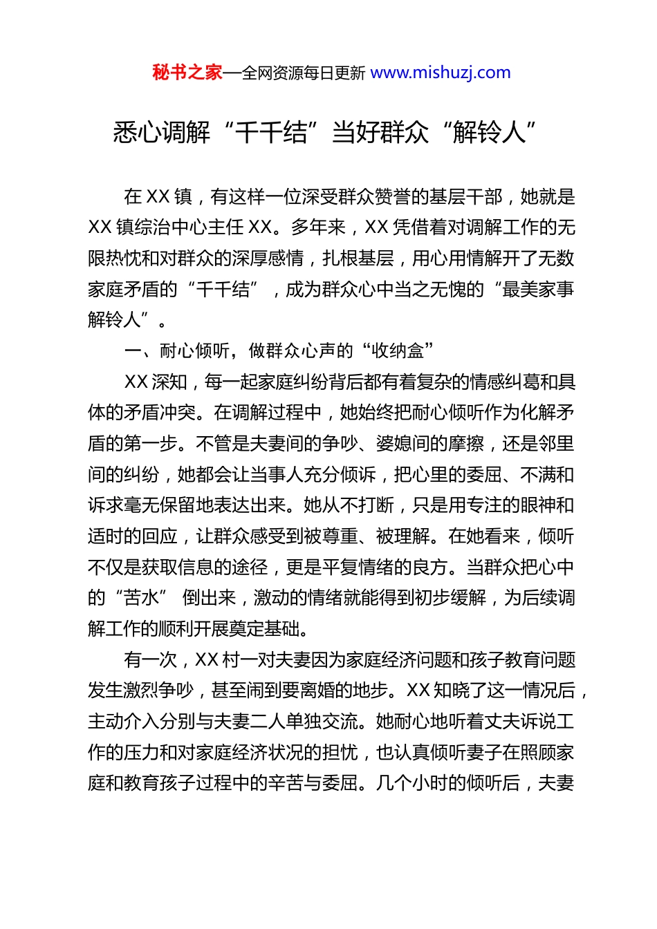 秘书之家—全网资源每日更新 www.mishuzj.com悉心调解“千千结”当好群众“解铃人”在 XX 镇,有这样一位深受群众赞誉的基层干部,她就是XX 镇综治中心主任 XX。多年来,XX 凭借着对调解工作的无限热忱和对群众的深厚感情,扎根基层,用心用情解开了无数家庭矛盾的“千千结”,成为群众心中当之无愧的“最美家事解铃人”。一、耐心倾听,做群众心声的“收纳盒”XX 深知,每一起家庭纠纷背后都有着复杂的情感纠葛和具体的矛盾冲突。在调解过程中,她始终把耐心倾听作为化解矛盾的第一步。不管是夫妻间的争吵、婆媳间的摩擦,还是邻里间的纠纷,她都会让当事人充分倾诉,把心里的委屈、不满和诉求毫无保留地表达出来。她从不打断,只是用专注的眼神和适时的回应,让群众感受到被尊重、被理解。在她看来,倾听不仅是获取信息的途径,更是平复情绪的良方。当群众把心中的“苦水” 倒出来,激动的情绪就能得到初步缓解,为后续调解工作的顺利开展奠定基础。有一次,XX 村一对夫妻因为家庭经济问题和孩子教育问题发生激烈争吵,甚至闹到要离婚的地步。XX 知晓了这一情况后,主动介入分别与夫妻二人单独交流。她耐心地听着丈夫诉说工作的压力和对家庭经济状况的担忧,也认真倾听妻子在照顾家庭和教育孩子过程中的辛苦与委屈。几个小时的倾听后,夫妻秘书之家—全网资源每日更新 www.mishuzj.com二人原本剑拔弩张的情绪逐渐缓和,开始意识到彼此的不容易,为后续矛盾的化解创造了有利条件。二、创新方法,做矛盾化解的“巧工匠”面对纷繁复杂的家庭矛盾,XX 不断探索创新调解方法,力求找到最适合每一起纠纷的解决方案。她总结出“情、理、法” 融合调解法,在调解过程中,先以情动人,唤起当事人之间的亲情、爱情和邻里情,让他们回忆起曾经的美好时光和互相扶持的日子;再以理服人,从家庭责任、道德伦理等角度进行分析,让当事人明白自己在家庭中的角色和应尽的义务;最后以法为据,向当事人普及相关法律法规,让他们清楚自己行为的边界和法律后果。同时,她积极联动多方力量,构建协同调解机制。在处理一起跨村的婚姻家庭纠纷中,协调镇司法所、派出所、村干部及家族长辈共同参与,通过多方协商达成共识。三、跟踪回访,做家庭和谐的“守护者”调解工作不是一调了之,后续的跟踪回访同样重要。XX 始终关注着每一个调解案例的后续情况,定期对调解过的家庭进行回访,了解当事人之间关系的修复情况,确保矛盾真正得到彻底解决,不再反弹。她建立了详细的调解回访台账,记录每一次回访的时间、内容和当事人的反馈。口家村有一对婆媳在 XX 的调解下表面上缓解了矛盾,但她在回访中发现,两人之间仍存在隔阂和不解。于是,她再次秘书之家—全网资源每日更新 www.mishuzj.com上门,组织婆媳俩进行面对面沟通,针对新出现的问题进行调解。经过多次回访和调解,婆媳关系逐渐融洽,最终成为了村里的“和睦家庭”典范。在 XX 的努力下,XX 镇的家庭矛盾纠纷发生率逐年下降,家庭和谐氛围日益浓厚。她用实际行动诠释了一名基层综治工作者的责任与担当,成为群众心中的“最美家事解铃人”,为构建和谐 XX 贡献着自己的力量。