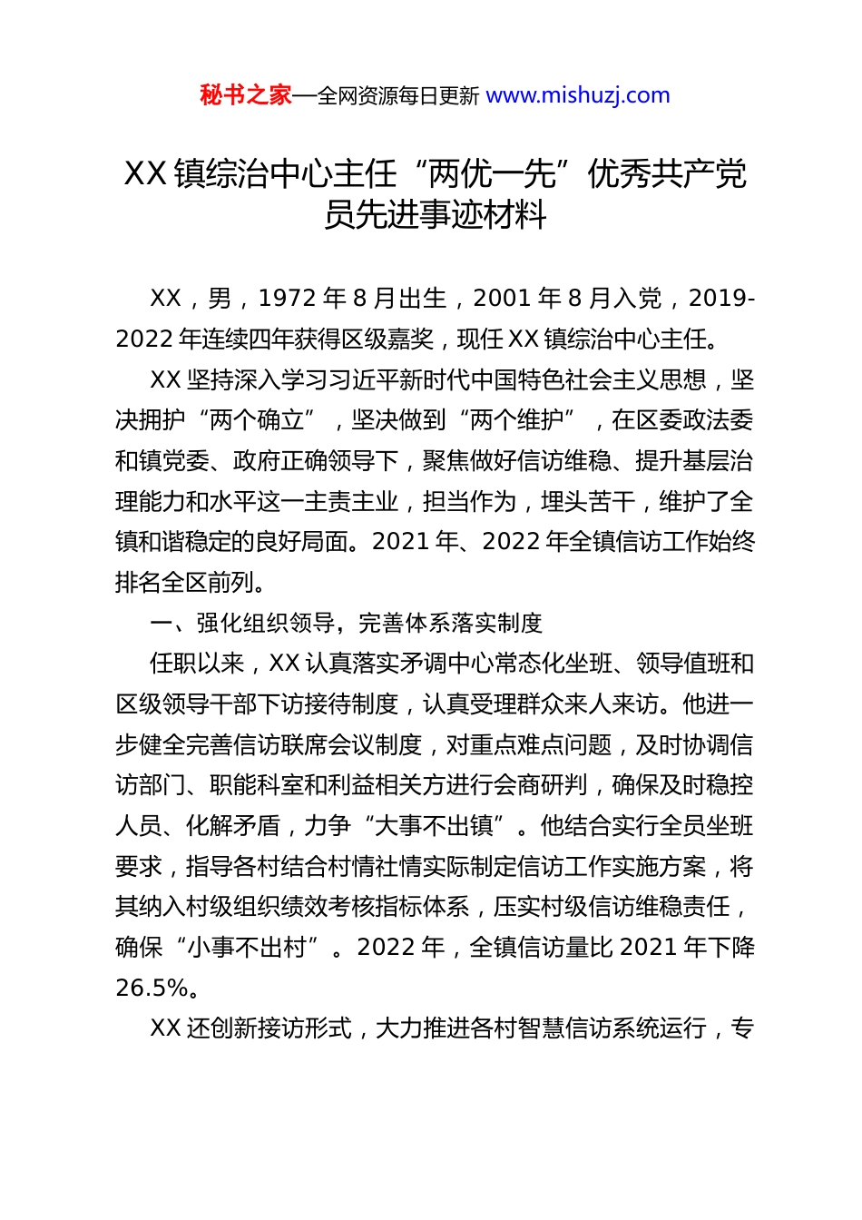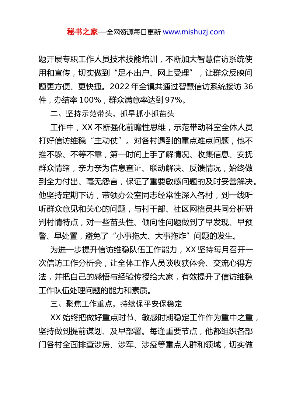 秘书之家—全网资源每日更新 www.mishuzj.comXX 镇综治中心主任“两优一先”优秀共产党员先进事迹材料XX,男,1972 年 8 月出生,2001 年 8 月入党,2019-2022 年连续四年获得区级嘉奖,现任 XX 镇综治中心主任。XX 坚持深入学习习近平新时代中国特色社会主义思想,坚决拥护“两个确立”,坚决做到“两个维护”,在区委政法委和镇党委、政府正确领导下,聚焦做好信访维稳、提升基层治理能力和水平这一主责主业,担当作为,埋头苦干,维护了全镇和谐稳定的良好局面。2021 年、2022 年全镇信访工作始终排名全区前列。一、强化组织领导,完善体系落实制度任职以来,XX 认真落实矛调中心常态化坐班、领导值班和区级领导干部下访接待制度,认真受理群众来人来访。他进一步健全完善信访联席会议制度,对重点难点问题,及时协调信访部门、职能科室和利益相关方进行会商研判,确保及时稳控人员、化解矛盾,力争“大事不出镇”。他结合实行全员坐班要求,指导各村结合村情社情实际制定信访工作实施方案,将其纳入村级组织绩效考核指标体系,压实村级信访维稳责任,确保“小事不出村”。2022 年,全镇信访量比 2021 年下降26.5%。XX 还创新接访形式,大力推进各村智慧信访系统运行,专秘书之家—全网资源每日更新 www.mishuzj.com题开展专职工作人员技术技能培训,不断加大智慧信访系统使用和宣传,切实做到“足不出户、网上受理”,让群众反映问题更方便、更快捷。2022 年全镇共通过智慧信访系统接访 36件,办结率 100%,群众满意率达到 97%。二、坚持示范带头,抓早抓小抓苗头工作中,XX 不断强化前瞻性思维,示范带动科室全体人员打好信访维稳“主动仗”。对各村遇到的重点难点问题,他不推不躲、不等不靠,第一时间上手了解情况、收集信息、安抚群众情绪,亲力亲为信息查证、联动解决、反馈情况,始终做到全力付出、毫无怨言,保证了重要敏感问题的及时妥善解决。他坚持定期下访,带领办公室同志经常性深入各村,到一线听听群众意见和关心的问题,与村干部、社区网格员共同分析研判村情特点,对一些苗头性、倾向性问题做到了早发现、早预警、早处置,避免了“小事拖大、大事拖炸”问题的发生。为进一步提升信访维稳队伍工作能力,XX 坚持每月召开一次信访工作分析会,让全体工作人员谈收获体会、交流心得方法,并把自己的感悟与经验传授给大家,有效提升了信访维稳工作队伍处理问题的能力和素质。三、聚焦工作重点,持续保平安保稳定XX 始终把做好重点时节、敏感时期稳定工作作为重中之重,坚持做到提前谋划、及早部署。每逢重要节点,他都组织各部门各村全面排查涉房、涉军、涉疫等重点人群和领域,切实做秘书之家—全网资源每日更新 www.mishuzj.com到情况清底数明。对镇内列控重点人员,坚持一人一策一专班,全面跟踪思想动态,跟进做好劝导、解释和稳控工作,确保重点人员不失管不失控。在此基础上,XX 还充分发挥网格员的“探头”作用,发动网格员定期对全镇矛盾隐患进行起底清理,坚决把矛盾隐患消灭在萌芽状态。近两年累计处置网格内事件 400 余件,办结率达 100%。这些举措,有力保证了全镇和谐稳定,连续五年实现进京赴市“零上访”。四、强化自身本领,坚持学中干干中学尽管已经从事工作将近 30 年,但 XX 没有固步自封,而是坚持学中干、干中学,不断提升个人能力素质。他积极学习习近平治国理政思想,深刻领会党的二十大精神特别是关于做好基层治理的相关篇目,自觉提升做好信访稳定、不断提升基层综合治理精准化专业化水平的政治站位,自觉把工作放在全区全镇大局中来思考,为准确理解上级要求、强力推进各项制度举措落实奠定了坚实基础。他不断钻研业务知识,探索总结基层信访工作规律和特点,结合全镇实际情况调整工作思路和招法,形成了一整套具有鲜明地域特点、适合镇村实际的信访工作模式。在推进工作中,他还牢固树立法治思想,坚持做到依法依规依制度办事,注重发挥公检法、律师等在基层治理中的联动作用,为有效妥善依法处理信访案件提供了有益遵循。