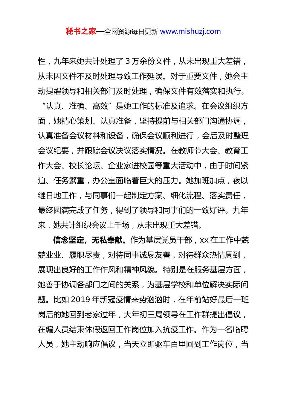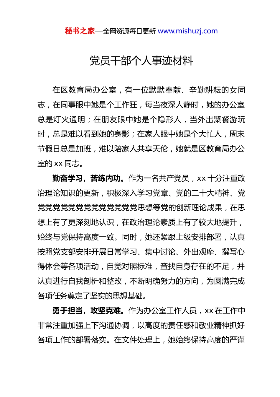 秘书之家—全网资源每日更新 www.mishuzj.com党员干部个人事迹材料在区教育局办公室,有一位默默奉献、辛勤耕耘的女同志,在同事眼中她是个工作狂,每当夜深人静时,她的办公室总是灯火通明;在朋友眼中她是个隐形人,当外出聚餐游玩时,总是难以看到她的身影;在家人眼中她是个大忙人,周末节假日总是加班,难以陪家人共享天伦,她就是区教育局办公室的 xx 同志。勤奋学习,苦练内功。作为一名共产党员,xx 十分注重政治理论知识的更新,积极深入学习党章、党的二十大精神、党党党党党党党党党党党党党党思想等党的创新理论成果,在思想上有了更深刻地认识,在政治理论素质上有了较大地提升,始终与党保持高度一致。同时,她还紧跟上级安排部署,认真按照党支部安排开展日常学习、集中讨论、外出观摩、撰写心得体会等各项活动,自觉对照标准,查找自身存在的不足,并认真进行自我剖析和整改,不断明确努力的方向,为圆满完成各项任务奠定了坚实的思想基础。勇于担当,攻坚克难。作为办公室工作人员,xx 在工作中非常注重加强上下沟通协调,以高度的责任感和敬业精神抓好各项工作的部署落实。在文件处理上,她始终保持高度的严谨秘书之家—全网资源每日更新 www.mishuzj.com性,九年来她共计处理了 3 万余份文件,从未出现重大差错,从未因文件不及时处理导致工作延误。对于重要文件,她会主动提醒领导和相关部门及时处理,确保文件有效落实和执行。“认真、准确、高效”是她工作的标准及追求。在会议组织方面,她精心策划、认真准备,坚持提前与相关部门沟通协调,认真准备会议材料和设备,确保会议顺利进行,会后及时整理会议纪要,并跟踪会议决议落实情况。在教师节大会、教育工作大会、校长论坛、企业家进校园等重大活动中,由于时间紧迫、任务繁重,办公室面临着巨大的压力。她加班加点,夜以继日地工作,与同事们一起制定方案、细化流程、落实责任,最终圆满完成了任务,得到了领导和同事们的一致好评。九年来,她共计组织会议上千场,从未出现重大差错。信念坚定,无私奉献。作为基层党员干部,xx 在工作中兢兢业业、履职尽责,对待同事诚恳友善,对待群众热情周到,展现出良好的工作作风和精神风貌。特别是在服务基层方面,她善于协调各部门之间的关系,为基层学校和单位解决实际问题。比如 2019 年新冠疫情来势汹汹时,在年前站好最后一班岗后的她回到老家过年,大年初三局领导在工作群提出倡议,在编人员结束休假返回工作岗位加入抗疫工作。作为一名临聘人员,她主动响应倡议,当天立即驱车百里回到工作岗位,当秘书之家—全网资源每日更新 www.mishuzj.com时除局领导外,她是第一个到岗的工作人员。在办公室主任及其他人员因疫情原因不能到岗的情况下,她独立承担起办公室的统筹协调工作。没有抗疫物资,她积极协调区属各部门“求”应急物资;需要协调抗疫工作人员,她逐一打电话给各学校做动员工作;需要处理紧急文件,她趁着放下电话的缝隙,立即处理且精确反馈信息给领导作决策;需要统计师生数据信息、她便又充当起数据员,及时汇总信息。那段时间,早上 7 点到办公室,凌晨 1、2 点离开单位,24 小时随叫随到成为她当时的工作常态。在中小学和校外托培机构复工复学中,因为疫情原因经常需要晚上开会,而且很多时候一直开会到晚上 10 点,期间她毫无怨言,协助组织准备会务 50 余场,协助印发防疫文件 100 余份,主动帮助 14 所学校、幼儿园和托培机构解决返学防疫物资问题,及时收集、反馈、解决防疫人员反映的各种问题,并积极参与核酸检测工作,多次放弃休息时间,不计报酬帮助整理、申请物资装备、分发物资,帮助上述单位成功实现复工复学。抗疫期间,因为长期高强度的工作,25 岁的她因为颈椎错位住院一星期,从此落下严重的颈椎病。锐意进取,勇创佳绩。在工作中,xx 始终把学习摆在重要位置,坚持“日学一小时、月读一本书”,主动利用业余时间秘书之家—全网资源每日更新 www.mishuzj.com阅读了大量书籍和文献,不断拓宽自己的知识面和视野,并且积极参加各种培训和学习活动,不断提高自己的业务能力和综合素质。九年来,她共...