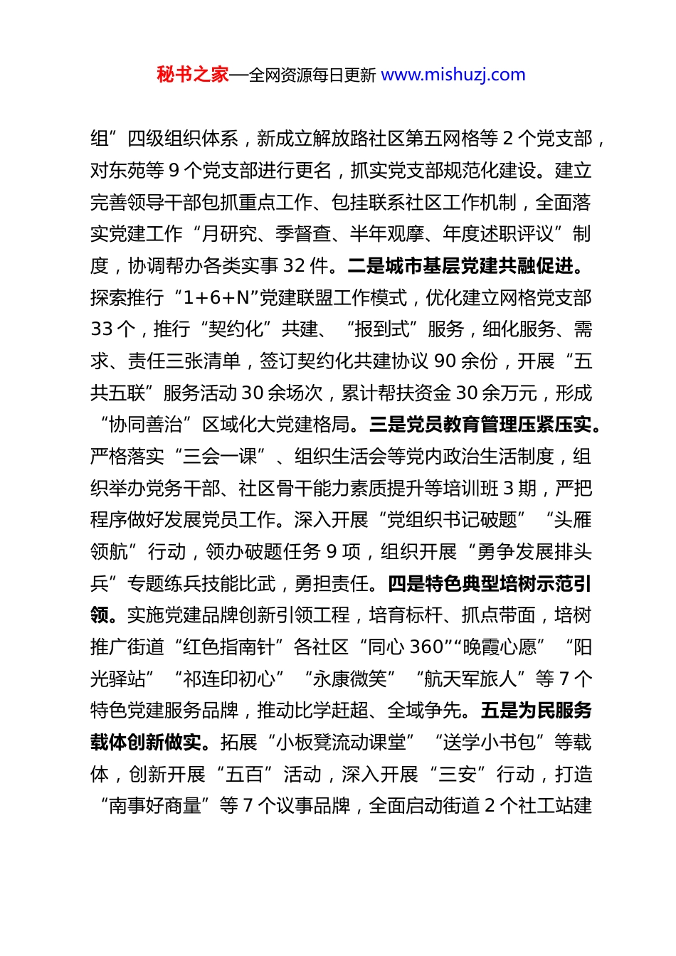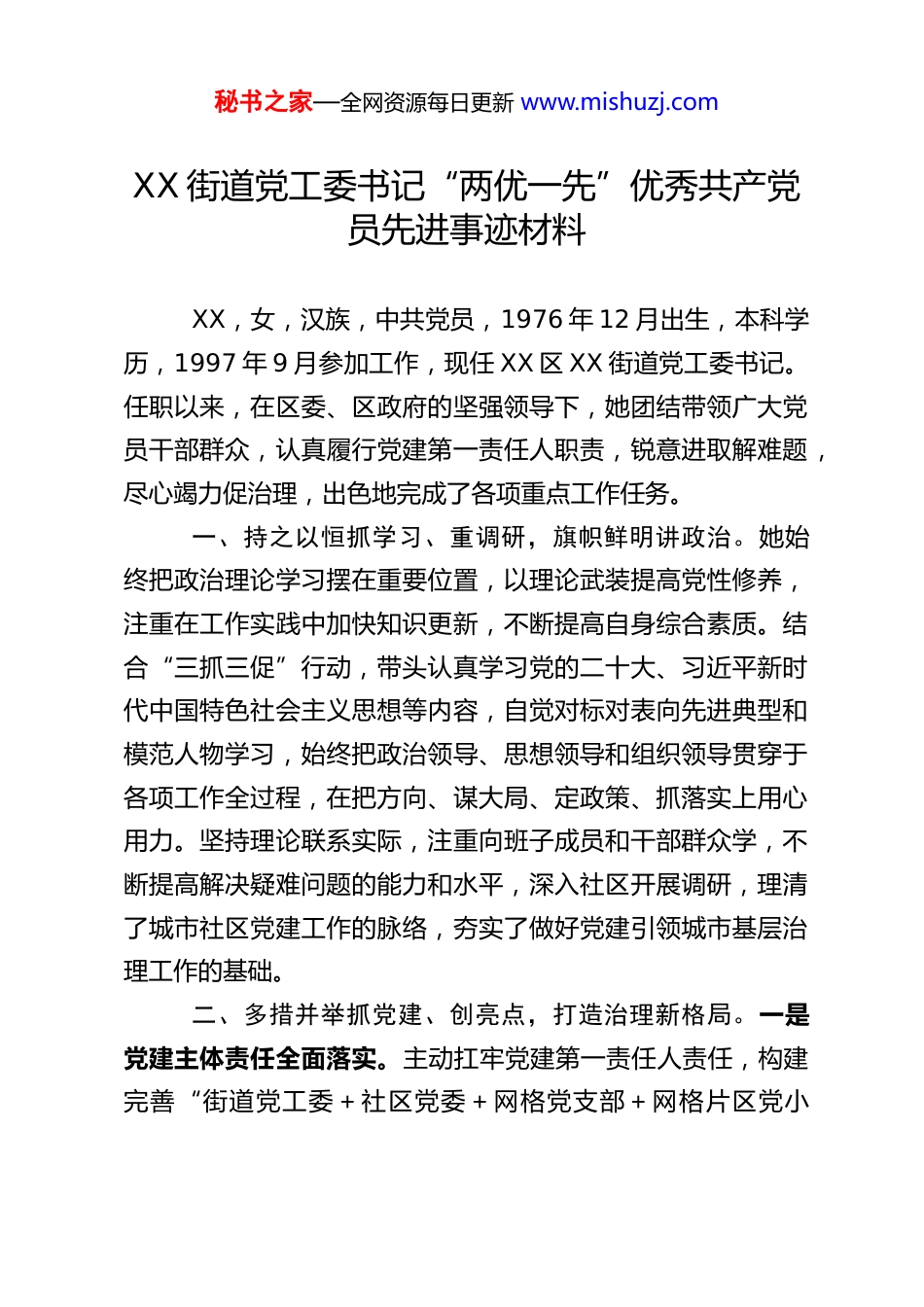 秘书之家—全网资源每日更新 www.mishuzj.comXX 街道党工委书记“两优一先”优秀共产党员先进事迹材料XX,女,汉族,中共党员,1976 年 12 月出生,本科学历,1997 年 9 月参加工作,现任 XX 区 XX 街道党工委书记。任职以来,在区委、区政府的坚强领导下,她团结带领广大党员干部群众,认真履行党建第一责任人职责,锐意进取解难题,尽心竭力促治理,出色地完成了各项重点工作任务。一、持之以恒抓学习、重调研,旗帜鲜明讲政治。她始终把政治理论学习摆在重要位置,以理论武装提高党性修养,注重在工作实践中加快知识更新,不断提高自身综合素质。结合“三抓三促”行动,带头认真学习党的二十大、习近平新时代中国特色社会主义思想等内容,自觉对标对表向先进典型和模范人物学习,始终把政治领导、思想领导和组织领导贯穿于各项工作全过程,在把方向、谋大局、定政策、抓落实上用心用力。坚持理论联系实际,注重向班子成员和干部群众学,不断提高解决疑难问题的能力和水平,深入社区开展调研,理清了城市社区党建工作的脉络,夯实了做好党建引领城市基层治理工作的基础。二、多措并举抓党建、创亮点,打造治理新格局。一是党建主体责任全面落实。主动扛牢党建第一责任人责任,构建完善“街道党工委+社区党委+网格党支部+网格片区党小秘书之家—全网资源每日更新 www.mishuzj.com组”四级组织体系,新成立解放路社区第五网格等 2 个党支部,对东苑等 9 个党支部进行更名,抓实党支部规范化建设。建立完善领导干部包抓重点工作、包挂联系社区工作机制,全面落实党建工作“月研究、季督查、半年观摩、年度述职评议”制度,协调帮办各类实事 32 件。二是城市基层党建共融促进。探索推行“1+6+N”党建联盟工作模式,优化建立网格党支部33 个,推行“契约化”共建、“报到式”服务,细化服务、需求、责任三张清单,签订契约化共建协议 90 余份,开展“五共五联”服务活动 30 余场次,累计帮扶资金 30 余万元,形成“协同善治”区域化大党建格局。三是党员教育管理压紧压实。严格落实“三会一课”、组织生活会等党内政治生活制度,组织举办党务干部、社区骨干能力素质提升等培训班 3 期,严把程序做好发展党员工作。深入开展“党组织书记破题”“头雁领航”行动,领办破题任务 9 项,组织开展“勇争发展排头兵”专题练兵技能比武,勇担责任。四是特色典型培树示范引领。实施党建品牌创新引领工程,培育标杆、抓点带面,培树推广街道“红色指南针”各社区“同心 360”“晚霞心愿”“阳光驿站”“祁连印初心”“永康微笑”“航天军旅人”等 7 个特色党建服务品牌,推动比学赶超、全域争先。五是为民服务载体创新做实。拓展“小板凳流动课堂”“送学小书包”等载体,创新开展“五百”活动,深入开展“三安”行动,打造“南事好商量”等 7 个议事品牌,全面启动街道 2 个社工站建秘书之家—全网资源每日更新 www.mishuzj.com设项目,多形式、广辐射开展“一老一小”专业化服务和为老助残、文化惠民等志愿服务活动 40 余场次,打造“15 分钟近邻幸福生活圈”。六是网格管理服务做深做实。深化“党旗红+网格蓝”城市基层治理体系,建立党建引领“五网融合”联动共治机制,全域开展“红色物业”建设,业委会组建率提升近 8 个百分点,消除无物业小区 7 个,解决天然气架设、路灯亮化等居民群众关心关注的问题 36 件,打造“红色物业”示范点 6 个、“红色出租屋服务管理站”2 个,构建起“小事一格解决、大事全网联动”的工作格局。三、率先垂范严律己、做楷模,树立干部好形象。始终把党的政治纪律和政治规矩挺在最前面,坚决在思想上政治上行动上同以习近平同志为核心的党中央保持高度一致。认真学习《党章》《中国共产党纪律处分条例》等党纪党规,带头遵守纪律,带头执行规定,如实向组织报告个人重大事项。工作中,时刻自重、自省、自警、自励,始终把精力集中在研究和解决实际问题上,把功夫用在抓好工作谋划与措施的落实上。生活中,注重培育健康向上的生活情趣,严把交友关,净化社交圈,注意管好家属和子女,没有假公济私、以权谋私等不廉洁行为,坚持做廉洁奉公的表率。