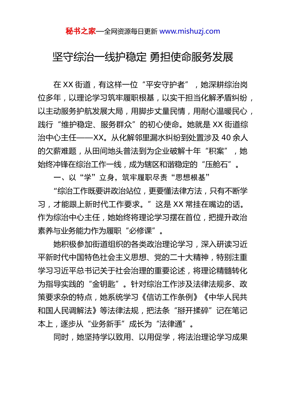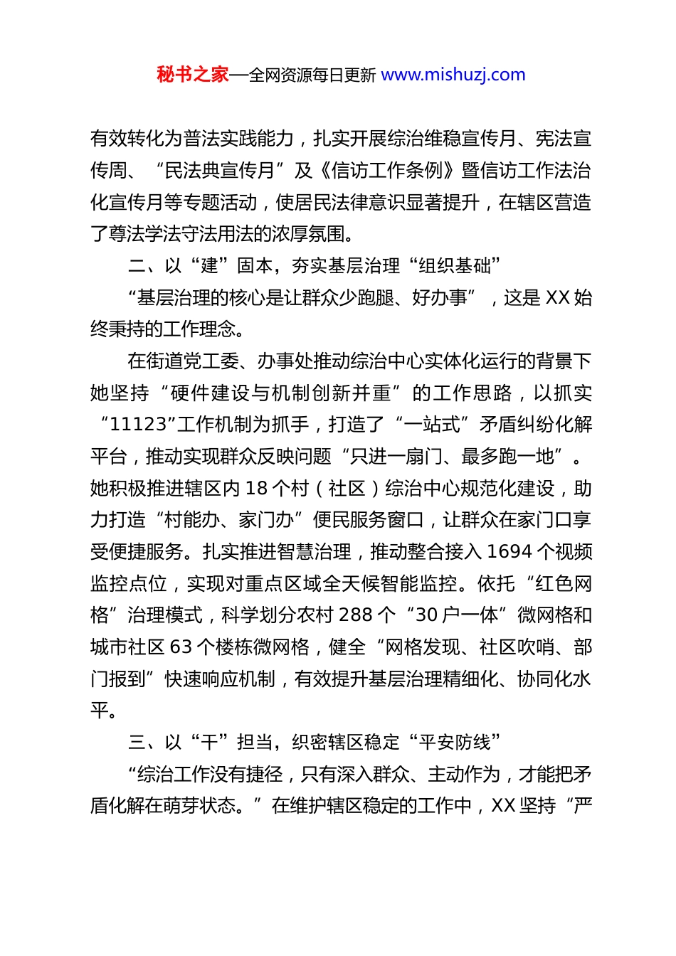 秘书之家—全网资源每日更新 www.mishuzj.com坚守综治一线护稳定 勇担使命服务发展在 XX 街道,有这样一位“平安守护者”,她深耕综治岗位多年,以理论学习筑牢履职根基,以实干担当化解矛盾纠纷,以主动服务护航发展大局,用脚步丈量民情,用耐心温暖民心,践行“维护稳定、服务群众”的初心使命。她就是 XX 街道综治中心主任——XX。从化解邻里漏水纠纷到处置涉及 40 余人的欠薪难题,从田间地头普法到为企业破解十年“积案”,她始终冲锋在综治工作一线,成为辖区和谐稳定的“压舱石”。一、以“学”立身,筑牢履职尽责“思想根基”“综治工作既要讲政治站位,更要懂法律方法,只有不断学习,才能跟上新时代工作要求。”这是 XX 常挂在嘴边的话。作为综治中心主任,她始终将理论学习摆在首位,把提升政治素养与业务能力作为履职“必修课”。她积极参加街道组织的各类政治理论学习,深入研读习近平新时代中国特色社会主义思想、党的二十大精神,特别注重学习习近平总书记关于社会治理的重要论述,将理论精髓转化为指导实践的“金钥匙”。针对综治工作涉及法律法规多、政策要求杂的特点,她系统学习《信访工作条例》《中华人民共和国人民调解法》等法律法规,把法条“掰开揉碎”记在笔记本上,逐步从“业务新手”成长为“法律通”。同时,她坚持学以致用、以用促学,将法治理论学习成果秘书之家—全网资源每日更新 www.mishuzj.com有效转化为普法实践能力,扎实开展综治维稳宣传月、宪法宣传周、“民法典宣传月”及《信访工作条例》暨信访工作法治化宣传月等专题活动,使居民法律意识显著提升,在辖区营造了尊法学法守法用法的浓厚氛围。二、以“建”固本,夯实基层治理“组织基础”“基层治理的核心是让群众少跑腿、好办事”,这是 XX 始终秉持的工作理念。在街道党工委、办事处推动综治中心实体化运行的背景下她坚持“硬件建设与机制创新并重”的工作思路,以抓实“11123”工作机制为抓手,打造了“一站式”矛盾纠纷化解平台,推动实现群众反映问题“只进一扇门、最多跑一地”。她积极推进辖区内 18 个村(社区)综治中心规范化建设,助力打造“村能办、家门办”便民服务窗口,让群众在家门口享受便捷服务。扎实推进智慧治理,推动整合接入 1694 个视频监控点位,实现对重点区域全天候智能监控。依托“红色网格”治理模式,科学划分农村 288 个“30 户一体”微网格和城市社区 63 个楼栋微网格,健全“网格发现、社区吹哨、部门报到”快速响应机制,有效提升基层治理精细化、协同化水平。三、以“干”担当,织密辖区稳定“平安防线”“综治工作没有捷径,只有深入群众、主动作为,才能把矛盾化解在萌芽状态。”在维护辖区稳定的工作中,XX 坚持“严秘书之家—全网资源每日更新 www.mishuzj.com格调处”与“灵活处理”相结合,巧妙将亲情、乡情、友情融入调解,以情动人、以理服人。为及时掌握辖区矛盾隐患,她认真落实“日常排查+专项排查”工作机制,带领综治中心工作人员深入村组走访,对邻里纠纷、土地争议、家庭矛盾、物业管理等问题逐一登记造册,建立“问题台账”并实行“销号管理”。XX 积极发挥桥梁纽带作用,在玺礼农业发展有限公司欠薪案件中,她依托“中心吹哨—部门报到”联动机制,协同县人力资源和社会保障局组建专项处置工作组。联合工作组赴现场开展实地核查,并组织总承包方、劳务分包方及农民工代表召开三方协调会,同步建立专项工作台账实施每日督办,在她和同事们的努力下,成功帮助 44 名农民工追回拖欠工资,赢得群众一致赞誉。春节期间,一起因婚姻破裂引发的冲突存在“民转刑”风险,XX 接报后联合多部门迅速介入,通过情绪疏导、司法引导和妥善安置,当日即劝返当事人离开事发地,避免冲突升级。近一年来,她参与调解各类矛盾纠纷 100 余起,调解成功率达95%以上,真正实现“小事不出村组、大事不出街道”。四、以“服”践诺,注入营商环境“稳定动能”“综治工作不能只守‘一亩三分地’,更要主动融入发展大局,为企业解难题、护好航。”XX 始终认为,良好的营商环境离不开稳定的社会环境,她主动将综治工作与街道经济...