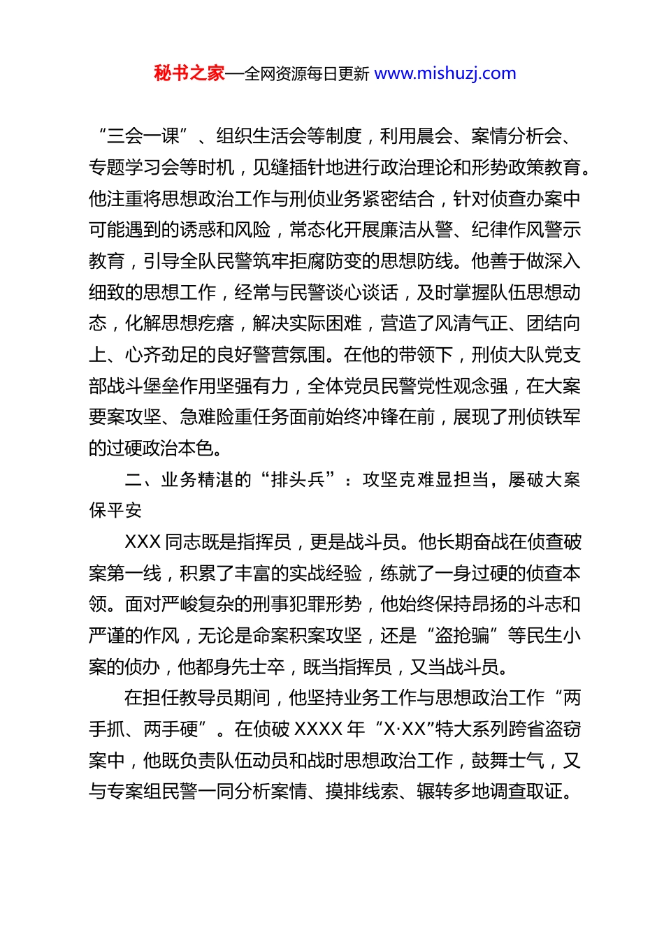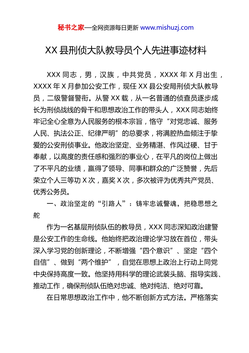 秘书之家—全网资源每日更新 www.mishuzj.comXX 县刑侦大队教导员个人先进事迹材料XXX 同志,男,汉族,中共党员, XXXX 年 X 月出生,XXXX 年 X 月参加公安工作,现任 XX 县公安局刑侦大队教导员,二级警督警衔。从警 XX 载,从一名普通的侦查员逐步成长为刑侦战线的骨干和思想政治工作的带头人,XXX 同志始终牢记全心全意为人民服务的根本宗旨,恪守“对党忠诚、服务人民、执法公正、纪律严明”的总要求,将满腔热血倾注于挚爱的公安刑侦事业。他政治坚定、业务精湛、作风过硬、甘于奉献,以高度的责任感和强烈的事业心,在平凡的岗位上做出了不平凡的业绩,赢得了领导、同事和群众的广泛赞誉,先后荣立个人三等功 X 次,嘉奖 X 次,多次被评为优秀共产党员、优秀公务员。一、政治坚定的“引路人”:铸牢忠诚警魂,把稳思想之舵作为一名基层刑侦队伍的教导员,XXX 同志深知政治建警是公安工作的生命线。他始终把政治理论学习放在首位,带头深入学习党的创新理论,不断增强“四个意识”、坚定“四个自信”、做到“两个维护”,自觉在思想上政治上行动上同党中央保持高度一致。他坚持用科学的理论武装头脑、指导实践、推动工作,确保刑侦队伍绝对忠诚、绝对纯洁、绝对可靠。在日常思想政治工作中,他不断创新方式方法。严格落实秘书之家—全网资源每日更新 www.mishuzj.com“三会一课”、组织生活会等制度,利用晨会、案情分析会、专题学习会等时机,见缝插针地进行政治理论和形势政策教育。他注重将思想政治工作与刑侦业务紧密结合,针对侦查办案中可能遇到的诱惑和风险,常态化开展廉洁从警、纪律作风警示教育,引导全队民警筑牢拒腐防变的思想防线。他善于做深入细致的思想工作,经常与民警谈心谈话,及时掌握队伍思想动态,化解思想疙瘩,解决实际困难,营造了风清气正、团结向上、心齐劲足的良好警营氛围。在他的带领下,刑侦大队党支部战斗堡垒作用坚强有力,全体党员民警党性观念强,在大案要案攻坚、急难险重任务面前始终冲锋在前,展现了刑侦铁军的过硬政治本色。二、业务精湛的“排头兵”:攻坚克难显担当,屡破大案保平安XXX 同志既是指挥员,更是战斗员。他长期奋战在侦查破案第一线,积累了丰富的实战经验,练就了一身过硬的侦查本领。面对严峻复杂的刑事犯罪形势,他始终保持昂扬的斗志和严谨的作风,无论是命案积案攻坚,还是“盗抢骗”等民生小案的侦办,他都身先士卒,既当指挥员,又当战斗员。在担任教导员期间,他坚持业务工作与思想政治工作“两手抓、两手硬”。在侦破 XXXX 年“X·XX”特大系列跨省盗窃案中,他既负责队伍动员和战时思想政治工作,鼓舞士气,又与专案组民警一同分析案情、摸排线索、辗转多地调查取证。秘书之家—全网资源每日更新 www.mishuzj.com历时三个多月,他带领专案组克服重重困难,最终成功打掉一个流窜多省作案的职业盗窃团伙,抓获犯罪嫌疑人 XX 名,破获案件百余起,为群众挽回经济损失 XX 余万元。在扫黑除恶专项斗争中,他主动请缨,参与侦办 X 起涉黑恶案件,与战友们一起深入调查取证,固定完善证据链,面对威胁恐吓毫不退缩,最终将犯罪团伙成员全部绳之以法,有力维护了社会公平正义。近年来,他直接参与或指挥侦破各类重大刑事案件 XX余起,抓获犯罪嫌疑人 XXX 余名,为维护 XX 县社会治安大局稳定做出了突出贡献。他常说:“刑警的天职就是破案,群众看公安,关键看破案。案子破了,群众的安全感满意度才能提升。”三、队伍建设的“贴心人”:严管厚爱聚警心,淬炼过硬铁军作为教导员,XXX 同志深知队伍建设是根本。他始终坚持“严管就是厚爱”的理念,狠抓队伍规范化管理。结合实际,协助大队长健全完善了大队内部管理、执法办案、学习训练等一系列规章制度,并带头严格执行,使队伍管理有章可循、有据可依。他高度重视民警能力素质提升,积极组织参加各类业务培训、技能比武,开展“师徒结对”、案例研讨、模拟演练等活动,营造比学赶超的浓厚氛围,有效提升了全队民警的侦查破案能力和执法办案水平。在严格管理的同时,他更是一位“暖心”的教导员。他时秘书之家—全网资源每日...