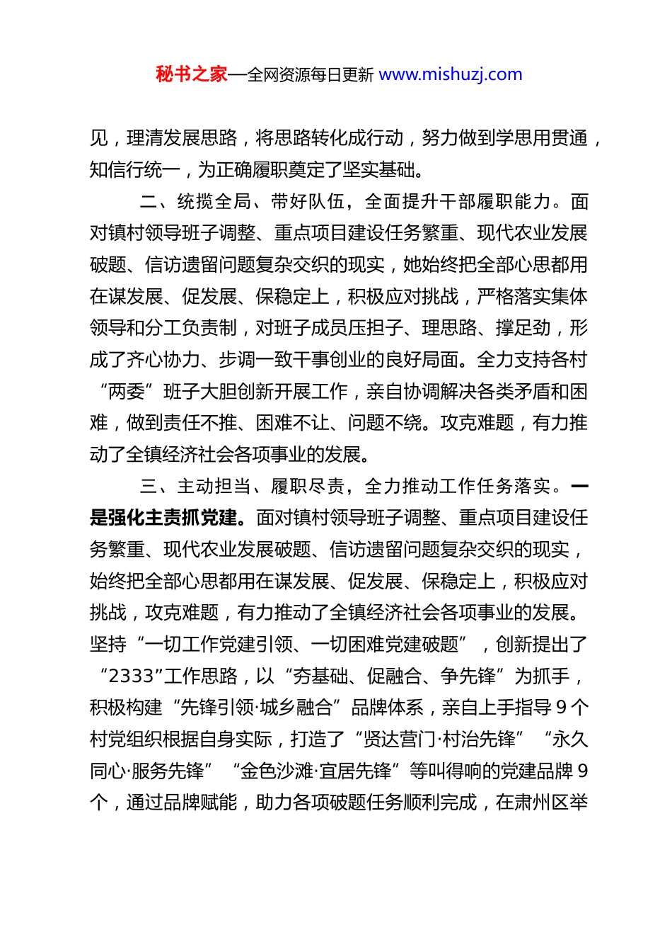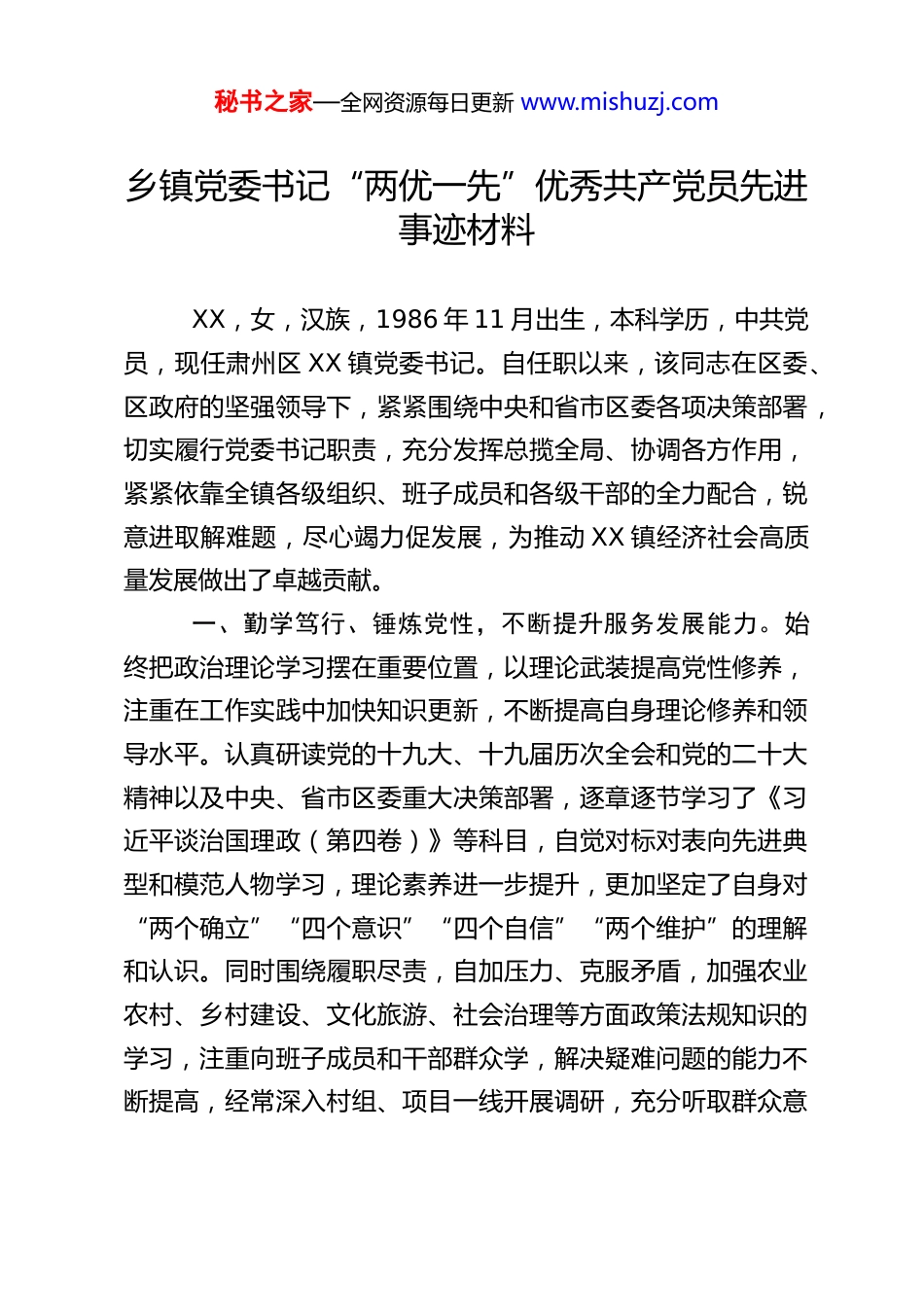 秘书之家—全网资源每日更新 www.mishuzj.com乡镇党委书记“两优一先”优秀共产党员先进事迹材料XX,女,汉族,1986 年 11 月出生,本科学历,中共党员,现任肃州区 XX 镇党委书记。自任职以来,该同志在区委、区政府的坚强领导下,紧紧围绕中央和省市区委各项决策部署,切实履行党委书记职责,充分发挥总揽全局、协调各方作用,紧紧依靠全镇各级组织、班子成员和各级干部的全力配合,锐意进取解难题,尽心竭力促发展,为推动 XX 镇经济社会高质量发展做出了卓越贡献。一、勤学笃行、锤炼党性,不断提升服务发展能力。始终把政治理论学习摆在重要位置,以理论武装提高党性修养,注重在工作实践中加快知识更新,不断提高自身理论修养和领导水平。认真研读党的十九大、十九届历次全会和党的二十大精神以及中央、省市区委重大决策部署,逐章逐节学习了《习近平谈治国理政(第四卷)》等科目,自觉对标对表向先进典型和模范人物学习,理论素养进一步提升,更加坚定了自身对“两个确立”“四个意识”“四个自信”“两个维护”的理解和认识。同时围绕履职尽责,自加压力、克服矛盾,加强农业农村、乡村建设、文化旅游、社会治理等方面政策法规知识的学习,注重向班子成员和干部群众学,解决疑难问题的能力不断提高,经常深入村组、项目一线开展调研,充分听取群众意秘书之家—全网资源每日更新 www.mishuzj.com见,理清发展思路,将思路转化成行动,努力做到学思用贯通,知信行统一,为正确履职奠定了坚实基础。二、统揽全局、带好队伍,全面提升干部履职能力。面对镇村领导班子调整、重点项目建设任务繁重、现代农业发展破题、信访遗留问题复杂交织的现实,她始终把全部心思都用在谋发展、促发展、保稳定上,积极应对挑战,严格落实集体领导和分工负责制,对班子成员压担子、理思路、撑足劲,形成了齐心协力、步调一致干事创业的良好局面。全力支持各村“两委”班子大胆创新开展工作,亲自协调解决各类矛盾和困难,做到责任不推、困难不让、问题不绕。攻克难题,有力推动了全镇经济社会各项事业的发展。三、主动担当、履职尽责,全力推动工作任务落实。一是强化主责抓党建。面对镇村领导班子调整、重点项目建设任务繁重、现代农业发展破题、信访遗留问题复杂交织的现实,始终把全部心思都用在谋发展、促发展、保稳定上,积极应对挑战,攻克难题,有力推动了全镇经济社会各项事业的发展。坚持“一切工作党建引领、一切困难党建破题”,创新提出了“2333”工作思路,以“夯基础、促融合、争先锋”为抓手,积极构建“先锋引领·城乡融合”品牌体系,亲自上手指导 9 个村党组织根据自身实际,打造了“贤达营门·村治先锋”“永久同心·服务先锋”“金色沙滩·宜居先锋”等叫得响的党建品牌 9个,通过品牌赋能,助力各项破题任务顺利完成,在肃州区举秘书之家—全网资源每日更新 www.mishuzj.com办的“喜迎二十大、建功新时代”乡镇党委书记破题大比武活动中获得一等奖;深入推进留守老人妇女儿童和特困群众关爱服务行动暨乡村振兴“岗位大练兵、业务大比武”活动,本人代表肃州区参加了甘肃省乡村振兴“岗位大练兵、业务大比武”省联赛活动,获得二等奖。二是身体力行促发展。面对繁重的工作任务,扛牢“一把手”主体责任,以时不我待、只争朝夕的紧迫感,顶压奋进,推动各项发展任务高质量落实。紧紧围绕建设全国“一村一品”示范村镇目标,深入一线,多方调研,争取省市区各类项目资金,建成 XX 镇万亩高效设施蔬菜核心园区,为全镇蔬菜产业发展注入了新动能。坚持“上争”“外引”“内聚”三管齐下,积极与市教育局对接协调,在龙德盛建立研学基地,指导拍摄祁连花青果酒、蒲公英茶、龙德盛草莓等特色产品宣传推荐微视频,推出“XX 有礼”文创产品,规划特色生态文旅“一日游”的精品旅游线路。抢抓农房改造机遇,全程把关规划设计,积极争取农村基础设施建设项目,镇村整体面貌得到全面提升。稳步推进城中村改造,针对 XX 和春光村 7 个村民小组 518 户拆迁多年未安置的问题,主动扛起责任,除春光村 4 组其他安置小区已全部开工建设。三是倾心尽力惠民生。牢固...