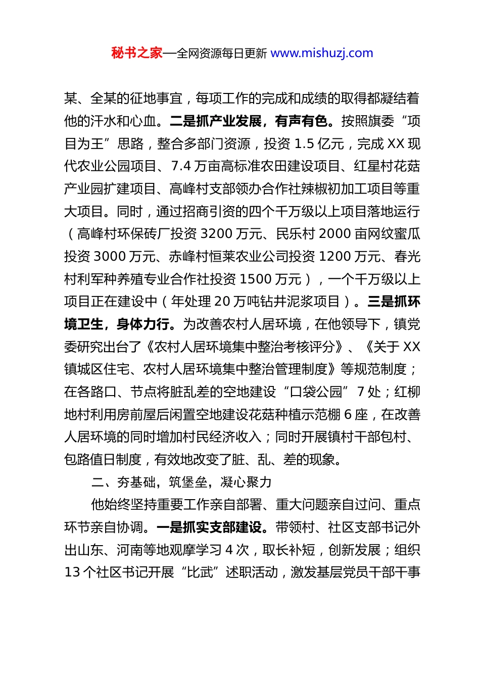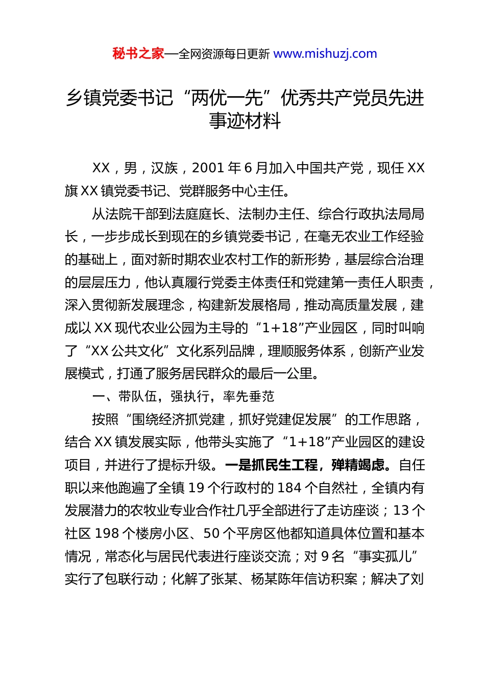 秘书之家—全网资源每日更新 www.mishuzj.com乡镇党委书记“两优一先”优秀共产党员先进事迹材料XX,男,汉族,2001 年 6 月加入中国共产党,现任 XX旗 XX 镇党委书记、党群服务中心主任。从法院干部到法庭庭长、法制办主任、综合行政执法局局长,一步步成长到现在的乡镇党委书记,在毫无农业工作经验的基础上,面对新时期农业农村工作的新形势,基层综合治理的层层压力,他认真履行党委主体责任和党建第一责任人职责,深入贯彻新发展理念,构建新发展格局,推动高质量发展,建成以 XX 现代农业公园为主导的“1+18”产业园区,同时叫响了“XX 公共文化”文化系列品牌,理顺服务体系,创新产业发展模式,打通了服务居民群众的最后一公里。一、带队伍,强执行,率先垂范按照“围绕经济抓党建,抓好党建促发展”的工作思路,结合 XX 镇发展实际,他带头实施了“1+18”产业园区的建设项目,并进行了提标升级。一是抓民生工程,殚精竭虑。自任职以来他跑遍了全镇 19 个行政村的 184 个自然社,全镇内有发展潜力的农牧业专业合作社几乎全部进行了走访座谈;13 个社区 198 个楼房小区、50 个平房区他都知道具体位置和基本情况,常态化与居民代表进行座谈交流;对 9 名“事实孤儿”实行了包联行动;化解了张某、杨某陈年信访积案;解决了刘秘书之家—全网资源每日更新 www.mishuzj.com某、全某的征地事宜,每项工作的完成和成绩的取得都凝结着他的汗水和心血。二是抓产业发展,有声有色。按照旗委“项目为王”思路,整合多部门资源,投资 1.5 亿元,完成 XX 现代农业公园项目、7.4 万亩高标准农田建设项目、红星村花菇产业园扩建项目、高峰村支部领办合作社辣椒初加工项目等重大项目。同时,通过招商引资的四个千万级以上项目落地运行(高峰村环保砖厂投资 3200 万元、民乐村 2000 亩网纹蜜瓜投资 3000 万元、赤峰村恒莱农业公司投资 1200 万元、春光村利军种养殖专业合作社投资 1500 万元),一个千万级以上项目正在建设中(年处理 20 万吨钻井泥浆项目)。三是抓环境卫生,身体力行。为改善农村人居环境,在他领导下,镇党委研究出台了《农村人居环境集中整治考核评分》、《关于 XX镇城区住宅、农村人居环境集中整治管理制度》等规范制度;在各路口、节点将脏乱差的空地建设“口袋公园”7 处;红柳地村利用房前屋后闲置空地建设花菇种植示范棚 6 座,在改善人居环境的同时增加村民经济收入;同时开展镇村干部包村、包路值日制度,有效地改变了脏、乱、差的现象。二、夯基础,筑堡垒,凝心聚力他始终坚持重要工作亲自部署、重大问题亲自过问、重点环节亲自协调。一是抓实支部建设。带领村、社区支部书记外出山东、河南等地观摩学习 4 次,取长补短,创新发展;组织13 个社区书记开展“比武”述职活动,激发基层党员干部干事秘书之家—全网资源每日更新 www.mishuzj.com创业新活力;解决了 5 个社区办公场所难的问题。二是高标准创新完成上级任务。依托 XX 镇现代农业公园完成了 XX 镇东线产业带的项目建设工作(花菇园区扩建、农产品深加工厂选址、设施农业建设、环保砖厂的建设、农产品初加工厂区建设),在完成一、二、三产业融合发展的情况下,改善了周边村庄的人居环境。三是强化党群服务中心阵地建设。投资 100 余万元对红星村、民乐村、帐房村、塞上星社区党群服务中心进行了提标升级工程。四是开展通道补树植绿行动。在 311 省道 XX段、春光路、黄团线两侧开展了 30 余公里的“点缀式”绿化,种植了马兰、格桑花、步步高等花草,同时补植国槐、岩松、沙枣、山桃山杏等 15000 余颗。三、提干劲,促发展,攻坚克难他始终坚持党建引领,充分发挥党委总揽全局作用、基层党组织战斗堡垒作用和党员先锋模范作用。一是强化队伍建设,激发干事创业新活力。通过抓党员的教育管理、人才队伍建设、制度建设,举办村社区党员集中培训 2 次,每个村储备 35 岁以下后备力量 1 名,建立健全完善制度 4 项,选任 3 名 90 后年轻干部担任社区书记。二是强化品牌创建,推动工作实现新突破。实施“一居一品”、“一村一品...