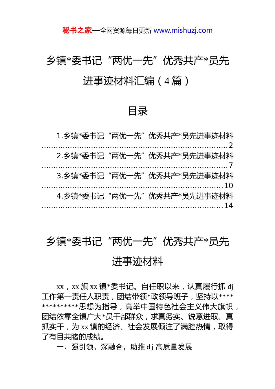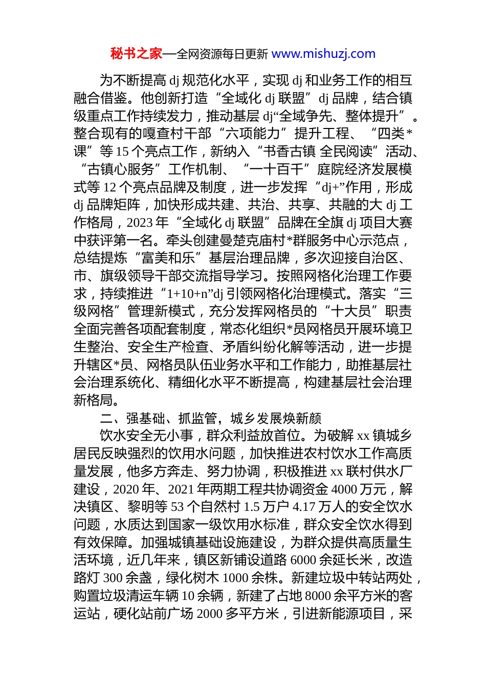 秘书之家—全网资源每日更新 www.mishuzj.com乡镇*委书记“两优一先”优秀共产*员先进事迹材料汇编(4 篇)目录1.乡镇*委书记“两优一先”优秀共产*员先进事迹材料...............................................................................22.乡镇*委书记“两优一先”优秀共产*员先进事迹材料...............................................................................73.乡镇*委书记“两优一先”优秀共产*员先进事迹材料.............................................................................104.乡镇*委书记“两优一先”优秀共产*员先进事迹材料.............................................................................14乡镇*委书记“两优一先”优秀共产*员先进事迹材料xx,xx 旗 xx 镇*委书记。自任职以来,认真履行抓 dj工作第一责任人职责,团结带领*政领导班子,坚持以**************思想为指导,高举中国特色社会主义伟大旗帜,团结依靠全镇广大*员干部群众,求真务实、锐意进取、真抓实干,为 xx 镇的经济、社会发展倾注了满腔热情,取得了有目共睹的成绩。一、强引领、深融合,助推 dj 高质量发展秘书之家—全网资源每日更新 www.mishuzj.com为不断提高 dj 规范化水平,实现 dj 和业务工作的相互融合借鉴。他创新打造“全域化 dj 联盟”dj 品牌,结合镇级重点工作持续发力,推动基层 dj“全域争先、整体提升”。整合现有的嘎查村干部“六项能力”提升工程、“四类*课”等 15 个亮点工作,新纳入“书香古镇 全民阅读”活动、“古镇心服务”工作机制、“一十百千”庭院经济发展模式等 12 个亮点品牌及制度,进一步发挥“dj+”作用,形成dj 品牌矩阵,加快形成共建、共治、共享、共融的大 dj 工作格局,2023 年“全域化 dj 联盟”品牌在全旗 dj 项目大赛中获评第一名。牵头创建曼楚克庙村*群服务中心示范点,总结提炼“富美和乐”基层治理品牌,多次迎接自治区、市、旗级领导干部交流指导学习。按照网格化治理工作要求,持续推进“1+10+n”dj 引领网格化治理模式。落实“三级网格”管理新模式,充分发挥网格员的“十大员”职责全面完善各项配套制度,常态化组织*员网格员开展环境卫生整治、安全生产检查、矛盾纠纷化解等活动,进一步提升辖区*员、网格员队伍业务水平和工作能力,助推基层社会治理系统化、精细化水平不断提高,构建基层社会治理新格局。二、强基础、抓监管,城乡发展焕新颜饮水安全无小事,群众利益放首位。为破解 xx 镇城乡居民反映强烈的饮用水问题,加快推进农村饮水工作高质量发展,他多方奔走、努力协调,积极推进 xx 联村供水厂建设,2020 年、2021 年两期工程共协调资金 4000 万元,解决镇区、黎明等 53 个自然村 1.5 万户 4.17 万人的安全饮水问题,水质达到国家一级饮用水标准,群众安全饮水得到有效保障。加强城镇基础设施建设,为群众提供高质量生活环境,近几年来,镇区新铺设道路 6000 余延长米,改造路灯 300 余盏,绿化树木 1000 余株。新建垃圾中转站两处,购置垃圾清运车辆 10 余辆,新建了占地 8000 余平方米的客运站,硬化站前广场 2000 多平方米,引进新能源项目,采秘书之家—全网资源每日更新 www.mishuzj.com取电供热方式,解决了康泰龙庭小区 150 户 2 万㎡冬季取暖问题。新建通村水泥路 70 公里,安装嘎查村路灯 1000 盏。改扩建 xx 镇变电所,筹建黄花筒变电所,实施衙门营子等15 个嘎查村农村电网改造升级工程,协调资金 1000 多万元解决了北乌兰额日格自然村多年未通照明电问题,改变了该村无电历史,群众对此拍手叫好。三、抓产业、调结构,农牧业发展谱新篇为加快全镇农牧业高效快速发展,他提出按照“南果、中稻、北辣椒,养殖产业全覆盖,商贸联合促发展”的总体工作思路,大力发展红干椒、葵花、西瓜等高效特色经济作物,培育林果、红干椒、沙地西瓜等农业产品品牌,打造“高产玉米试验示范区”“经济林产业示范区”“红干椒特色产业示范区”“绿色水稻种植示范区”,大力发展劳务输出。全镇种植面积年均达...