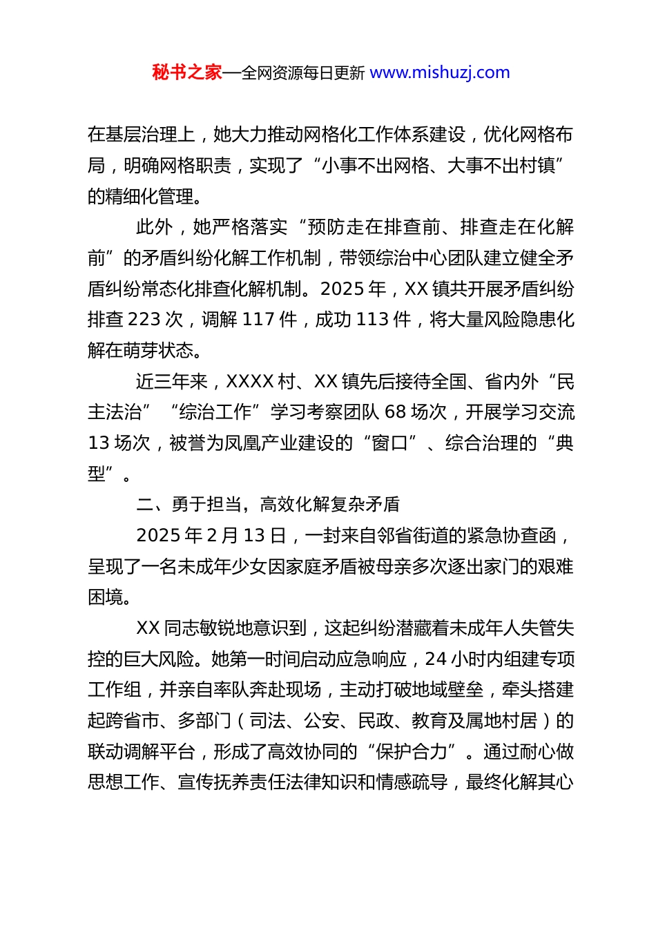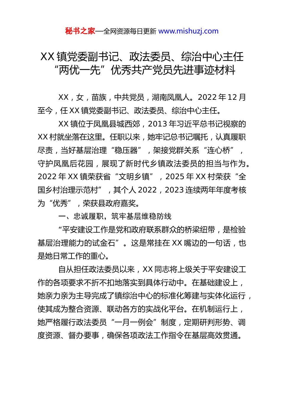 秘书之家—全网资源每日更新 www.mishuzj.comXX 镇党委副书记、政法委员、综治中心主任“两优一先”优秀共产党员先进事迹材料XX,女,苗族,中共党员,湖南凤凰人。2022 年 12 月至今,任 XX 镇党委副书记、政法委员、综治中心主任。XX 镇位于凤凰县城西郊,2013 年习近平总书记视察的XX 村就坐落在这里。任职以来,她牢记总书记嘱托,认真履职尽责,当好基层治理“稳压器”,架接党群关系“连心桥”,守护凤凰后花园,展现了新时代乡镇政法委员的担当与作为。2022 年 XX 镇荣获省“文明乡镇”,2025 年 XX 村荣获“全国乡村治理示范村”,其个人 2022,2023 连续两年年度考核为“优秀”,荣获县政府嘉奖。一、忠诚履职,筑牢基层维稳防线“平安建设工作是党和政府联系群众的桥梁纽带,是检验基层治理能力的试金石”。这是常挂在 XX 嘴边的一句话,也是她日常工作的重心。自从担任政法委员以来,XX 同志将上级关于平安建设工作的各项要求不折不扣地落实到具体行动中。在基础建设上,她亲力亲为主导完成了镇综治中心的标准化筹建与实体化运行,使其成为整合资源、联动各方的实战化平台。在机制运行上,她严格履行政法委员“一月一例会”制度,定期研判形势、调度资源、督办要事,确保各项政法工作指令在基层高效贯通。秘书之家—全网资源每日更新 www.mishuzj.com在基层治理上,她大力推动网格化工作体系建设,优化网格布局,明确网格职责,实现了“小事不出网格、大事不出村镇”的精细化管理。此外,她严格落实“预防走在排查前、排查走在化解前”的矛盾纠纷化解工作机制,带领综治中心团队建立健全矛盾纠纷常态化排查化解机制。2025 年,XX 镇共开展矛盾纠纷排查 223 次,调解 117 件,成功 113 件,将大量风险隐患化解在萌芽状态。近三年来,XXXX 村、XX 镇先后接待全国、省内外“民主法治”“综治工作”学习考察团队 68 场次,开展学习交流13 场次,被誉为凤凰产业建设的“窗口”、综合治理的“典型”。二、勇于担当,高效化解复杂矛盾2025 年 2 月 13 日,一封来自邻省街道的紧急协查函,呈现了一名未成年少女因家庭矛盾被母亲多次逐出家门的艰难困境。XX 同志敏锐地意识到,这起纠纷潜藏着未成年人失管失控的巨大风险。她第一时间启动应急响应,24 小时内组建专项工作组,并亲自率队奔赴现场,主动打破地域壁垒,牵头搭建起跨省市、多部门(司法、公安、民政、教育及属地村居)的联动调解平台,形成了高效协同的“保护合力”。通过耐心做思想工作、宣传抚养责任法律知识和情感疏导,最终化解其心秘书之家—全网资源每日更新 www.mishuzj.com中坚冰,最终促使当事人态度转变。纠纷调解成功后,XX 同志的工作并未止步,她意识到构建“全链条”保护网的重要性,立即前往救助站探望安抚何某萌,并马不停蹄地协调学校为其铺平返校之路,确保调解成果的持续稳固,让这起濒临失控的纠纷得到圆满化解。这只是 XX 日常工作的一个缩影。她常说:“纠纷调解如救火,居民平安我心安。”2023 年来,走访群众 200 余人次,成功调解矛盾纠纷 23 起,帮扶困难群众 15 人次。三、创新机制,提升信访工作质效信访,是送上门来的群众工作。担任乡镇政法委员以来,XX 把信访群众当“家人”,把信访案件当“家事”,积极倡导“首接负责、限时办结、跟踪回访”的闭环管理模式,确保群众诉求“件件有着落、事事有回音”。2025 年 7 月 7 日,发生在林寨村村道的交通事故,造成一死一伤的严重后果。在前期调解未能达成一致的情况下,赔偿问题久拖不决,死者家属情绪激动,选择通过信访渠道反映诉求。XX 同志接到该信访案件后,立即将其纳入重点督办台账,实行“一案一策”精准化解。她亲自约访当事人,耐心倾听诉求,稳定当事人情绪;同时组织镇调委会、司法所、村两委召开专题协调会,厘清案件症结。在充分了解双方履行能力与诉求差距的基础上,她多次秘书之家—全网资源每日更新 www.mishuzj.com组织面对面调解,一方面依据《民法典》等法律法规明晰责任,另一方面从人情事理出发引导双方换位思考。经过不懈努力,最终促成双方自愿达...