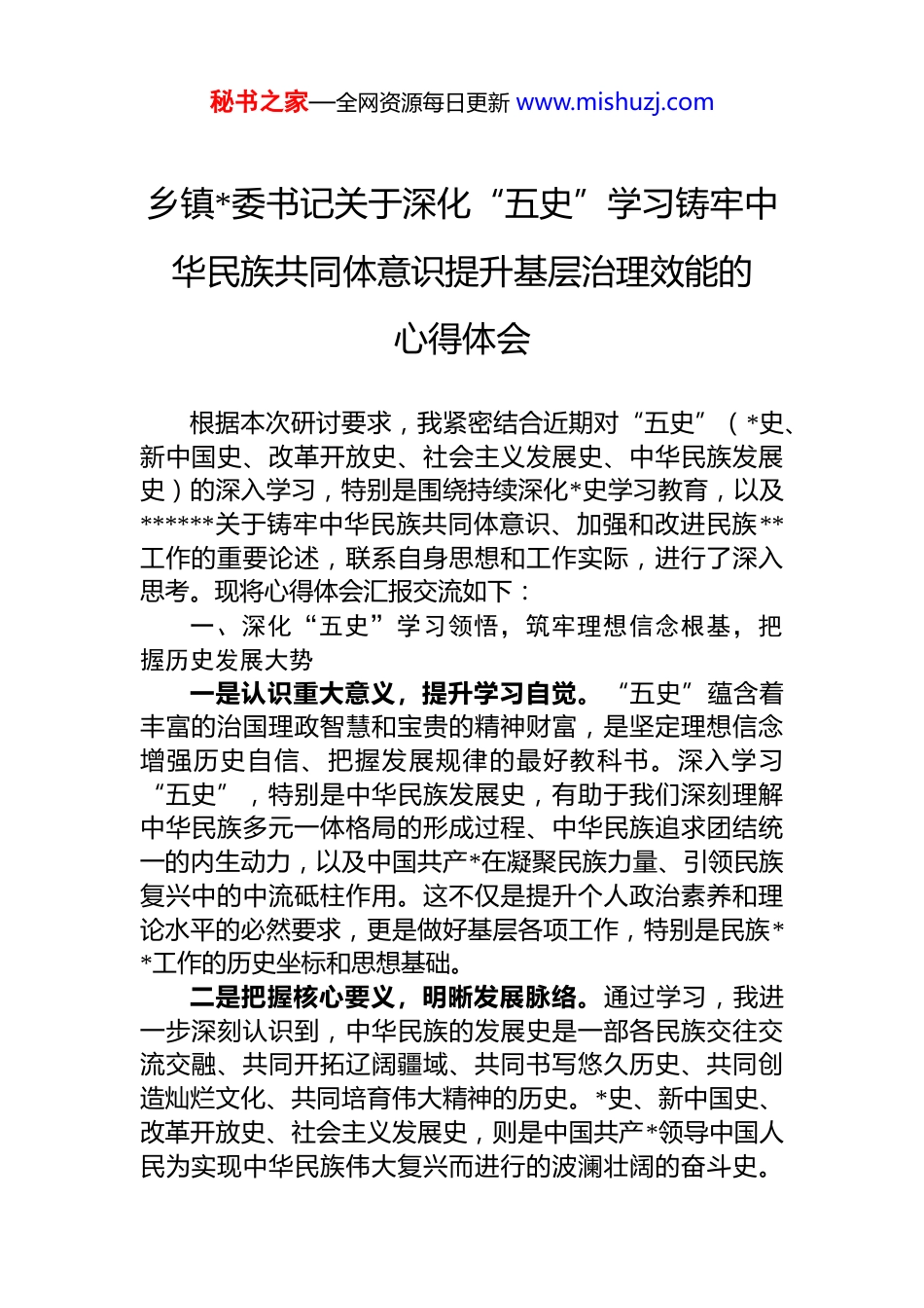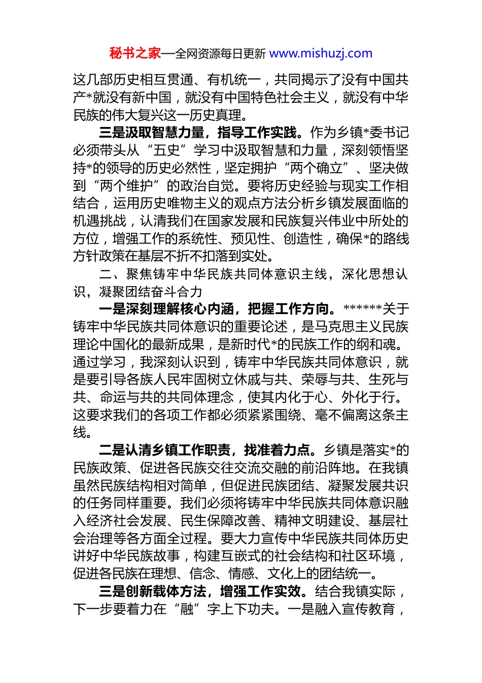 秘书之家—全网资源每日更新 www.mishuzj.com乡镇*委书记关于深化“五史”学习铸牢中华民族共同体意识提升基层治理效能的心得体会根据本次研讨要求,我紧密结合近期对“五史”(*史、新中国史、改革开放史、社会主义发展史、中华民族发展史)的深入学习,特别是围绕持续深化*史学习教育,以及******关于铸牢中华民族共同体意识、加强和改进民族**工作的重要论述,联系自身思想和工作实际,进行了深入思考。现将心得体会汇报交流如下:一、深化“五史”学习领悟,筑牢理想信念根基,把握历史发展大势一是认识重大意义,提升学习自觉。“五史”蕴含着丰富的治国理政智慧和宝贵的精神财富,是坚定理想信念增强历史自信、把握发展规律的最好教科书。深入学习“五史”,特别是中华民族发展史,有助于我们深刻理解中华民族多元一体格局的形成过程、中华民族追求团结统一的内生动力,以及中国共产*在凝聚民族力量、引领民族复兴中的中流砥柱作用。这不仅是提升个人政治素养和理论水平的必然要求,更是做好基层各项工作,特别是民族**工作的历史坐标和思想基础。二是把握核心要义,明晰发展脉络。通过学习,我进一步深刻认识到,中华民族的发展史是一部各民族交往交流交融、共同开拓辽阔疆域、共同书写悠久历史、共同创造灿烂文化、共同培育伟大精神的历史。*史、新中国史、改革开放史、社会主义发展史,则是中国共产*领导中国人民为实现中华民族伟大复兴而进行的波澜壮阔的奋斗史。秘书之家—全网资源每日更新 www.mishuzj.com这几部历史相互贯通、有机统一,共同揭示了没有中国共产*就没有新中国,就没有中国特色社会主义,就没有中华民族的伟大复兴这一历史真理。三是汲取智慧力量,指导工作实践。作为乡镇*委书记必须带头从“五史”学习中汲取智慧和力量,深刻领悟坚持*的领导的历史必然性,坚定拥护“两个确立”、坚决做到“两个维护”的政治自觉。要将历史经验与现实工作相结合,运用历史唯物主义的观点方法分析乡镇发展面临的机遇挑战,认清我们在国家发展和民族复兴伟业中所处的方位,增强工作的系统性、预见性、创造性,确保*的路线方针政策在基层不折不扣落到实处。二、聚焦铸牢中华民族共同体意识主线,深化思想认识,凝聚团结奋斗合力一是深刻理解核心内涵,把握工作方向。******关于铸牢中华民族共同体意识的重要论述,是马克思主义民族理论中国化的最新成果,是新时代*的民族工作的纲和魂。通过学习,我深刻认识到,铸牢中华民族共同体意识,就是要引导各族人民牢固树立休戚与共、荣辱与共、生死与共、命运与共的共同体理念,使其内化于心、外化于行。这要求我们的各项工作都必须紧紧围绕、毫不偏离这条主线。二是认清乡镇工作职责,找准着力点。乡镇是落实*的民族政策、促进各民族交往交流交融的前沿阵地。在我镇虽然民族结构相对简单,但促进民族团结、凝聚发展共识的任务同样重要。我们必须将铸牢中华民族共同体意识融入经济社会发展、民生保障改善、精神文明建设、基层社会治理等各方面全过程。要大力宣传中华民族共同体历史讲好中华民族故事,构建互嵌式的社会结构和社区环境,促进各民族在理想、信念、情感、文化上的团结统一。三是创新载体方法,增强工作实效。结合我镇实际,下一步要着力在“融”字上下功夫。一是融入宣传教育,秘书之家—全网资源每日更新 www.mishuzj.com利用新时代文明实践所(站)、村民大会、文化广场等阵地,开展形式多样的主题活动,增强各族群众对中华文化的认同。二是融入产业发展,在推动乡村振兴中,注重保障各民族群众公平参与发展、共享发展成果。三是融入基层治理,将民族团结进步创建与平安建设、法治建设、精神文明建设等相结合,依法保障各族群众合法权益,妥善处理涉及民族因素的矛盾纠纷,筑牢社会和谐稳定的根基。三、贯彻落实民族**工作重要论述,提升治理能力,维护和谐稳定局面一是提高政治站位,把握政策要求。******关于民族**工作的重要论述,系统阐述了新时代民族**工作的方针原则、重点任务和实践要求,为我们做好基层民族**工作提供了根本遵循。必须深刻理解坚持我国**中国化方向的重大意义,准确把握*的**工作基本...