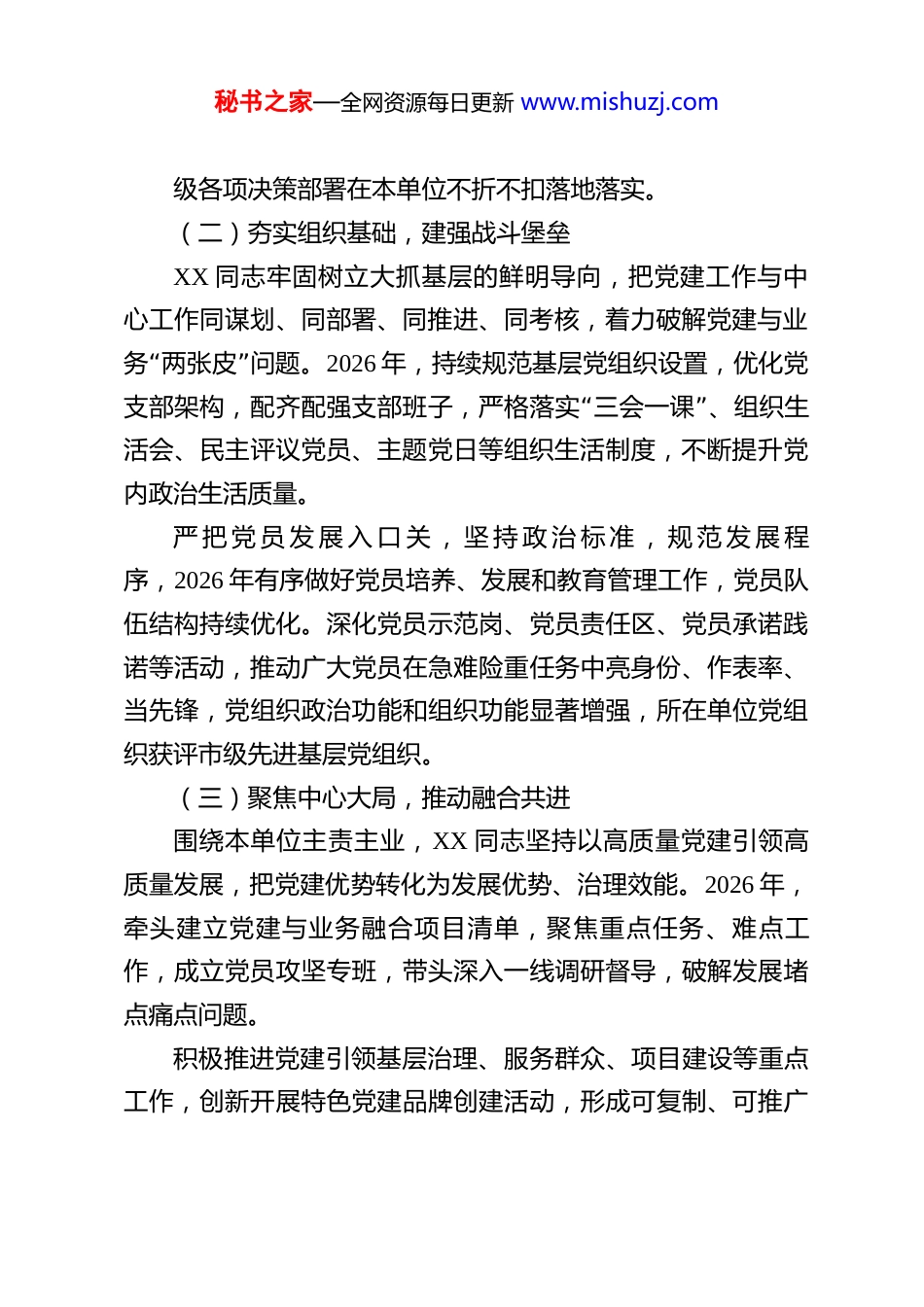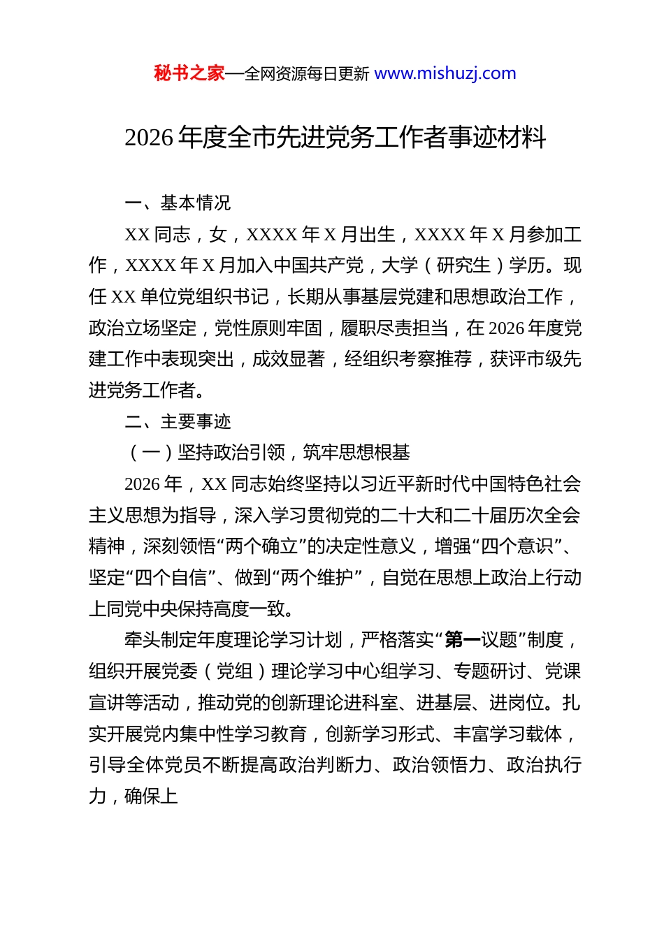 秘书之家—全网资源每日更新 www.mishuzj.com2026 年度全市先进党务工作者事迹材料 一、基本情况XX 同志,女,XXXX 年 X 月出生,XXXX 年 X 月参加工作,XXXX 年 X 月加入中国共产党,大学(研究生)学历。现任 XX 单位党组织书记,长期从事基层党建和思想政治工作,政治立场坚定,党性原则牢固,履职尽责担当,在 2026 年度党建工作中表现突出,成效显著,经组织考察推荐,获评市级先进党务工作者。二、主要事迹(一)坚持政治引领,筑牢思想根基2026 年,XX 同志始终坚持以习近平新时代中国特色社会主义思想为指导,深入学习贯彻党的二十大和二十届历次全会“”“”精神,深刻领悟 两个确立 的决定性意义,增强 四个意识 、“”“”坚定 四个自信 、做到 两个维护 ,自觉在思想上政治上行动上同党中央保持高度一致。“牵头制定年度理论学习计划,严格落实 第一”议题 制度,组织开展党委(党组)理论学习中心组学习、专题研讨、党课宣讲等活动,推动党的创新理论进科室、进基层、进岗位。扎实开展党内集中性学习教育,创新学习形式、丰富学习载体,引导全体党员不断提高政治判断力、政治领悟力、政治执行力,确保上秘书之家—全网资源每日更新 www.mishuzj.com级各项决策部署在本单位不折不扣落地落实。(二)夯实组织基础,建强战斗堡垒XX 同志牢固树立大抓基层的鲜明导向,把党建工作与中心工作同谋划、同部署、同推进、同考核,着力破解党建与业“”务 两张皮 问题。2026 年,持续规范基层党组织设置,优化党“”支部架构,配齐配强支部班子,严格落实 三会一课 、组织生活会、民主评议党员、主题党日等组织生活制度,不断提升党内政治生活质量。严 把 党 员 发 展 入 口 关 , 坚 持 政 治 标 准 , 规 范 发 展 程序,2026 年有序做好党员培养、发展和教育管理工作,党员队伍结构持续优化。深化党员示范岗、党员责任区、党员承诺践诺等活动,推动广大党员在急难险重任务中亮身份、作表率、当先锋,党组织政治功能和组织功能显著增强,所在单位党组织获评市级先进基层党组织。(三)聚焦中心大局,推动融合共进围绕本单位主责主业,XX 同志坚持以高质量党建引领高质量发展,把党建优势转化为发展优势、治理效能。2026 年,牵头建立党建与业务融合项目清单,聚焦重点任务、难点工作,成立党员攻坚专班,带头深入一线调研督导,破解发展堵点痛点问题。积极推进党建引领基层治理、服务群众、项目建设等重点工作,创新开展特色党建品牌创建活动,形成可复制、可推广秘书之家—全网资源每日更新 www.mishuzj.com的经验做法。主动对接服务对象和基层群众,常态化开展走访调研、结对帮扶、志愿服务等活动,用心用情解决群众急难愁盼问题,以实际行动践行以人民为中心的发展思想,群众满意度持续提升。(四)严守纪律规矩,弘扬优良作风XX 同志始终严守党的政治纪律和政治规矩,带头落实中央八项规定及其实施细则精神,坚决纠治形式主义、官僚主义。2026 年,扎实推进党风廉政建设,认真履行全面从严治党主体责任,常态化开展纪律教育、警示教育,引导党员干部知敬畏、存戒惧、守底线。坚持民主集中制,重大事项集体研究、民主决策,自觉接受组织和群众监督。公道正派、廉洁自律,甘于奉献、担当作为,以过硬作风树立新时代党务工作者良好形象,带动形成风清气正、干事创业的良好政治生态。三、总结2026 年以来,XX 同志坚守党务工作岗位,恪尽职守、锐意进取,真抓实干、务求实效,在理论武装、组织建设、融合发展、作风建设等方面取得突出成绩,充分发挥了党务工作者的骨干带头作用,为推动本单位党建工作提质增效、服务全市经济社会发展大局作出了积极贡献,是新时代基层党务工作者的先进典型。