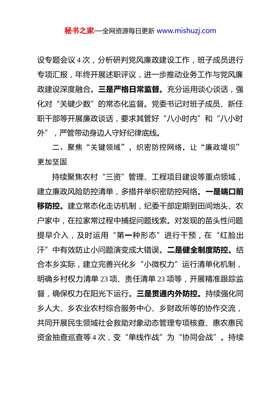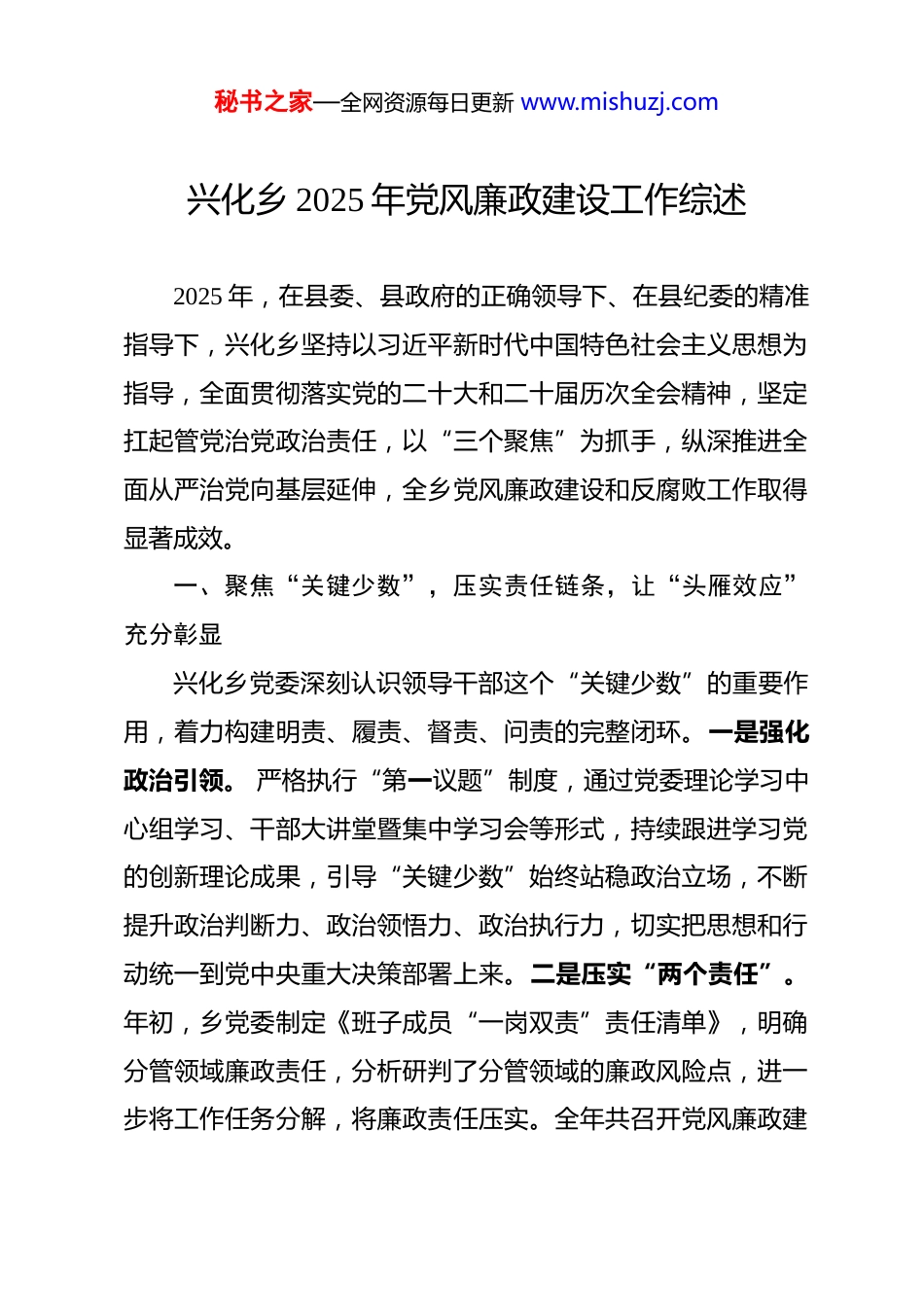 秘书之家—全网资源每日更新 www.mishuzj.com兴化乡 2025 年党风廉政建设工作综述2025 年,在县委、县政府的正确领导下、在县纪委的精准指导下,兴化乡坚持以习近平新时代中国特色社会主义思想为指导,全面贯彻落实党的二十大和二十届历次全会精神,坚定扛起管党治党政治责任,以“三个聚焦”为抓手,纵深推进全面从严治党向基层延伸,全乡党风廉政建设和反腐败工作取得显著成效。一、聚焦“关键少数”,压实责任链条,让“头雁效应”充分彰显兴化乡党委深刻认识领导干部这个“关键少数”的重要作用,着力构建明责、履责、督责、问责的完整闭环。一是强化政治引领。 严格执行“第一议题”制度,通过党委理论学习中心组学习、干部大讲堂暨集中学习会等形式,持续跟进学习党的创新理论成果,引导“关键少数”始终站稳政治立场,不断提升政治判断力、政治领悟力、政治执行力,切实把思想和行动统一到党中央重大决策部署上来。二是压实“两个责任”。年初,乡党委制定《班子成员“一岗双责”责任清单》,明确分管领域廉政责任,分析研判了分管领域的廉政风险点,进一步将工作任务分解,将廉政责任压实。全年共召开党风廉政建秘书之家—全网资源每日更新 www.mishuzj.com设专题会议 4 次,分析研判党风廉政建设工作,班子成员进行专项汇报,年终开展述职评议,进一步推动业务工作与党风廉政建设深度融合。三是严格日常监督。充分运用谈心谈话,强化对“关键少数”的常态化监督。党委书记对班子成员、新任职干部等开展廉政谈话,要求其管好“八小时内”和“八小时外”,严管带动身边人守好纪律底线。二、聚焦“关键领域”,织密防控网络,让“廉政堤坝”更加坚固持续聚焦农村“三资”管理、工程项目建设等重点领域,建立廉政风险防控清单,多措并举织密防控网络。一是端口前移防控。建立常态化走访机制,纪委干部定期到田间地头、农户家中,在拉家常过程中捕捉问题线索。对发现的苗头性问题提早介入,及时运用“第一种形态”进行干预,在“红脸出汗”中有效防止小问题演变成大错误。二是健全制度防控。结合本乡实际,建立完善兴化乡“小微权力”运行清单化机制,明确乡村权力清单 23 项、责任清单 23 项等,开展精准跟踪监督,确保权力在阳光下运行。三是贯通内外防控。持续强化同乡人大、乡农业农村综合服务中心、乡财政所等的协作交流,共同开展民生领域社会救助对象动态管理专项核查、惠农惠民资金抽查巡查等 4 次,变“单线作战”为“协同会战”。持续秘书之家—全网资源每日更新 www.mishuzj.com强化对村务监督委员会业务培训和指导,在护林防火、汛期防汛等重要时期,通过实战化监督演练提升发现问题和监督纠偏能力,激活“末梢神经”成为监督“前哨”,形成乡、村两级监督合力。三、聚焦“关键环节”,实施精准监督,让“权力链条”规范运行紧盯权力运行过程中的决策、执行、公开等核心环节,推动监督关口前移。一是深化公开环节。持续开展村监委会主任业务培训工作,开展集中培训 2 次,乡纪委书记实地检查 12 次,推动提升监督能力。持续开展村务公开,对村级重大事项决策、大额资金使用等,严格落实“四议两公开”制度,切实推动决策公开、执行公开,充分保障群众知情权、参与权、监督权。二是保持执行刚性。围绕乡村振兴重点项目等落实情况,开展嵌入式、跟踪式监督。围绕重大民生项目执行落地,深入开展群众身边不正之风和腐败问题专项督查,不定期开展现场核查、走访群众等,形成“违法必被究”的高压态势,让执纪刚性为生态“清淤”。三是运用文化育人。在查办案件的同时,兴化乡纪委对案件进行深入剖析,针对违纪违法问题开展“专题化”警示教育 2 次,让监督的“力度”与“温度”并存,用柔性教育为生态“滋养”。深入推动廉洁文化建设,紧密结合村秘书之家—全网资源每日更新 www.mishuzj.com规民约等,挖掘和添加廉洁家风家训、清廉乡贤文化等,营造崇廉尚洁的浓厚氛围,使廉洁理念内化于心、外化于行。下一步,兴化乡党委将坚持严的基调、严的措施、严的氛围不动摇,以更高标准、更实作风,持续推进全面从严治党向纵深发展,奋力谱写兴化乡风清气正、干事创业的新篇章,为全乡高质量发展保驾护航。
