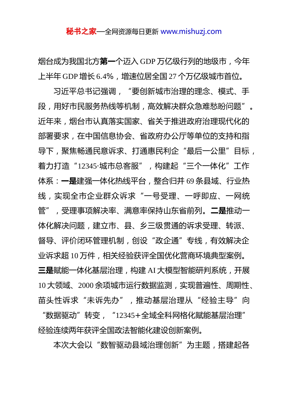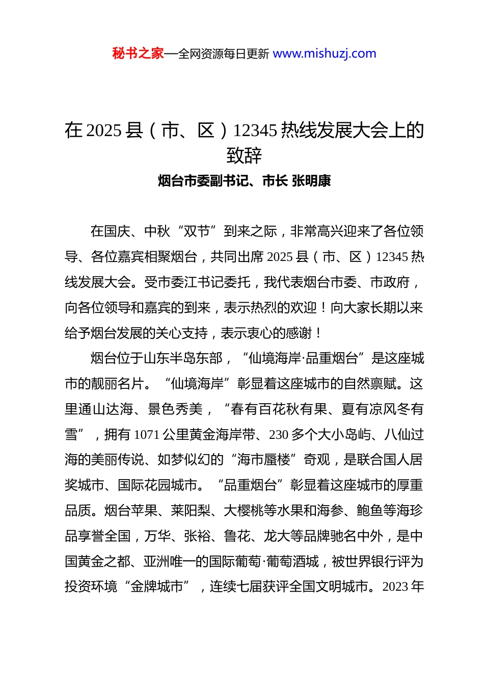 秘书之家—全网资源每日更新 www.mishuzj.com在 2025 县(市、区)12345 热线发展大会上的致辞烟台市委副书记、市长 张明康在国庆、中秋“双节”到来之际,非常高兴迎来了各位领导、各位嘉宾相聚烟台,共同出席 2025 县(市、区)12345 热线发展大会。受市委江书记委托,我代表烟台市委、市政府,向各位领导和嘉宾的到来,表示热烈的欢迎!向大家长期以来给予烟台发展的关心支持,表示衷心的感谢!烟台位于山东半岛东部,“仙境海岸·品重烟台”是这座城市的靓丽名片。“仙境海岸”彰显着这座城市的自然禀赋。这里通山达海、景色秀美,“春有百花秋有果、夏有凉风冬有雪”,拥有 1071 公里黄金海岸带、230 多个大小岛屿、八仙过海的美丽传说、如梦似幻的“海市蜃楼”奇观,是联合国人居奖城市、国际花园城市。“品重烟台”彰显着这座城市的厚重品质。烟台苹果、莱阳梨、大樱桃等水果和海参、鲍鱼等海珍品享誉全国,万华、张裕、鲁花、龙大等品牌驰名中外,是中国黄金之都、亚洲唯一的国际葡萄·葡萄酒城,被世界银行评为投资环境“金牌城市”,连续七届获评全国文明城市。2023 年秘书之家—全网资源每日更新 www.mishuzj.com烟台成为我国北方第一个迈入 GDP 万亿级行列的地级市,今年上半年 GDP 增长 6.4%,增速位居全国 27 个万亿级城市首位。习近平总书记强调,“要创新城市治理的理念、模式、手段,用好市民服务热线等机制,高效解决群众急难愁盼问题”。近年来,烟台市认真落实国家、省关于推进政府治理现代化的部署要求,在中国信息协会、省政府办公厅等单位的支持和指导下,聚焦畅通民意诉求、打通惠民利企“最后一公里”目标,着力打造“12345·城市总客服”,构建起“三个一体化”工作体系:一是建强一体化热线平台,整合归并 69 条县域、行业热线,实现全市企业群众诉求“一号受理、一呼即应、一网统管”,受理事项解决率、满意率保持山东省前列。二是推动一体化解决问题,建立市、县、乡三级贯通的诉求受理、转派、督导、评价闭环管理机制,创设“政企通”专线,有效解决企业诉求超 10 万件,相关经验获评全国优化营商环境典型案例。三是赋能一体化基层治理,构建 AI 大模型智能研判系统,开展10 大领域、2000 余项城市运行数据监测,实现普遍性、周期性、苗头性诉求“未诉先办”,推动基层治理从“经验主导”向“数据驱动”转变,“12345+全域全科网格化赋能基层治理”经验连续两年获评全国政法智能化建设创新案例。本次大会以“数智驱动县域治理创新”为主题,搭建起各秘书之家—全网资源每日更新 www.mishuzj.com方展示政务热线创新思路、实践成果的高层级交流平台,烟台市将认真学习借鉴先进经验做法,围绕落实“高效办成一件事”,不断创新工作方法、提升服务效能、加强数智建设,持续完善政务热线工作机制,为推动基层治理体系和治理能力现代化提供有力支撑。诚挚欢迎各位领导、各位嘉宾在烟台期间多走走、多看看,对烟台工作多提宝贵意见,我们一定全力做好服务保障。