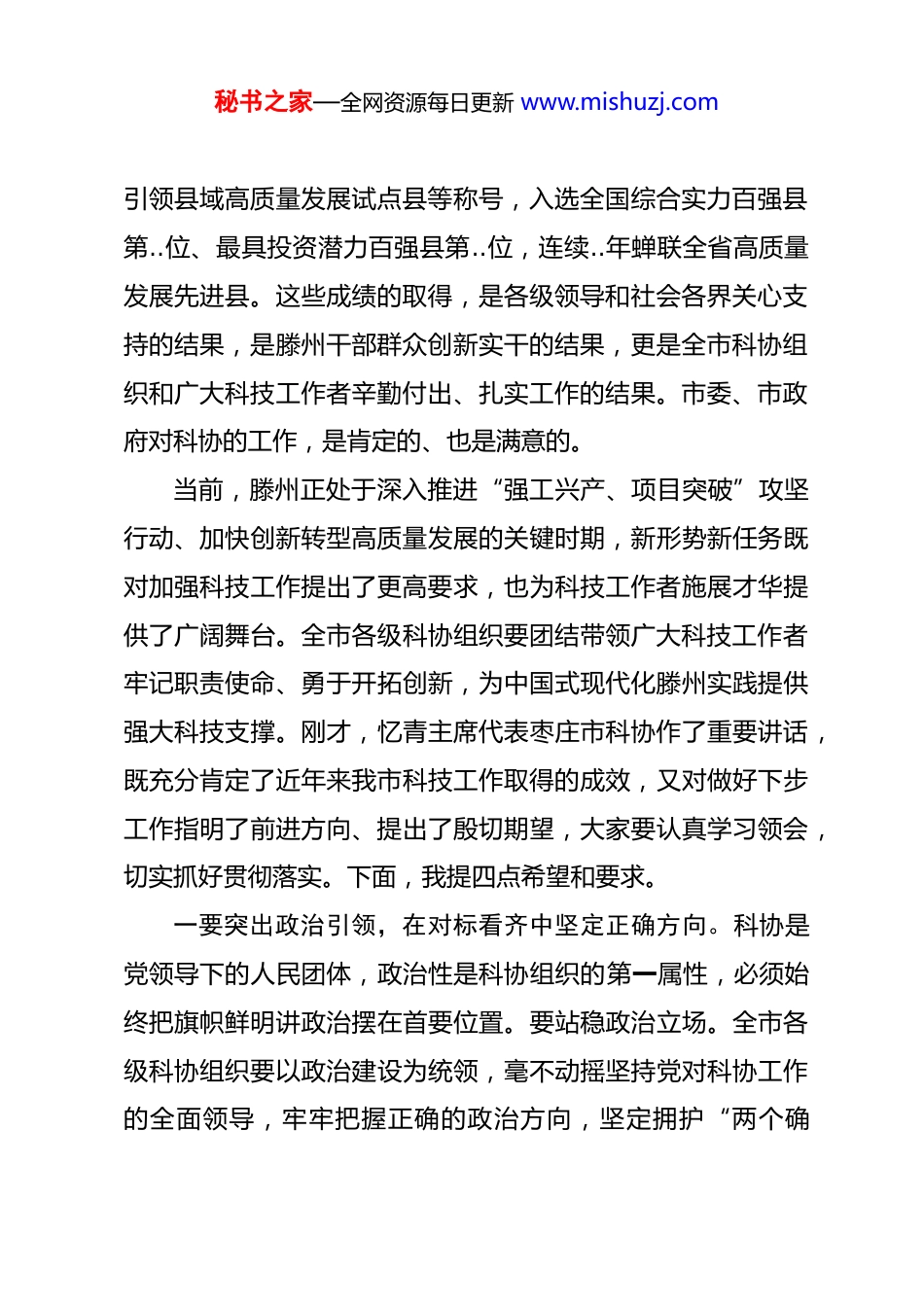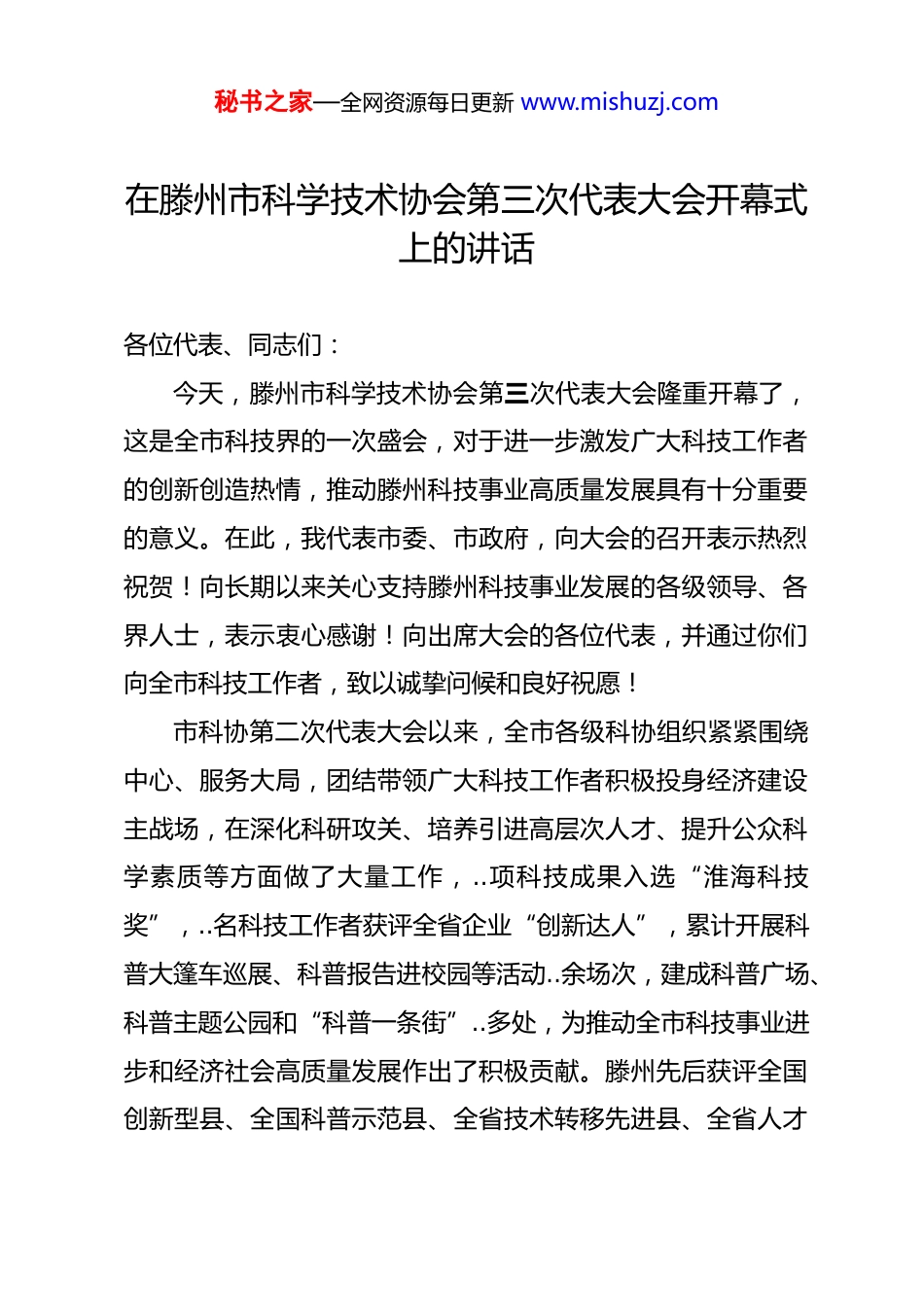 秘书之家—全网资源每日更新 www.mishuzj.com在滕州市科学技术协会第三次代表大会开幕式上的讲话各位代表、同志们:今天,滕州市科学技术协会第三次代表大会隆重开幕了,这是全市科技界的一次盛会,对于进一步激发广大科技工作者的创新创造热情,推动滕州科技事业高质量发展具有十分重要的意义。在此,我代表市委、市政府,向大会的召开表示热烈祝贺!向长期以来关心支持滕州科技事业发展的各级领导、各界人士,表示衷心感谢!向出席大会的各位代表,并通过你们向全市科技工作者,致以诚挚问候和良好祝愿!市科协第二次代表大会以来,全市各级科协组织紧紧围绕中心、服务大局,团结带领广大科技工作者积极投身经济建设主战场,在深化科研攻关、培养引进高层次人才、提升公众科学素质等方面做了大量工作,..项科技成果入选“淮海科技奖”,..名科技工作者获评全省企业“创新达人”,累计开展科普大篷车巡展、科普报告进校园等活动..余场次,建成科普广场、科普主题公园和“科普一条街”..多处,为推动全市科技事业进步和经济社会高质量发展作出了积极贡献。滕州先后获评全国创新型县、全国科普示范县、全省技术转移先进县、全省人才秘书之家—全网资源每日更新 www.mishuzj.com引领县域高质量发展试点县等称号,入选全国综合实力百强县第..位、最具投资潜力百强县第..位,连续..年蝉联全省高质量发展先进县。这些成绩的取得,是各级领导和社会各界关心支持的结果,是滕州干部群众创新实干的结果,更是全市科协组织和广大科技工作者辛勤付出、扎实工作的结果。市委、市政府对科协的工作,是肯定的、也是满意的。当前,滕州正处于深入推进“强工兴产、项目突破”攻坚行动、加快创新转型高质量发展的关键时期,新形势新任务既对加强科技工作提出了更高要求,也为科技工作者施展才华提供了广阔舞台。全市各级科协组织要团结带领广大科技工作者牢记职责使命、勇于开拓创新,为中国式现代化滕州实践提供强大科技支撑。刚才,忆青主席代表枣庄市科协作了重要讲话,既充分肯定了近年来我市科技工作取得的成效,又对做好下步工作指明了前进方向、提出了殷切期望,大家要认真学习领会,切实抓好贯彻落实。下面,我提四点希望和要求。一要突出政治引领,在对标看齐中坚定正确方向。科协是党领导下的人民团体,政治性是科协组织的第一属性,必须始终把旗帜鲜明讲政治摆在首要位置。要站稳政治立场。全市各级科协组织要以政治建设为统领,毫不动摇坚持党对科协工作的全面领导,牢牢把握正确的政治方向,坚定拥护“两个确秘书之家—全网资源每日更新 www.mishuzj.com立”、坚决做到“两个维护”,始终在思想上政治上行动上同以习近平同志为核心的党中央保持高度一致。要强化理论武装。持续学深悟透习近平总书记关于科技创新的重要论述和对科协工作的重要指示精神,充分发挥“善城科普大讲堂”“老专家滕州行”等平台作用,真正用党的创新理论武装头脑、指导实践、推动工作。要厚植家国情怀。始终胸怀“国之大者”,大力弘扬服务祖国、服务人民的爱国精神,引导广大科技工作者自觉把人生理想融入科技强市的生动实践,为加快实现科技自立自强贡献更大智慧和力量。二要强化科技赋能,在服务大局中扛牢责任担当。习近平总书记强调,科技是第一生产力、人才是第一资源、创新是第一动力。各级科协组织要引导广大科技工作者大力弘扬墨子科创精神,深入实施创新驱动发展战略,真正让科技创新的“关键变量”成为滕州高质量发展的“最大增量”。要在创新转型上挑重担。聚焦我市“化机锂医数”五大主导产业,深入研究产业发展中的突出问题和薄弱环节,持续加强与高校院所的产学研合作,发挥好山大滕州产业研究院、华数智能制造研究院、北航机床创新研究院等平台载体作用,不断攻克产业发展中的“卡脖子”技术,全面加快科研成果从样品到产品再到商品的转化,真正用新质生产力“提质扩能、转型增效”。要在技术秘书之家—全网资源每日更新 www.mishuzj.com攻关上当先锋。当前,我市正在大力实施扩大规模、设备更新和科技创新“一扩两新”行动,每年将筛选..个以上原创性项目和..多个技改项目重点支持。广大...