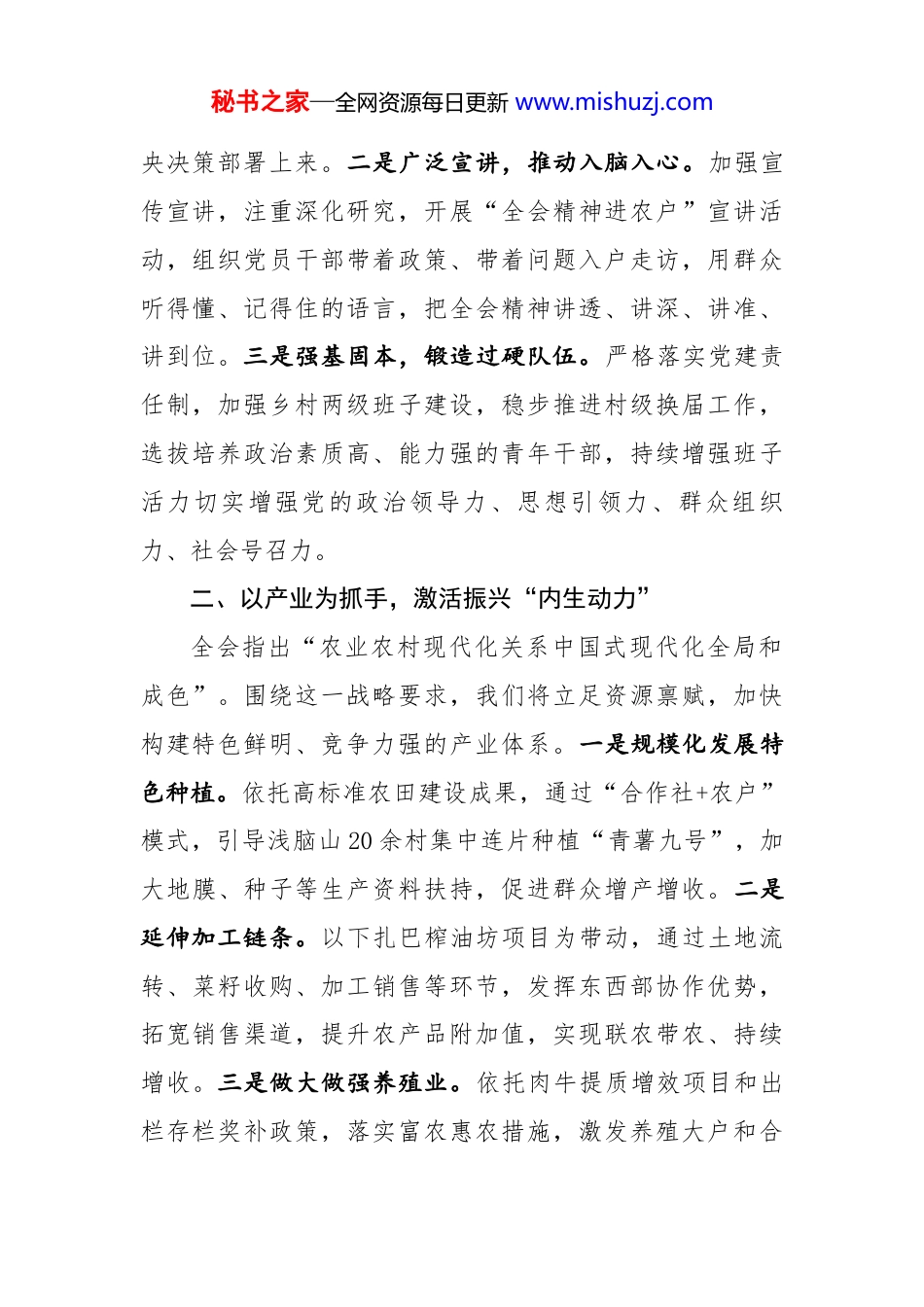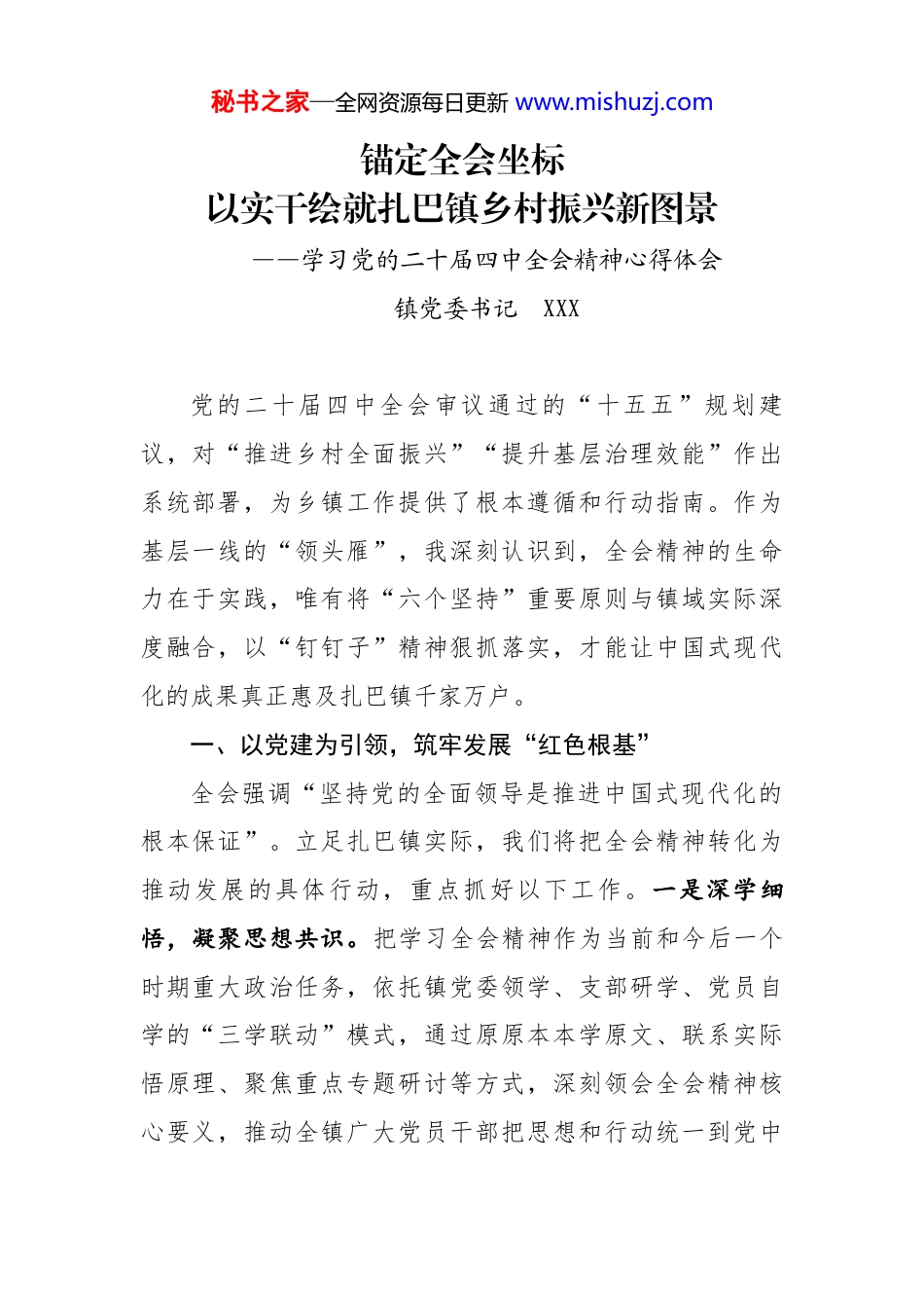 秘书之家—全网资源每日更新 www.mishuzj.com锚定全会坐标以实干绘就扎巴镇乡村振兴新图景——学习党的二十届四中全会精神心得体会镇党委书记 XXX党的二十届四中全会审议通过的“十五五”规划建议,对“推进乡村全面振兴”“提升基层治理效能”作出系统部署,为乡镇工作提供了根本遵循和行动指南。作为基层一线的“领头雁”,我深刻认识到,全会精神的生命力在于实践,唯有将“六个坚持”重要原则与镇域实际深度融合,以“钉钉子”精神狠抓落实,才能让中国式现代化的成果真正惠及扎巴镇千家万户。一、以党建为引领,筑牢发展“红色根基”全会强调“坚持党的全面领导是推进中国式现代化的根本保证”。立足扎巴镇实际,我们将把全会精神转化为推动发展的具体行动,重点抓好以下工作。一是深学细悟,凝聚思想共识。把学习全会精神作为当前和今后一个时期重大政治任务,依托镇党委领学、支部研学、党员自学的“三学联动”模式,通过原原本本学原文、联系实际悟原理、聚焦重点专题研讨等方式,深刻领会全会精神核心要义,推动全镇广大党员干部把思想和行动统一到党中秘书之家—全网资源每日更新 www.mishuzj.com央决策部署上来。二是广泛宣讲,推动入脑入心。加强宣传宣讲,注重深化研究,开展“全会精神进农户”宣讲活动,组织党员干部带着政策、带着问题入户走访,用群众听得懂、记得住的语言,把全会精神讲透、讲深、讲准、讲到位。三是强基固本,锻造过硬队伍。严格落实党建责任制,加强乡村两级班子建设,稳步推进村级换届工作,选拔培养政治素质高、能力强的青年干部,持续增强班子活力切实增强党的政治领导力、思想引领力、群众组织力、社会号召力。二、以产业为抓手,激活振兴“内生动力”全会指出“农业农村现代化关系中国式现代化全局和成色”。围绕这一战略要求,我们将立足资源禀赋,加快构建特色鲜明、竞争力强的产业体系。一是规模化发展特色种植。依托高标准农田建设成果,通过“合作社+农户”模式,引导浅脑山 20 余村集中连片种植“青薯九号”,加大地膜、种子等生产资料扶持,促进群众增产增收。二是延伸加工链条。以下扎巴榨油坊项目为带动,通过土地流转、菜籽收购、加工销售等环节,发挥东西部协作优势,拓宽销售渠道,提升农产品附加值,实现联农带农、持续增收。三是做大做强养殖业。依托肉牛提质增效项目和出栏存栏奖补政策,落实富农惠农措施,激发养殖大户和合秘书之家—全网资源每日更新 www.mishuzj.com作社积极性,扩大养殖规模,稳步提高出栏率和存栏率,增强帮扶实效。四是落实衔接政策。精准识别监测户,分类施策,落实到户产业帮扶措施,支持农户发展养殖、运输等产业,带动就业,拓宽收入来源。三、以民生为根本,擦亮幸福“民生底色”全会强调“实现人民对美好生活的向往是中国式现代化的出发点和落脚点”。聚焦群众关切,我们将从改善生活条件、提升公共服务水平入手,办好一批民生实事:一是完善基础设施。加快推进农村道路硬化、安全饮水提质、电网升级改造等工程,补齐发展短板,夯实乡村振兴基础。二是提升公共服务。深化与优质教育、医疗资源的合作,推动乡镇学校“强校提质”、卫生院“能力提升”,完善居家养老服务体系,让群众在家门口享受优质服务。三是办好群众实事。作为党委书记,我将带头践行“一线工作法”,建立“民情台账”,入户走访、接待来访群众,倾听诉求、解决难题。对就业、社保、住房等问题实行“清单式管理、销号制落实”,确保“事事有回应、件件有着落”。四、以纪律为底线,锻造过硬“干部队伍”全会要求“以党的政治建设统领新时代党的建设新的伟大工程”。贯彻这一要求,我们将以严的基调、实的作秘书之家—全网资源每日更新 www.mishuzj.com风,全面加强干部队伍建设。一是强化纪律教育。结合“三会一课”组织党员干部学习党章党规和典型案例,参观廉政教育基地,开展“廉政谈话”全覆盖,筑牢思想防线。二是健全监督机制。成立镇纪委专项督查组,对乡村振兴项目资金、惠民政策落实等重点领域开展常态化检查。三是优化考核激励。推行干部作风“月评季考”制度,把群众满意度、工作落实成效与绩效考核、评优...