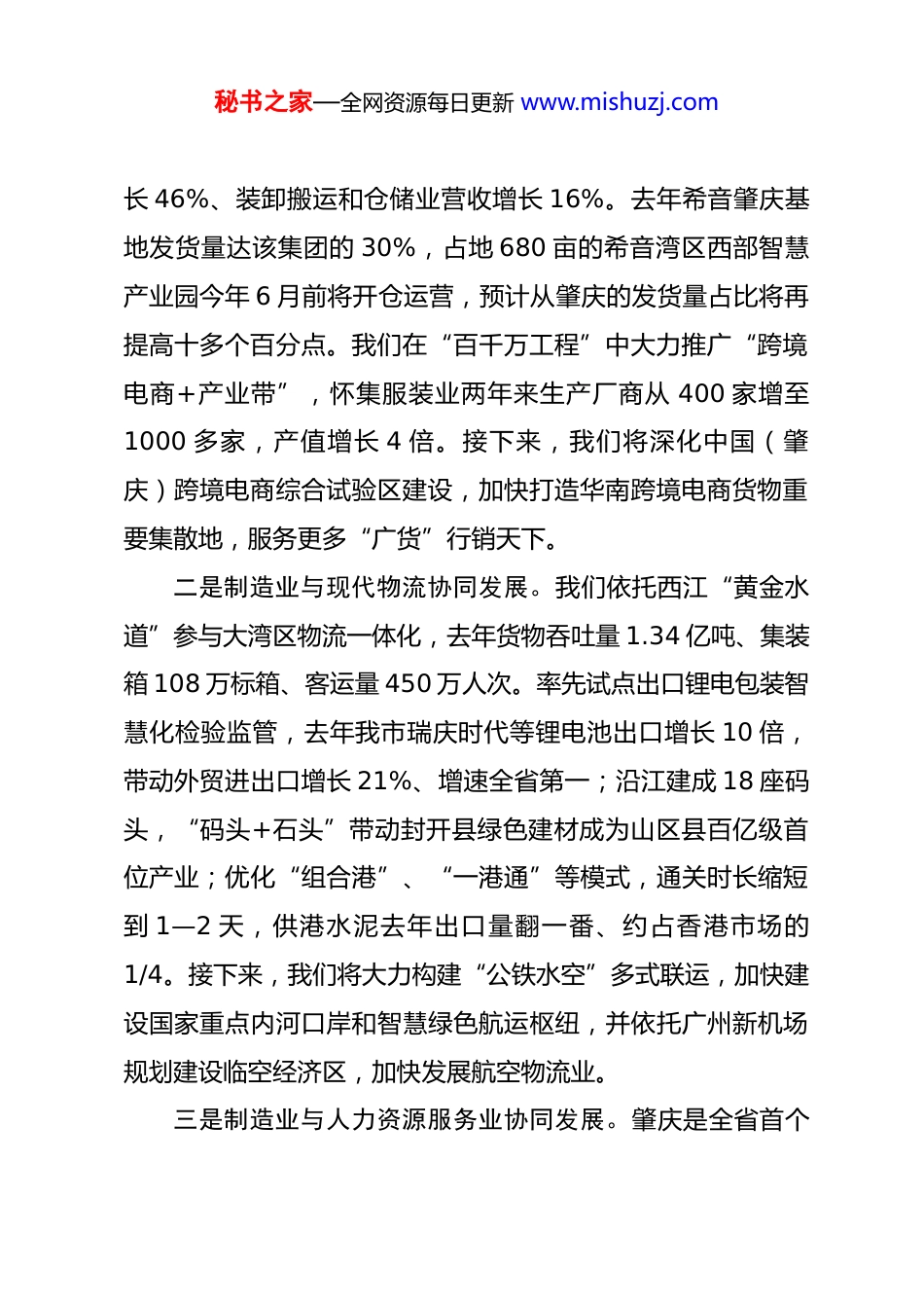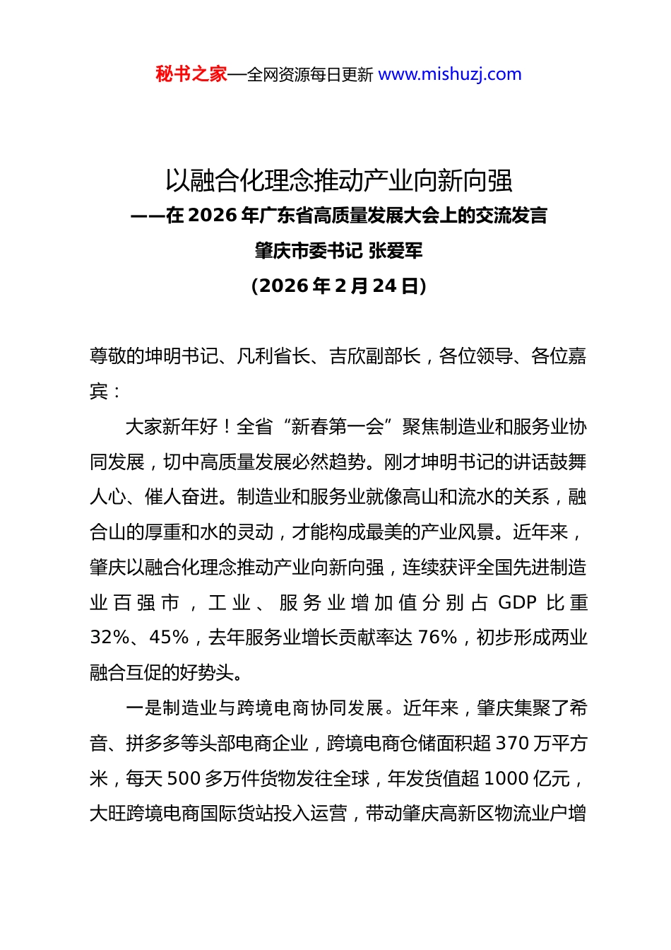 秘书之家—全网资源每日更新 www.mishuzj.com以融合化理念推动产业向新向强——在 2026 年广东省高质量发展大会上的交流发言肇庆市委书记 张爱军(2026 年 2 月 24 日)尊敬的坤明书记、凡利省长、吉欣副部长,各位领导、各位嘉宾:大家新年好!全省“新春第一会”聚焦制造业和服务业协同发展,切中高质量发展必然趋势。刚才坤明书记的讲话鼓舞人心、催人奋进。制造业和服务业就像高山和流水的关系,融合山的厚重和水的灵动,才能构成最美的产业风景。近年来,肇庆以融合化理念推动产业向新向强,连续获评全国先进制造业 百 强 市 , 工 业 、 服 务 业 增 加 值 分 别 占 GDP 比 重32%、45%,去年服务业增长贡献率达 76%,初步形成两业融合互促的好势头。一是制造业与跨境电商协同发展。近年来,肇庆集聚了希音、拼多多等头部电商企业,跨境电商仓储面积超 370 万平方米,每天 500 多万件货物发往全球,年发货值超 1000 亿元,大旺跨境电商国际货站投入运营,带动肇庆高新区物流业户增秘书之家—全网资源每日更新 www.mishuzj.com长 46%、装卸搬运和仓储业营收增长 16%。去年希音肇庆基地发货量达该集团的 30%,占地 680 亩的希音湾区西部智慧产业园今年 6 月前将开仓运营,预计从肇庆的发货量占比将再提高十多个百分点。我们在“百千万工程”中大力推广“跨境电商+产业带”,怀集服装业两年来生产厂商从 400 家增至1000 多家,产值增长 4 倍。接下来,我们将深化中国(肇庆)跨境电商综合试验区建设,加快打造华南跨境电商货物重要集散地,服务更多“广货”行销天下。二是制造业与现代物流协同发展。我们依托西江“黄金水道”参与大湾区物流一体化,去年货物吞吐量 1.34 亿吨、集装箱 108 万标箱、客运量 450 万人次。率先试点出口锂电包装智慧化检验监管,去年我市瑞庆时代等锂电池出口增长 10 倍,带动外贸进出口增长 21%、增速全省第一;沿江建成 18 座码头,“码头+石头”带动封开县绿色建材成为山区县百亿级首位产业;优化“组合港”、“一港通”等模式,通关时长缩短到 1—2 天,供港水泥去年出口量翻一番、约占香港市场的1/4。接下来,我们将大力构建“公铁水空”多式联运,加快建设国家重点内河口岸和智慧绿色航运枢纽,并依托广州新机场规划建设临空经济区,加快发展航空物流业。三是制造业与人力资源服务业协同发展。肇庆是全省首个秘书之家—全网资源每日更新 www.mishuzj.com职业教育基地,现有高校 11 所、中职院校 22 所,在校生26.7 万人,每年毕业生超 7 万人,“宁德时代班”、“小鹏汽车班”等培养模式广受好评。肇庆高新区人力资源服务产业园成立两年多产值达 10 亿元,带动全区集聚服务机构 115 家,累计服务就业超 23 万人次,“零工市场”就业模式在全国推广。接下来,我们将继续拓展产教集聚优势,打造一批特色人力资源产业园,深入落实“百万英才汇南粤”行动计划,为大湾区培养输送更多产业人才。同时,我市大力推动制造业与金融、科技、数字经济等服务业以及服务型制造协同发展。去年全市金融机构贷款余额增速居全省第三、制造业贷款余额增速居全省第七,知识产权质押融资额居全省第八。依托龙头企业成立工业园区数智平台,设立广州数据交易所(肇庆)服务基地。我市的轮滑、滑板等体育用品制造企业积极举办国家级赛事、配套建设训练基地,初步形成“制造+服务”和“产赛训”的良性循环。肇庆制造业和服务业协同发展初有起势、潜力巨大。我们将认真落实这次会议精神,在制造业集聚平台中配套若干个生产性服务业集聚区,充分运用数字化赋能,以更大力度推动两业协同发展,不断催生新质生产力。谢谢大家。