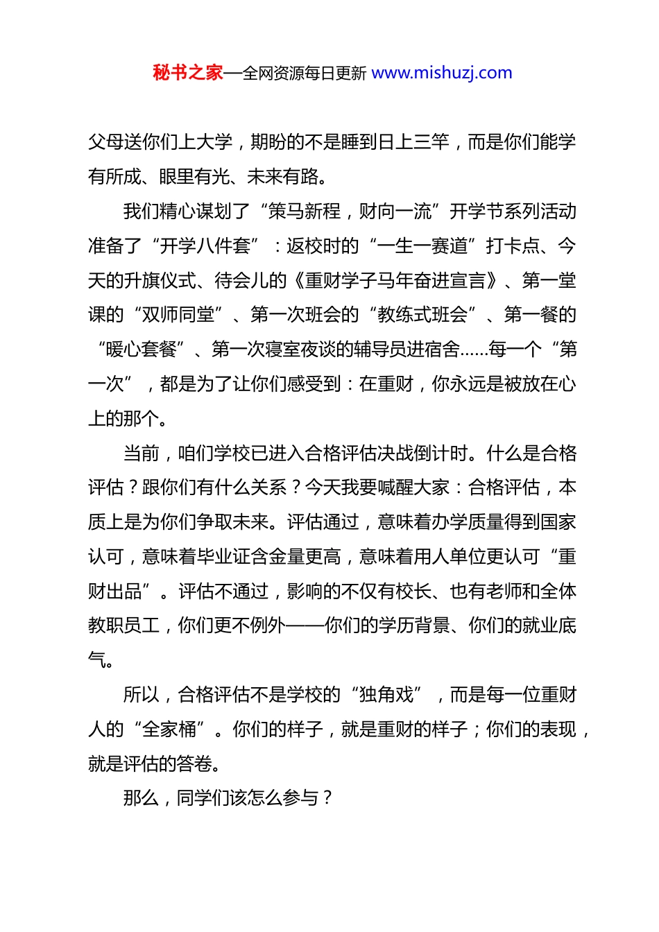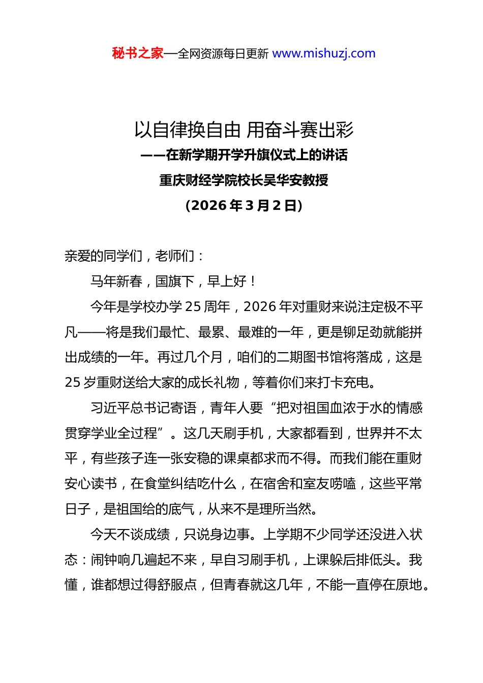 秘书之家—全网资源每日更新 www.mishuzj.com以自律换自由 用奋斗赛出彩——在新学期开学升旗仪式上的讲话重庆财经学院校长吴华安教授(2026 年 3 月 2 日)亲爱的同学们,老师们:马年新春,国旗下,早上好!今年是学校办学 25 周年,2026 年对重财来说注定极不平凡——将是我们最忙、最累、最难的一年,更是铆足劲就能拼出成绩的一年。再过几个月,咱们的二期图书馆将落成,这是25 岁重财送给大家的成长礼物,等着你们来打卡充电。习近平总书记寄语,青年人要“把对祖国血浓于水的情感贯穿学业全过程”。这几天刷手机,大家都看到,世界并不太平,有些孩子连一张安稳的课桌都求而不得。而我们能在重财安心读书,在食堂纠结吃什么,在宿舍和室友唠嗑,这些平常日子,是祖国给的底气,从来不是理所当然。今天不谈成绩,只说身边事。上学期不少同学还没进入状态:闹钟响几遍起不来,早自习刷手机,上课躲后排低头。我懂,谁都想过得舒服点,但青春就这几年,不能一直停在原地。秘书之家—全网资源每日更新 www.mishuzj.com父母送你们上大学,期盼的不是睡到日上三竿,而是你们能学有所成、眼里有光、未来有路。我们精心谋划了“策马新程,财向一流”开学节系列活动准备了“开学八件套”:返校时的“一生一赛道”打卡点、今天的升旗仪式、待会儿的《重财学子马年奋进宣言》、第一堂课的“双师同堂”、第一次班会的“教练式班会”、第一餐的“暖心套餐”、第一次寝室夜谈的辅导员进宿舍……每一个“第一次”,都是为了让你们感受到:在重财,你永远是被放在心上的那个。当前,咱们学校已进入合格评估决战倒计时。什么是合格评估?跟你们有什么关系?今天我要喊醒大家:合格评估,本质上是为你们争取未来。评估通过,意味着办学质量得到国家认可,意味着毕业证含金量更高,意味着用人单位更认可“重财出品”。评估不通过,影响的不仅有校长、也有老师和全体教职员工,你们更不例外——你们的学历背景、你们的就业底气。所以,合格评估不是学校的“独角戏”,而是每一位重财人的“全家桶”。你们的样子,就是重财的样子;你们的表现,就是评估的答卷。那么,同学们该怎么参与?秘书之家—全网资源每日更新 www.mishuzj.com2026 年,学校将把考研升学、考公考公、考证就业、创新创业四大赛道全搭好。开学一周内,请把自己的主赛道定下来,写一张成长清单,每周花五分钟复盘。方向对了,走一步,就离出彩近一步。同学们,让我们一起做好三件事,为重财 25 岁生日献礼:一是从晨修开始,管好自己的时间。这个学期全面推行“晨修计划”。专家进校,第一件事就是看你们——是睡眼惺忪踩着点进教室,还是精神饱满在学习?咱们就按“晨修三个一”来:早起一刻钟、晨读一篇文、晨练十分钟。月底出晨修打卡榜,不评虚的,就看谁是实干的重财人。晨修不是任务,是给自己未来的投资。二是从课堂做起,管好自己的手机。专家随堂听课,不单看教师、教案、教风,更看你们的抬头率、互动率、专注度。从今天起:上课手机入袋、入包、不入眼;前排就坐,别总往后躲;积极回应老师,别当“沉默的大多数”。尊重课堂,就是尊重自己的学业。三是从日常细节入手,管好自己的样子。专家会在校园随机走访,会在食堂、宿舍观察你们——有没有穿睡衣拖鞋逛校园?有没有带早餐进教室?有没有晚归不报告?请做到:不带早餐进教室,不穿睡衣拖鞋出宿舍;晚归要报告,垃圾要带下;秘书之家—全网资源每日更新 www.mishuzj.com见到老师、专家主动问好。你的每一个文明举止,都是评估最硬的底气。同学们,合格评估不是要我过,而是我们要过。不是给学校贴金,是给你们自己铺路。2026 年的难,咱们一起扛;这一年的荣光,咱们一起挣。你们的每一次早起、每一次晨修、每一堂认真的课,都是在成就自己,也是在为重财添彩。从今天起,让我们以晨修启新程,以自律赴韶华,在属于自己的赛道上奋力奔跑。让父母为你们骄傲,让学校因你们荣光,让祖国因你们更富强!让 2026 成为我们共同的出彩之年!最后说句暖心话:希望大家在重财,早起见朝阳,晚归收成长,食堂吃得香,寝室睡得安,图书馆找方向,操场上...