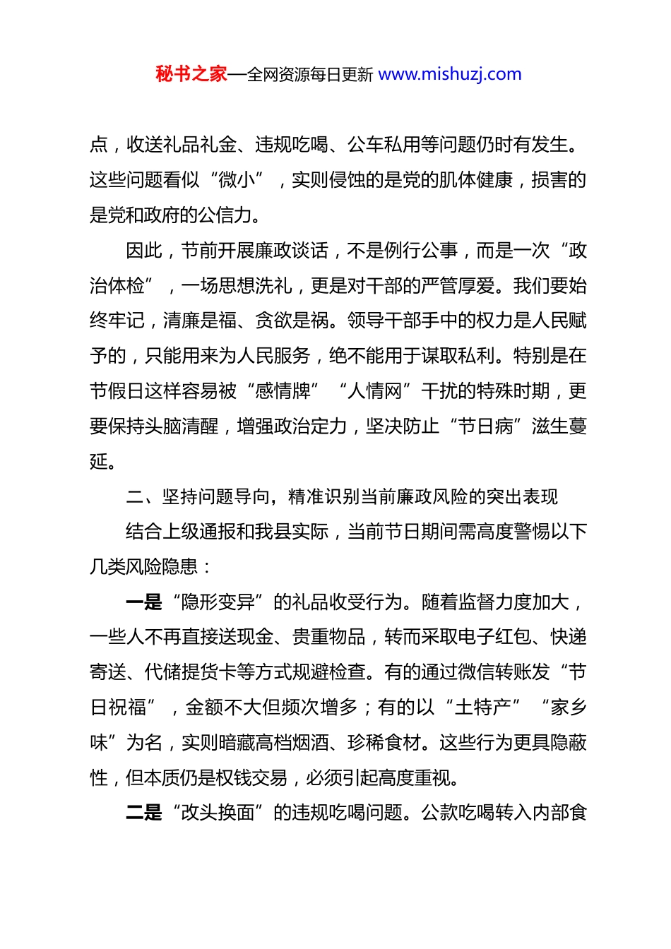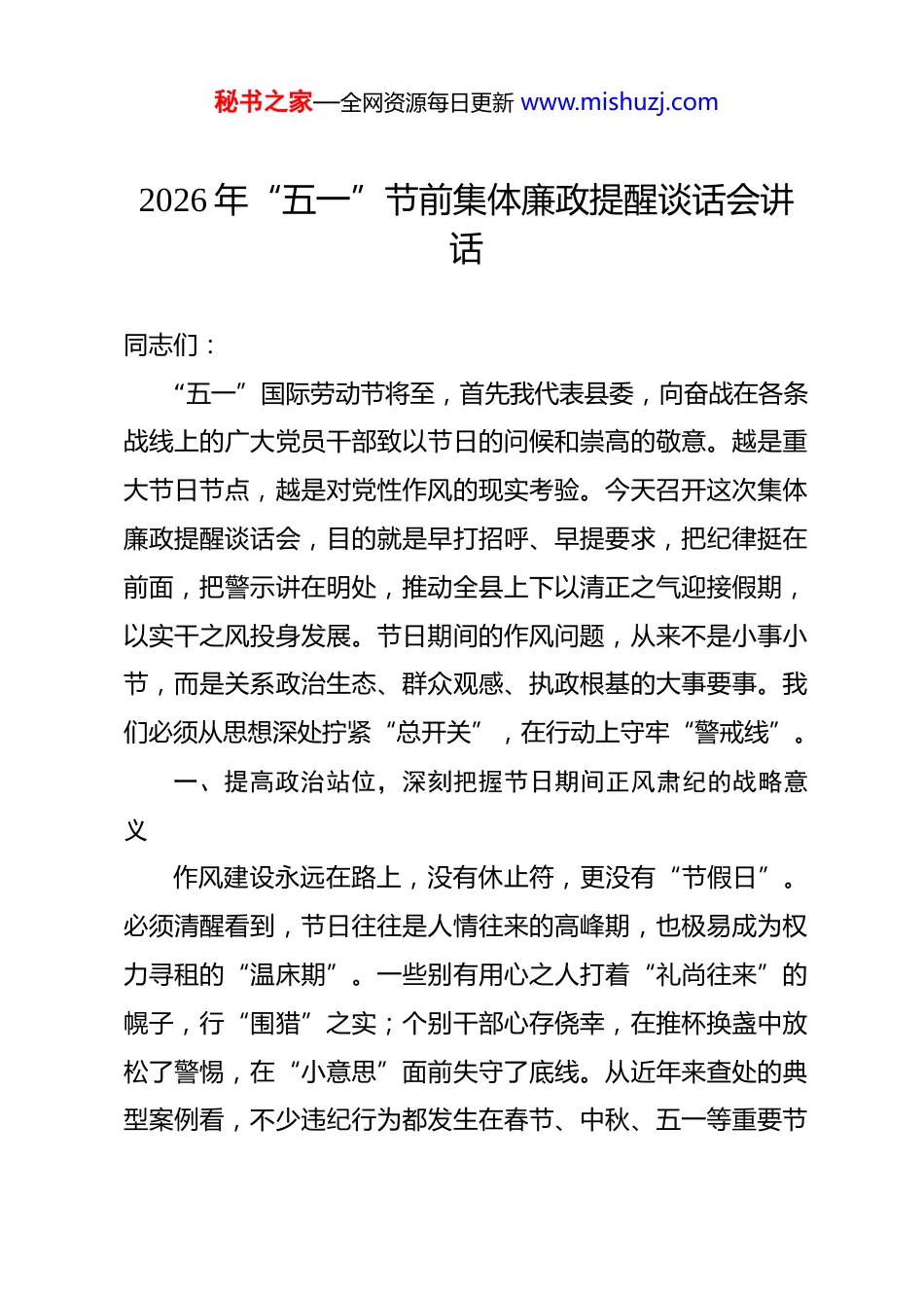 秘书之家—全网资源每日更新 www.mishuzj.com2026 年“五一”节前集体廉政提醒谈话会讲话 同志们:“五一”国际劳动节将至,首先我代表县委,向奋战在各条战线上的广大党员干部致以节日的问候和崇高的敬意。越是重大节日节点,越是对党性作风的现实考验。今天召开这次集体廉政提醒谈话会,目的就是早打招呼、早提要求,把纪律挺在前面,把警示讲在明处,推动全县上下以清正之气迎接假期,以实干之风投身发展。节日期间的作风问题,从来不是小事小节,而是关系政治生态、群众观感、执政根基的大事要事。我们必须从思想深处拧紧“总开关”,在行动上守牢“警戒线”。一、提高政治站位,深刻把握节日期间正风肃纪的战略意义作风建设永远在路上,没有休止符,更没有“节假日”。必须清醒看到,节日往往是人情往来的高峰期,也极易成为权力寻租的“温床期”。一些别有用心之人打着“礼尚往来”的幌子,行“围猎”之实;个别干部心存侥幸,在推杯换盏中放松了警惕,在“小意思”面前失守了底线。从近年来查处的典型案例看,不少违纪行为都发生在春节、中秋、五一等重要节秘书之家—全网资源每日更新 www.mishuzj.com点,收送礼品礼金、违规吃喝、公车私用等问题仍时有发生。这些问题看似“微小”,实则侵蚀的是党的肌体健康,损害的是党和政府的公信力。因此,节前开展廉政谈话,不是例行公事,而是一次“政治体检”,一场思想洗礼,更是对干部的严管厚爱。我们要始终牢记,清廉是福、贪欲是祸。领导干部手中的权力是人民赋予的,只能用来为人民服务,绝不能用于谋取私利。特别是在节假日这样容易被“感情牌”“人情网”干扰的特殊时期,更要保持头脑清醒,增强政治定力,坚决防止“节日病”滋生蔓延。二、坚持问题导向,精准识别当前廉政风险的突出表现结合上级通报和我县实际,当前节日期间需高度警惕以下几类风险隐患:一是“隐形变异”的礼品收受行为。随着监督力度加大,一些人不再直接送现金、贵重物品,转而采取电子红包、快递寄送、代储提货卡等方式规避检查。有的通过微信转账发“节日祝福”,金额不大但频次增多;有的以“土特产”“家乡味”为名,实则暗藏高档烟酒、珍稀食材。这些行为更具隐蔽性,但本质仍是权钱交易,必须引起高度重视。二是“改头换面”的违规吃喝问题。公款吃喝转入内部食秘书之家—全网资源每日更新 www.mishuzj.com堂、私人会所、农家乐等场所,或由管理服务对象买单,甚至出现“不吃公款吃老板”的现象。有的单位以“工作餐”名义频繁聚餐,变相搞福利消费;有的领导干部接受企业主邀请,出入高档餐饮场所,影响极其恶劣。这类问题不仅违反中央八项规定精神,也严重破坏营商环境。三是“擦边球式”的公车使用乱象。虽然公车改革已深入推进,但仍有个别单位存在“公车私养”“私车公修”等问题。节日期间,有的干部擅自启用封存车辆走亲访友,有的借用下属单位或企业车辆供个人使用,还有的将公务加油卡用于私家车加油。这些行为看似“方便”,实则是典型的特权思想作祟。四是“温水煮青蛙”式的利益输送链条。一些不法商人善于打“持久战”,平时通过节日问候、赠送小礼等方式拉近关系,逐步建立信任,最终达到长期“围猎”目的。这种“滴灌式”腐蚀更具迷惑性,往往等到东窗事发才幡然醒悟,悔之晚矣。上述问题的存在,反映出个别党员干部纪律意识淡薄、制度执行不到位、监督机制仍有盲区。对此,我们必须保持高度警觉,做到抓早抓小、防微杜渐。三、强化责任担当,切实扛起全面从严治党的政治责任各级党组织要切实履行主体责任,把节日期间正风肃纪作秘书之家—全网资源每日更新 www.mishuzj.com为一项重要政治任务来抓。党委(党组)书记要认真履行“第一责任人”职责,既以身作则、以上率下,又敢抓敢管、严抓严管。班子成员要落实“一岗双责”,加强对分管领域党员干部的教育管理和监督提醒,确保压力传导到底、责任落实到位。纪检监察机关要加大监督检查力度,织密监督网络。要聚焦重点领域、重点岗位、重点人群,灵活运用明察暗访、大数据比对、信访举报核查等方式,提升发现问题的能力。对顶风违纪行为,要坚持“零容忍”态度,发现一起...