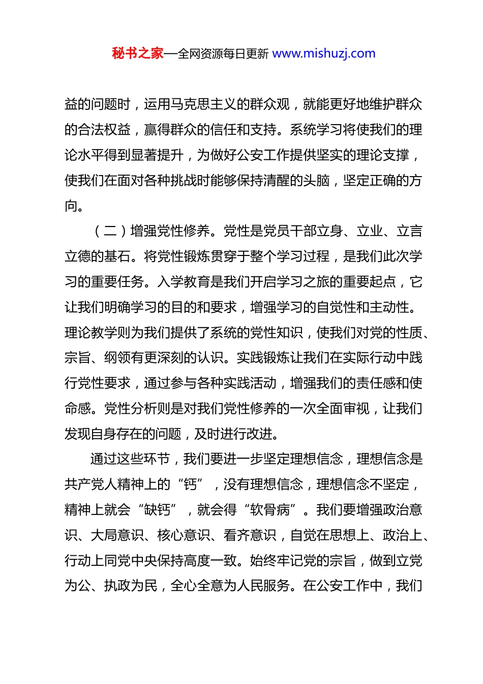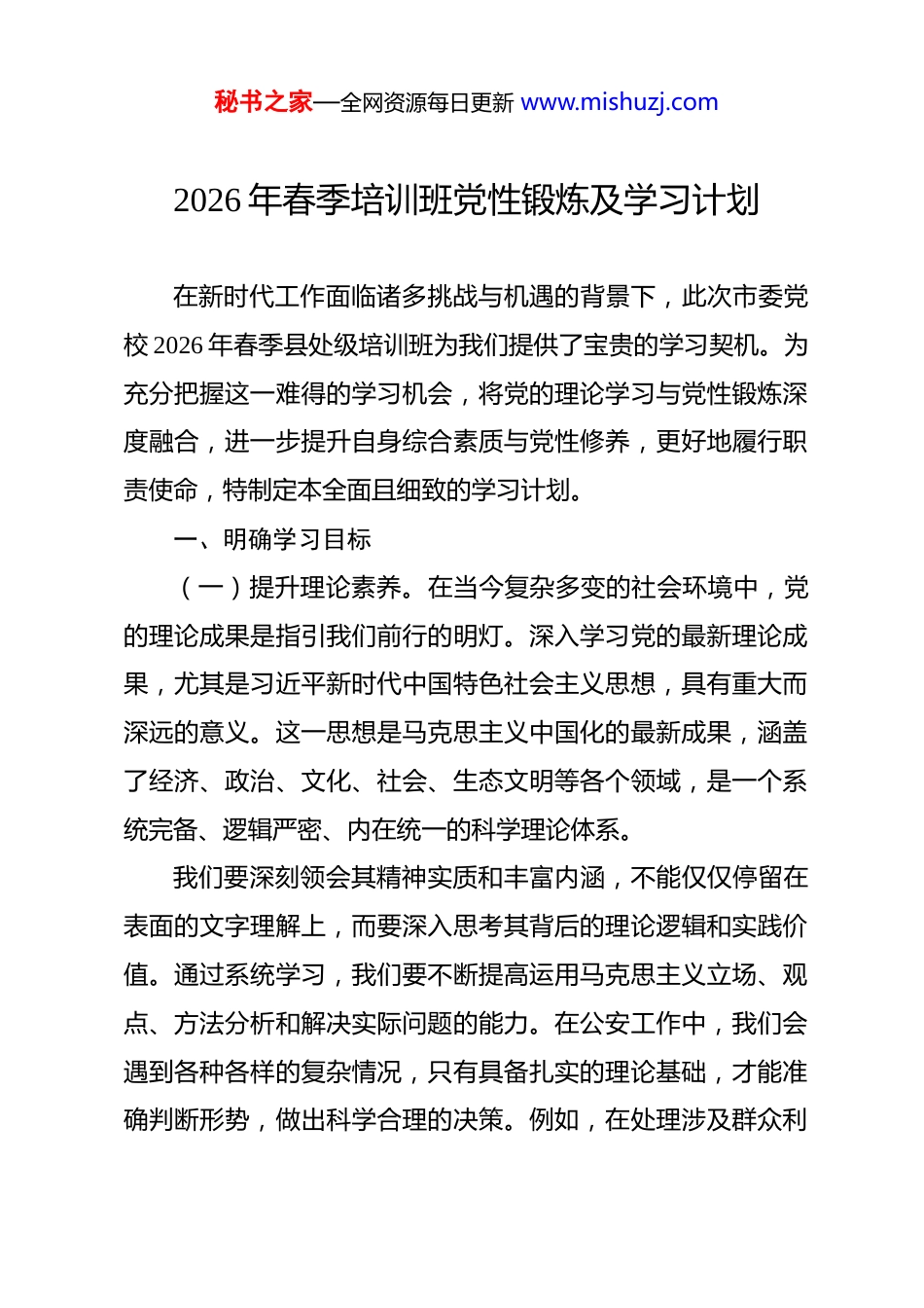 秘书之家—全网资源每日更新 www.mishuzj.com2026 年春季培训班党性锻炼及学习计划 在新时代工作面临诸多挑战与机遇的背景下,此次市委党校 2026 年春季县处级培训班为我们提供了宝贵的学习契机。为充分把握这一难得的学习机会,将党的理论学习与党性锻炼深度融合,进一步提升自身综合素质与党性修养,更好地履行职责使命,特制定本全面且细致的学习计划。一、明确学习目标(一)提升理论素养。在当今复杂多变的社会环境中,党的理论成果是指引我们前行的明灯。深入学习党的最新理论成果,尤其是习近平新时代中国特色社会主义思想,具有重大而深远的意义。这一思想是马克思主义中国化的最新成果,涵盖了经济、政治、文化、社会、生态文明等各个领域,是一个系统完备、逻辑严密、内在统一的科学理论体系。我们要深刻领会其精神实质和丰富内涵,不能仅仅停留在表面的文字理解上,而要深入思考其背后的理论逻辑和实践价值。通过系统学习,我们要不断提高运用马克思主义立场、观点、方法分析和解决实际问题的能力。在公安工作中,我们会遇到各种各样的复杂情况,只有具备扎实的理论基础,才能准确判断形势,做出科学合理的决策。例如,在处理涉及群众利秘书之家—全网资源每日更新 www.mishuzj.com益的问题时,运用马克思主义的群众观,就能更好地维护群众的合法权益,赢得群众的信任和支持。系统学习将使我们的理论水平得到显著提升,为做好公安工作提供坚实的理论支撑,使我们在面对各种挑战时能够保持清醒的头脑,坚定正确的方向。(二)增强党性修养。党性是党员干部立身、立业、立言立德的基石。将党性锻炼贯穿于整个学习过程,是我们此次学习的重要任务。入学教育是我们开启学习之旅的重要起点,它让我们明确学习的目的和要求,增强学习的自觉性和主动性。理论教学则为我们提供了系统的党性知识,使我们对党的性质、宗旨、纲领有更深刻的认识。实践锻炼让我们在实际行动中践行党性要求,通过参与各种实践活动,增强我们的责任感和使命感。党性分析则是对我们党性修养的一次全面审视,让我们发现自身存在的问题,及时进行改进。通过这些环节,我们要进一步坚定理想信念,理想信念是共产党人精神上的“钙”,没有理想信念,理想信念不坚定,精神上就会“缺钙”,就会得“软骨病”。我们要增强政治意识、大局意识、核心意识、看齐意识,自觉在思想上、政治上、行动上同党中央保持高度一致。始终牢记党的宗旨,做到立党为公、执政为民,全心全意为人民服务。在公安工作中,我们秘书之家—全网资源每日更新 www.mishuzj.com要把人民群众的利益放在首位,不断提高服务群众的能力和水平,切实增强人民群众的安全感和满意度。(三)提高业务能力。作为县公安局政委,我们肩负着统筹公安工作、加强队伍建设、维护社会稳定的重要职责。结合我们的职责职能,学习先进的公安管理理念和方法至关重要。随着社会的发展和科技的进步,公安工作面临着新的挑战和机遇,传统的管理模式已经不能适应时代的需求。我们要学习现代管理学、心理学、信息技术等方面的知识,运用科学的管理方法提高工作效率和质量。通过学习,我们要提升领导能力和决策水平。在面对复杂的治安形势和各种突发事件时,能够迅速做出准确的判断和决策,有效地组织和指挥公安队伍开展工作。同时,我们要更好地统筹公安工作,合理配置警力资源,加强各部门之间的协作配合,形成工作合力。加强队伍建设,注重民警的思想政治教育和业务培训,提高民警的综合素质和业务能力,打造一支政治坚定、业务精通、作风优良、执法公正的公安队伍。维护社会稳定是公安工作的首要任务,我们要通过学习,掌握维护社会稳定的规律和方法,及时发现和化解各种矛盾纠纷,为地方经济社会发展创造良好的治安环境。二、剖析存在问题秘书之家—全网资源每日更新 www.mishuzj.com(一)政治方面。在政治敏锐性方面,当前社会形势复杂多变,各种思潮相互激荡。在面对一些敏感问题时,我们有时不能及时、准确地把握政治方向,对一些错误思潮和言论缺乏敏锐的洞察力和判断力。这主要是因为我们对政治形势的分析不够深入,缺乏对政治动态的密切关注。例...