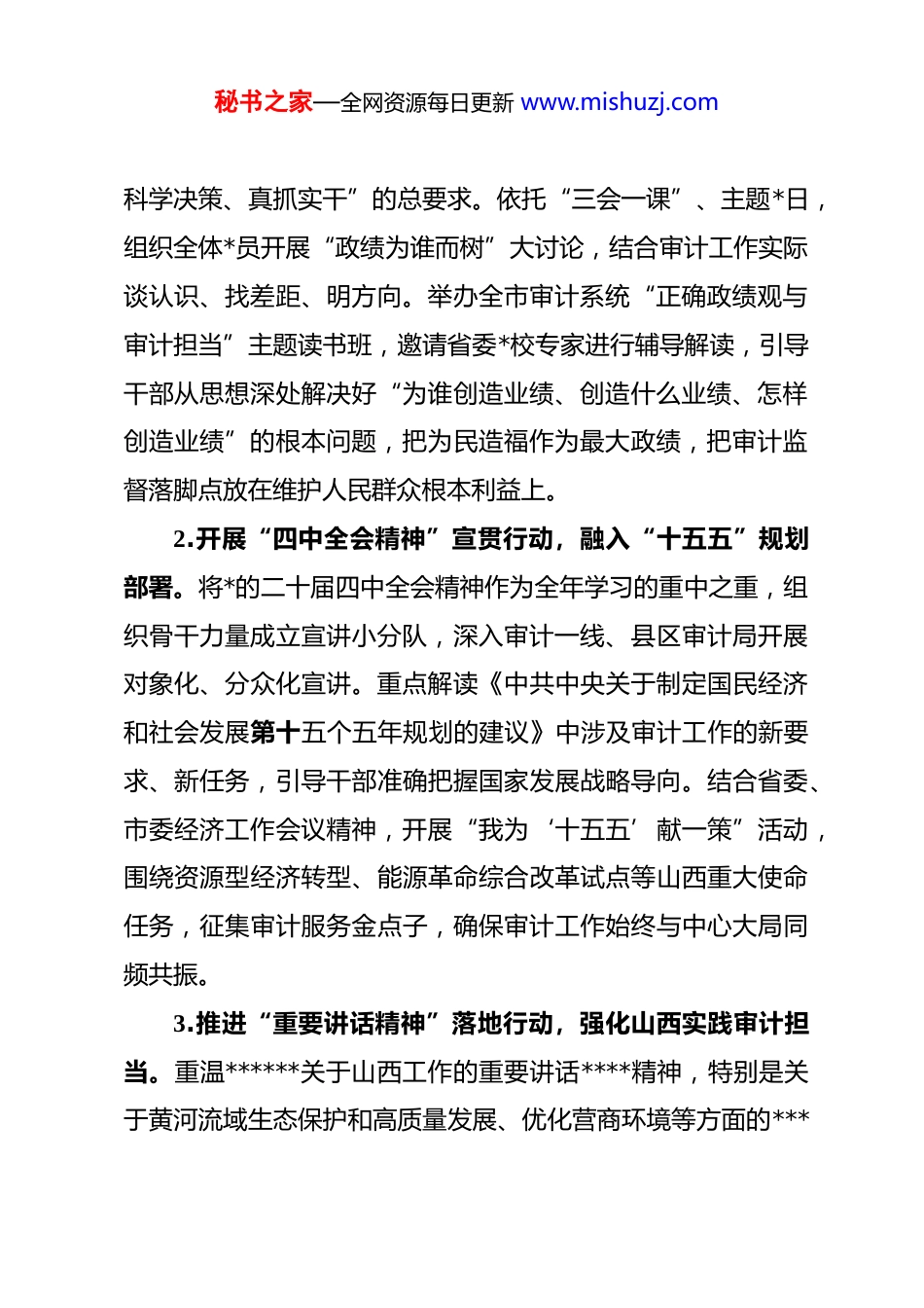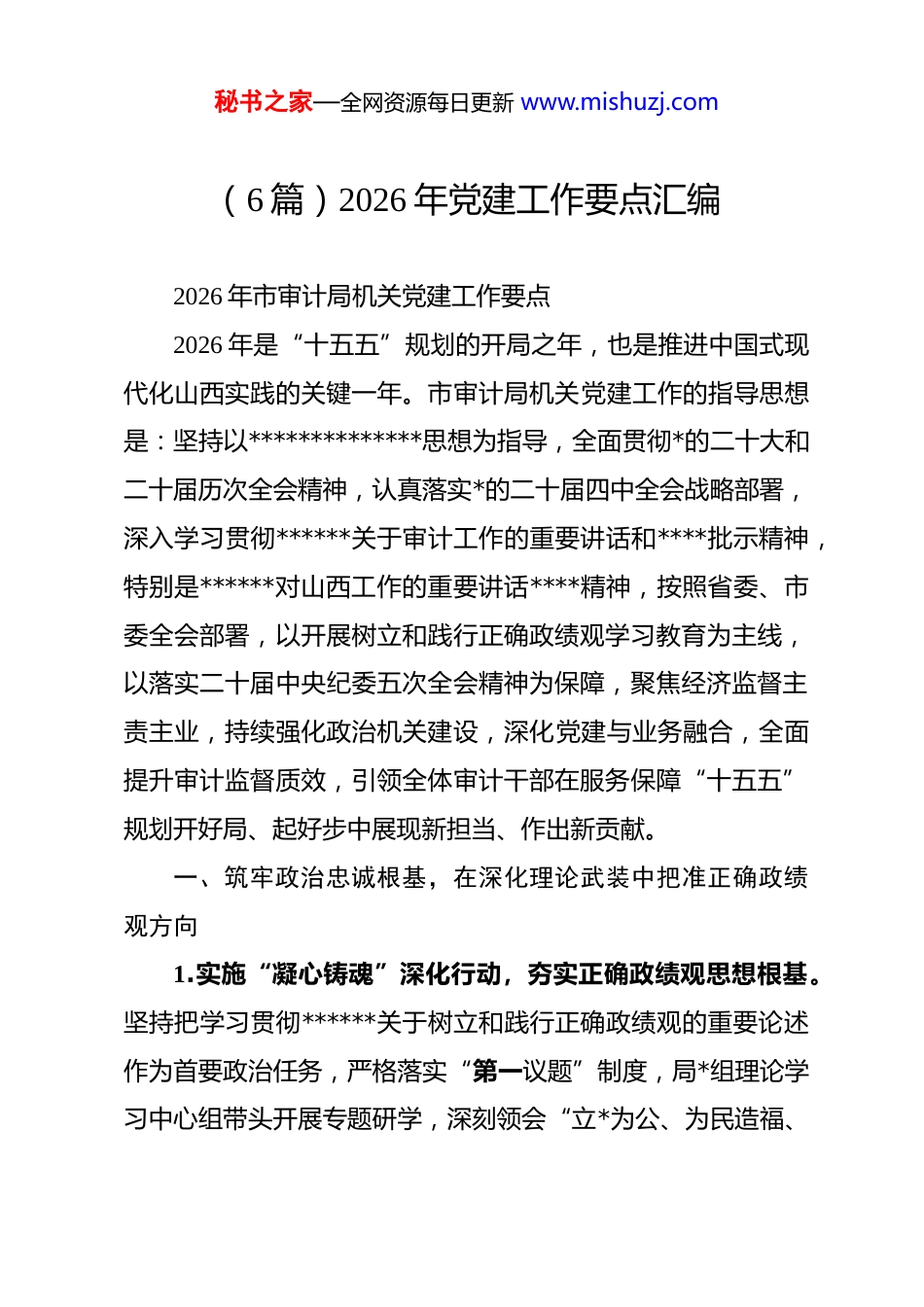 秘书之家—全网资源每日更新 www.mishuzj.com(6 篇)2026 年党建工作要点汇编2026 年市审计局机关党建工作要点2026 年是“十五五”规划的开局之年,也是推进中国式现代化山西实践的关键一年。市审计局机关党建工作的指导思想是:坚持以**************思想为指导,全面贯彻*的二十大和二十届历次全会精神,认真落实*的二十届四中全会战略部署,深入学习贯彻******关于审计工作的重要讲话和****批示精神,特别是******对山西工作的重要讲话****精神,按照省委、市委全会部署,以开展树立和践行正确政绩观学习教育为主线,以落实二十届中央纪委五次全会精神为保障,聚焦经济监督主责主业,持续强化政治机关建设,深化党建与业务融合,全面提升审计监督质效,引领全体审计干部在服务保障“十五五”规划开好局、起好步中展现新担当、作出新贡献。一、筑牢政治忠诚根基,在深化理论武装中把准正确政绩观方向1.实施“凝心铸魂”深化行动,夯实正确政绩观思想根基。坚持把学习贯彻******关于树立和践行正确政绩观的重要论述作为首要政治任务,严格落实“第一议题”制度,局*组理论学习中心组带头开展专题研学,深刻领会“立*为公、为民造福、秘书之家—全网资源每日更新 www.mishuzj.com科学决策、真抓实干”的总要求。依托“三会一课”、主题*日,组织全体*员开展“政绩为谁而树”大讨论,结合审计工作实际谈认识、找差距、明方向。举办全市审计系统“正确政绩观与审计担当”主题读书班,邀请省委*校专家进行辅导解读,引导干部从思想深处解决好“为谁创造业绩、创造什么业绩、怎样创造业绩”的根本问题,把为民造福作为最大政绩,把审计监督落脚点放在维护人民群众根本利益上。2.开展“四中全会精神”宣贯行动,融入“十五五”规划部署。将*的二十届四中全会精神作为全年学习的重中之重,组织骨干力量成立宣讲小分队,深入审计一线、县区审计局开展对象化、分众化宣讲。重点解读《中共中央关于制定国民经济和社会发展第十五个五年规划的建议》中涉及审计工作的新要求、新任务,引导干部准确把握国家发展战略导向。结合省委、市委经济工作会议精神,开展“我为‘十五五’献一策”活动,围绕资源型经济转型、能源革命综合改革试点等山西重大使命任务,征集审计服务金点子,确保审计工作始终与中心大局同频共振。3.推进“重要讲话精神”落地行动,强化山西实践审计担当。重温******关于山西工作的重要讲话****精神,特别是关于黄河流域生态保护和高质量发展、优化营商环境等方面的***秘书之家—全网资源每日更新 www.mishuzj.com*,建立学习贯彻台账。开展“沿着领袖足迹学思想”现场教学活动,组织*员干部赴考察点实地感悟,激发干事创业热情。将讲话精神转化为具体审计举措,在项目计划制定中优先安排转型发展、文物保护、生态环保等重点领域审计项目,用审计实践检验学习成效,确保*中央及省委重大决策部署在审计环节不折不扣落实。4.抓实“二十届中央纪委五次全会”精神学习行动,筑牢廉洁从审防线。局*组带头学习领会******关于*的自我革命的重要思想,深刻把握全会对反腐败斗争的形势判断和战略部署。组织全局干部观看警示教育片,通报审计系统违纪违法典型案例,用身边事教育身边人。开展“纪律教育月”活动,逐条学习新修订的纪律处分条例,围绕审计“四严禁”工作要求和“八不准”工作纪律进行对照检查,引导干部知敬畏、存戒惧、守底线,将全面从严治*要求内化于心、外化于行。二、聚焦学习教育主线,在查改贯通中淬炼求真务实优良作风5.精心组织动员部署,压实政绩观学习教育主体责任。春节假期后第一时间召开全局树立和践行正确政绩观学习教育动员大会,制定印发实施方案,成立由局*组书记任组长的学习教育领导小组。明确*组主体责任、书记第一责任人责任和班子成秘书之家—全网资源每日更新 www.mishuzj.com员“一岗双责”,建立局领导联系点制度,每人包联 1-2 个县区审计局和 2-3 个业务科室,全程指导、定期调度。把学习教育开展情况纳入年度党建考核和*支部书记述职评议内容,形成一级抓一级、层层抓落实的责任链条,确保学习教育于 7 月底前取得扎实成效。...